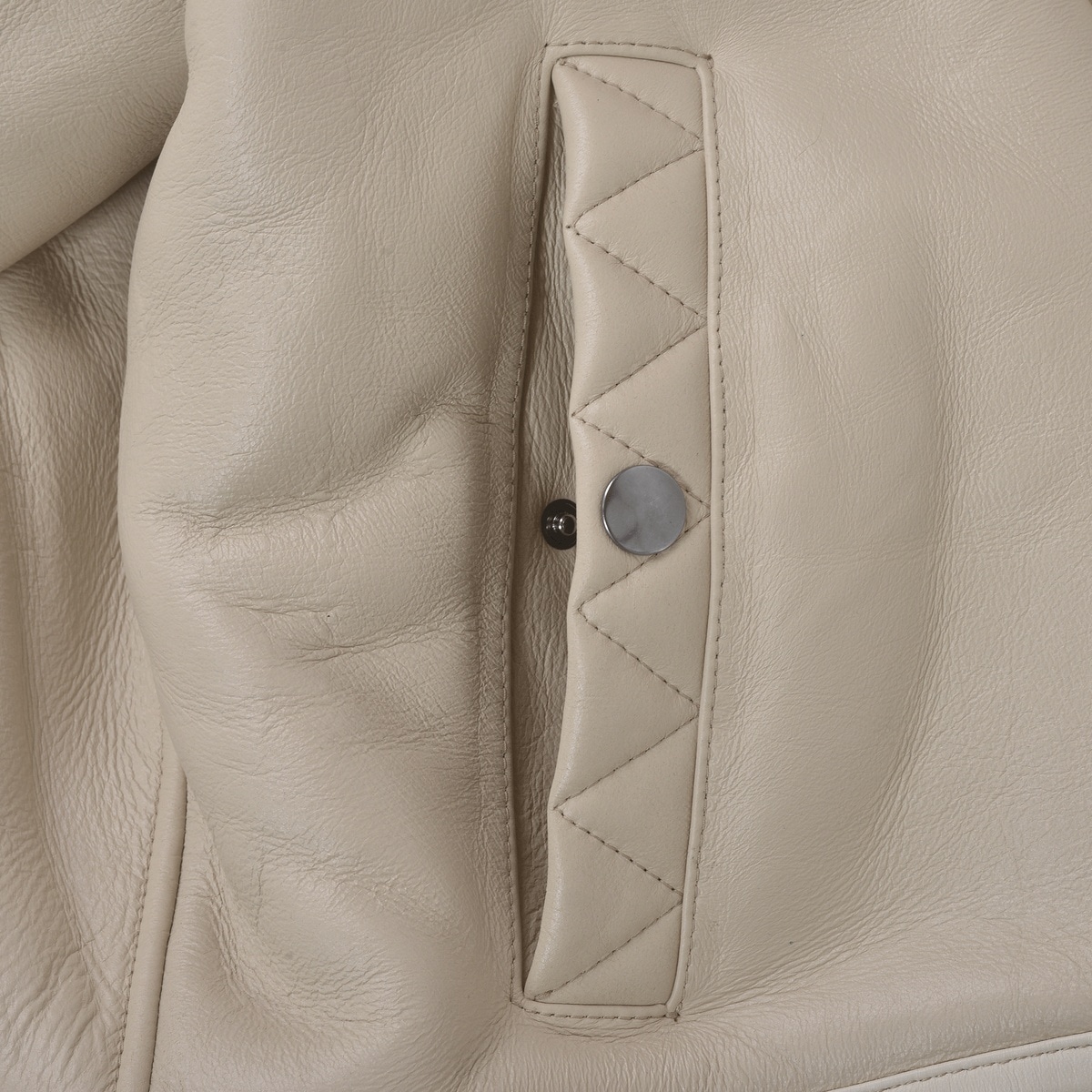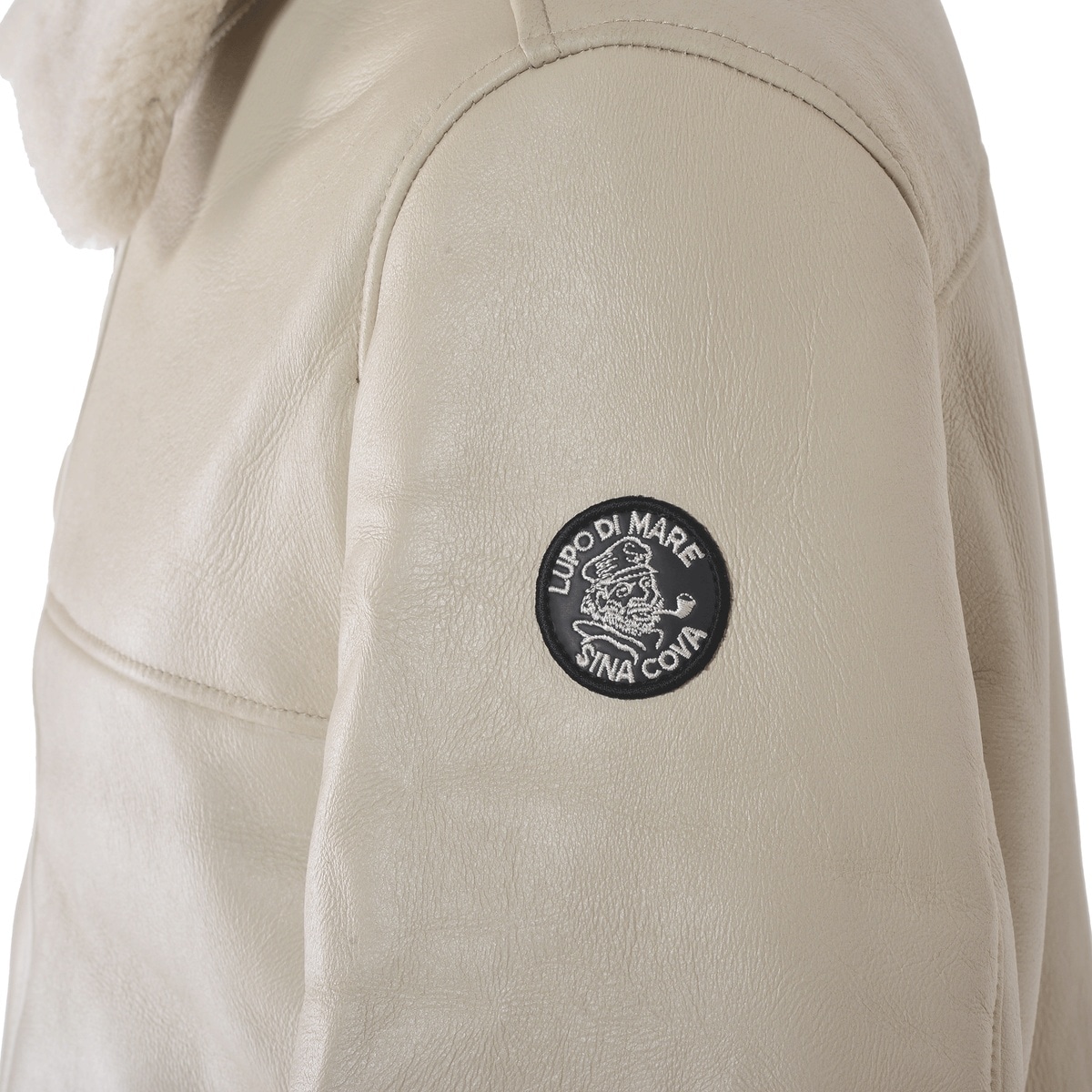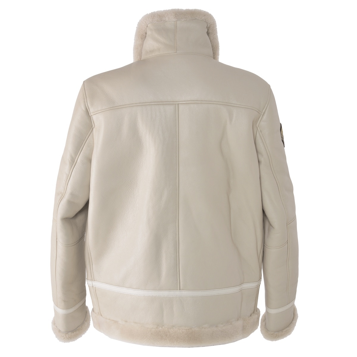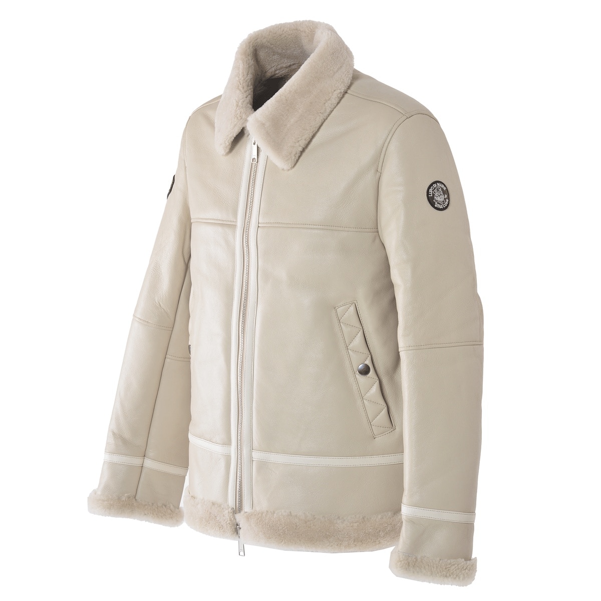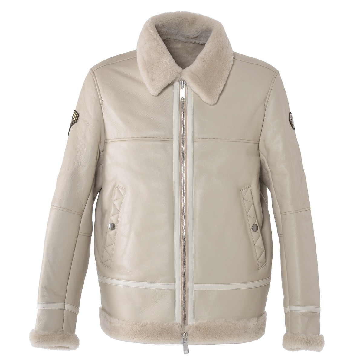 右袖にエンブレムワッペン、ポケットにジグザグステッチをデザインしたムートンレザーフライトジャケットです。