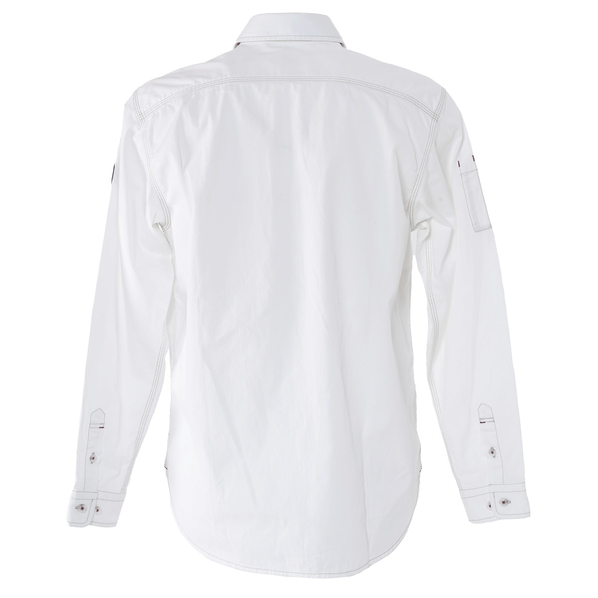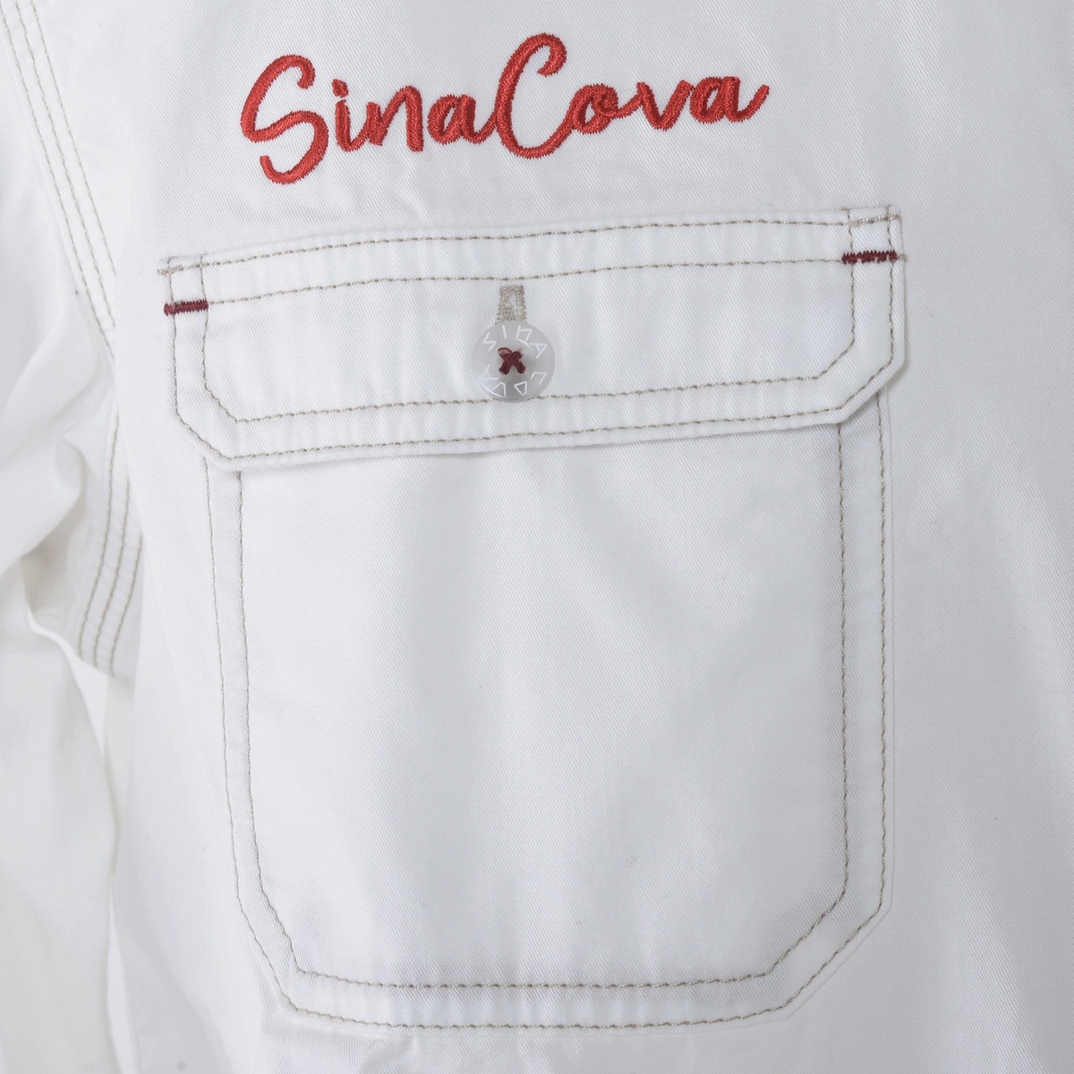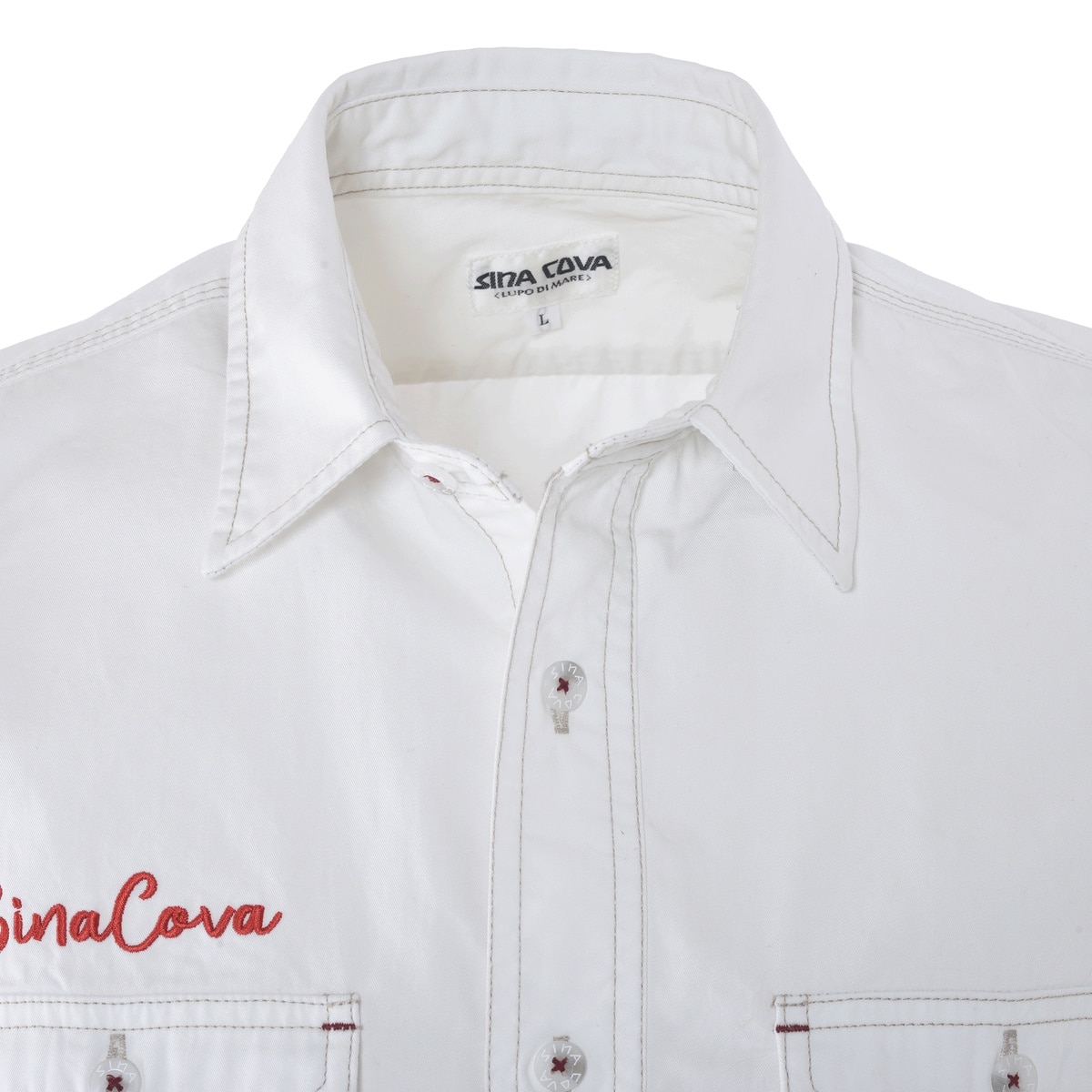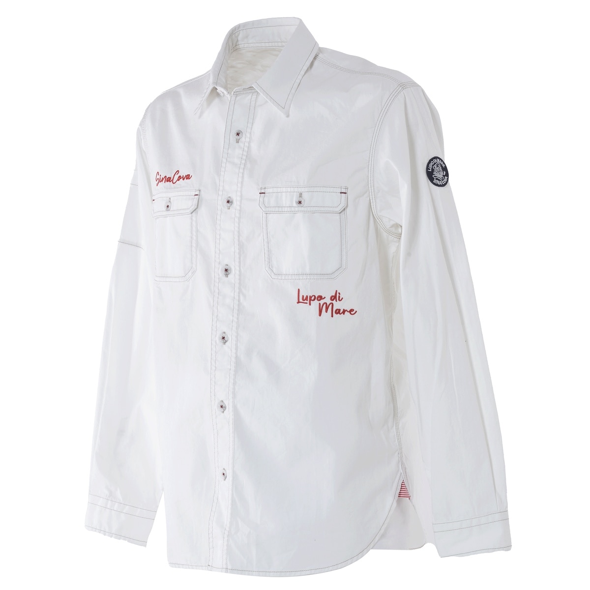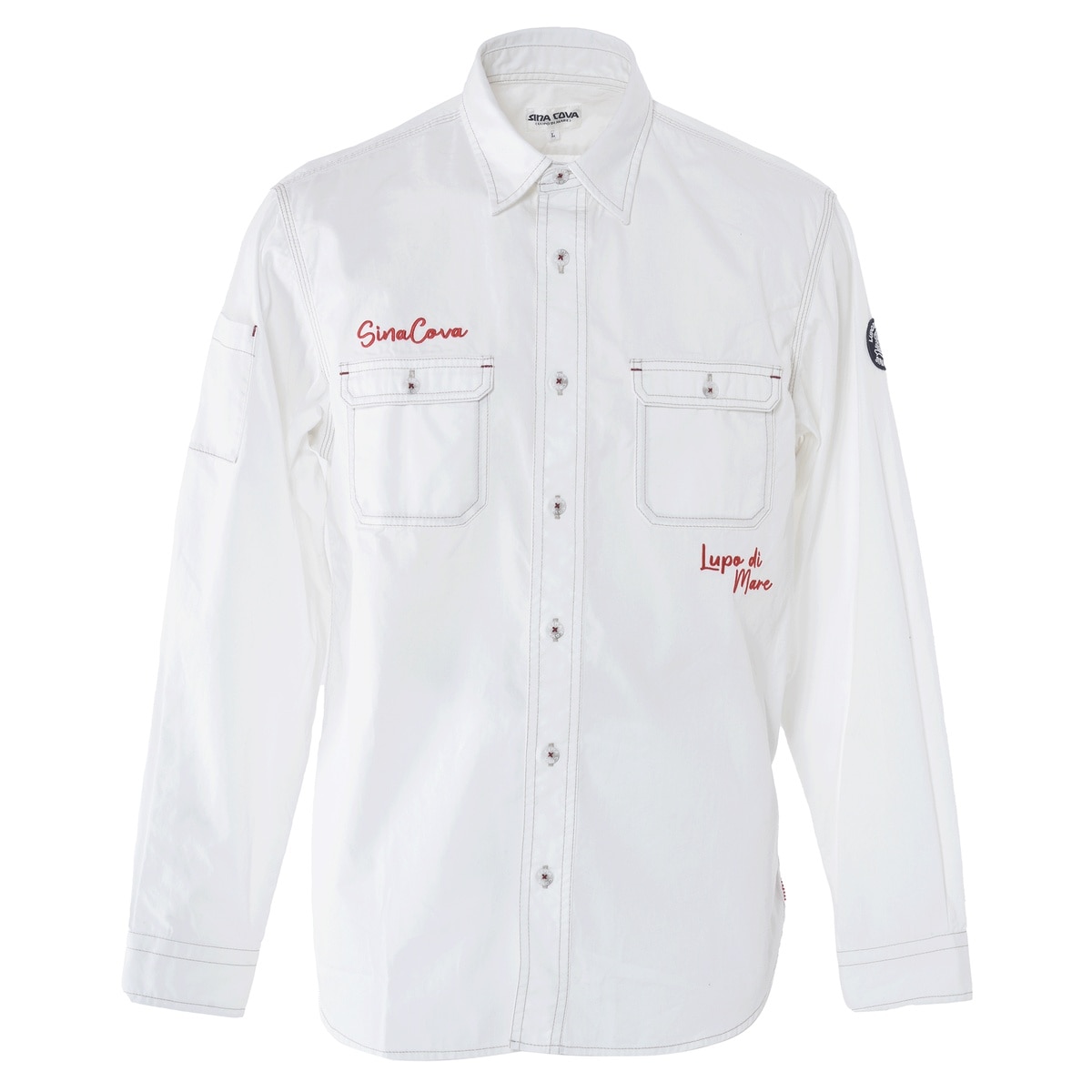 フロントに2つのポケットがあり周辺にSINA COVA ,LUPO DI MARE(イタリア語:海の狼=パイプをくわえた船長)の刺繍をデザインしたワークシャツです。生地に上品な光沢と高級感のあり丈夫なツイル生地を使用ししており、秋や春には羽織、冬にはインナーとしてロングシーズンでご利用いただけます。・ワークシャツ特有のトリプルステッチとガゼット部分にはレッドのストライプ生地使用・フラップ付きポケット2個・丈夫な生地・オールシーズン使用可能