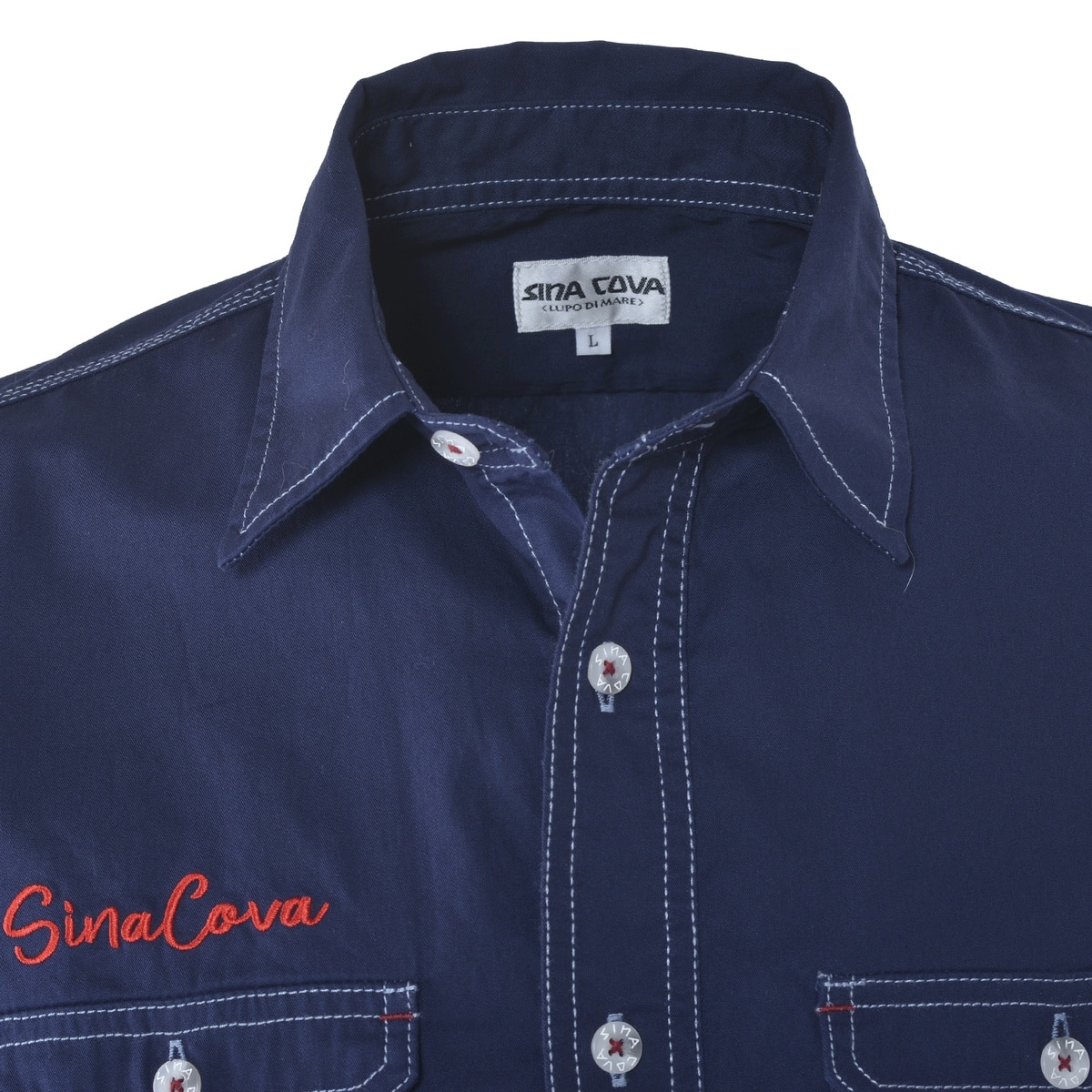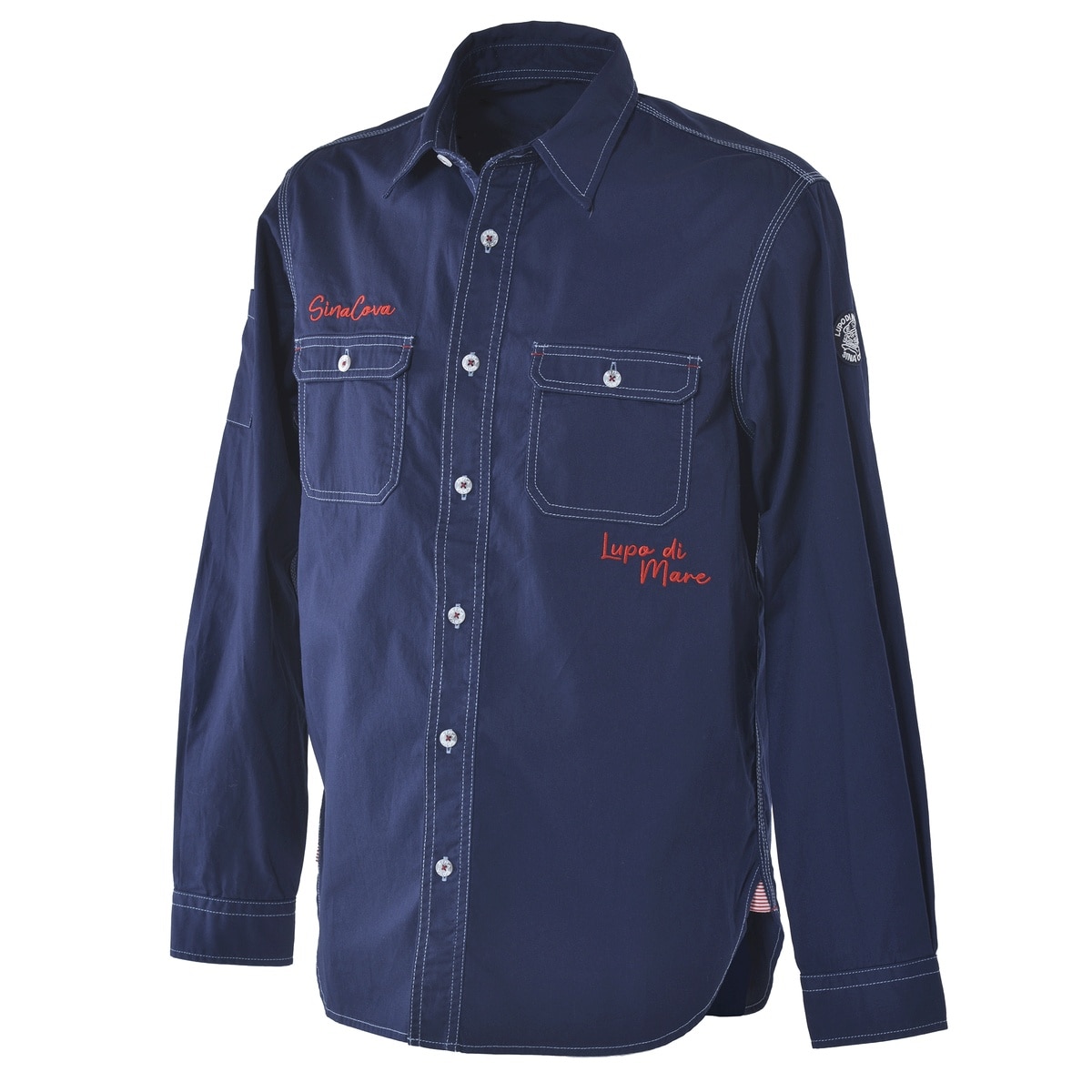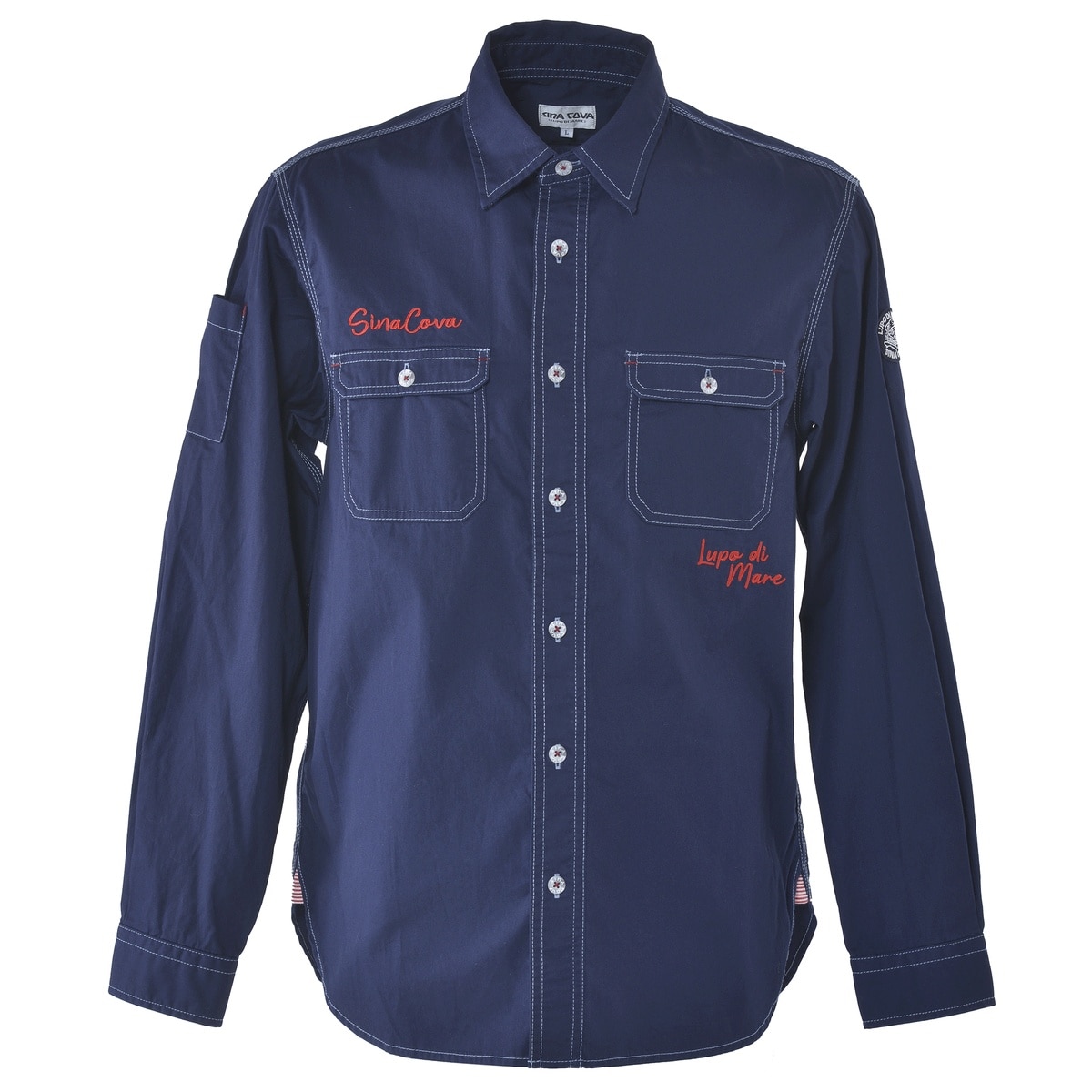 フロントに2つのポケットがあり周辺にSINA COVA ,LUPO DI MARE(イタリア語:海の狼=パイプをくわえた船長)の刺繍をデザインしたワークシャツです。生地に上品な光沢と高級感のあり丈夫なツイル生地を使用ししており、秋や春には羽織、冬にはインナーとしてロングシーズンでご利用いただけます。・ワークシャツ特有のトリプルステッチとガゼット部分にはレッドのストライプ生地使用・フラップ付きポケット2個・丈夫な生地・オールシーズン使用可能