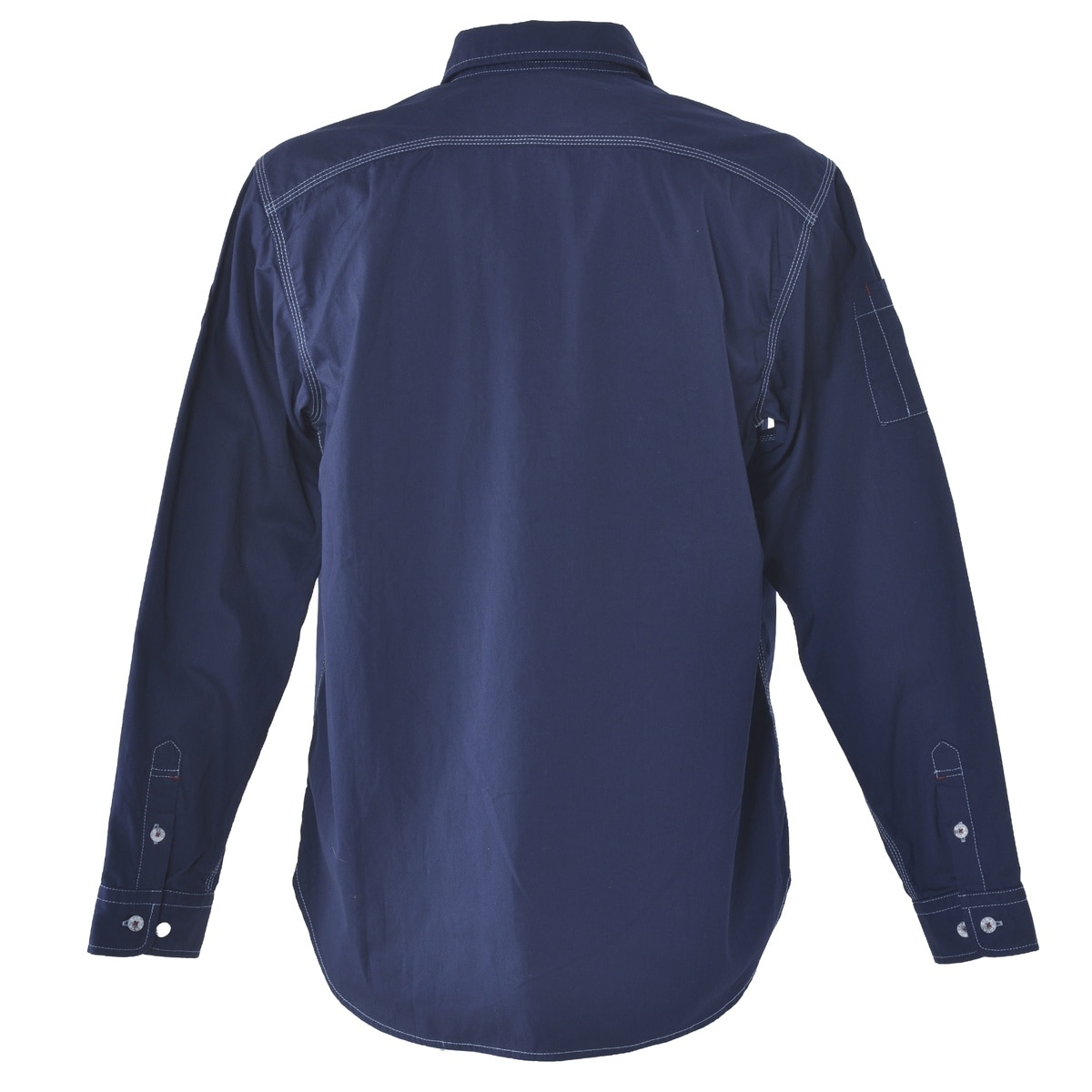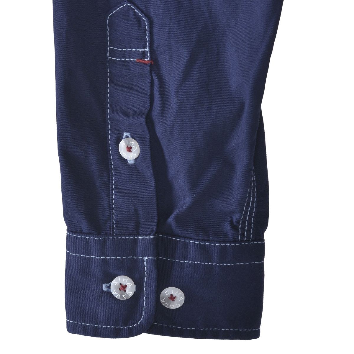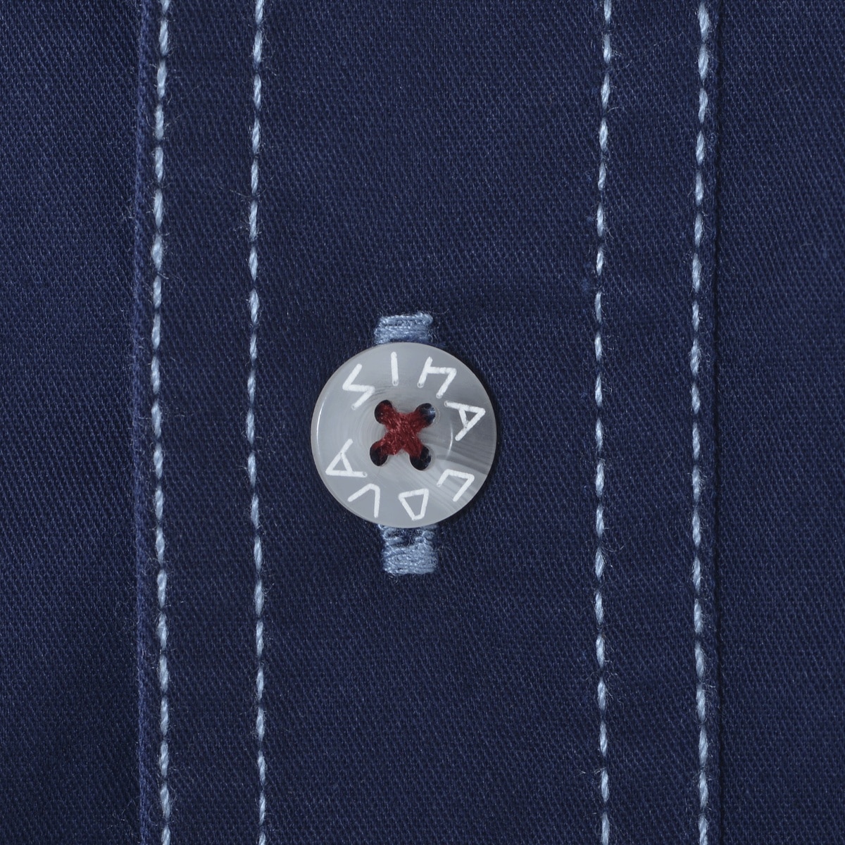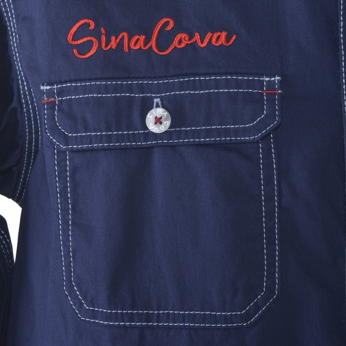 フロントに2つのポケットがあり周辺にSINA COVA ,LUPO DI MARE(イタリア語:海の狼=パイプをくわえた船長)の刺繍をデザインしたワークシャツです。生地に上品な光沢と高級感のあり丈夫なツイル生地を使用ししており、秋や春には羽織、冬にはインナーとしてロングシーズンでご利用いただけます。・ワークシャツ特有のトリプルステッチとガゼット部分にはレッドのストライプ生地使用・フラップ付きポケット2個・丈夫な生地・オールシーズン使用可能