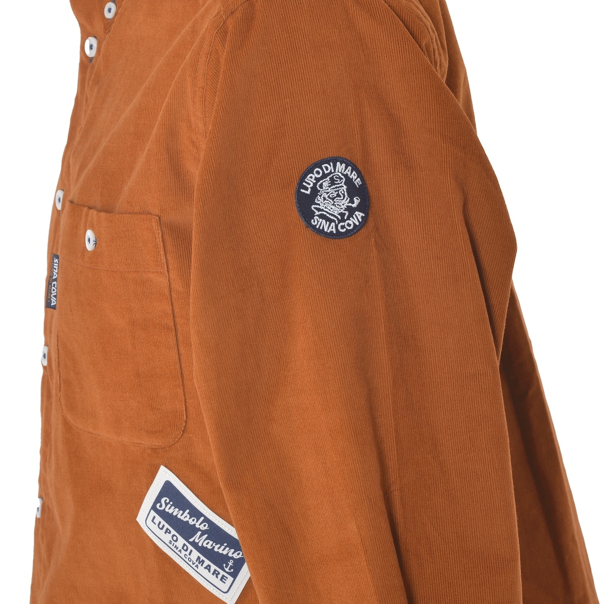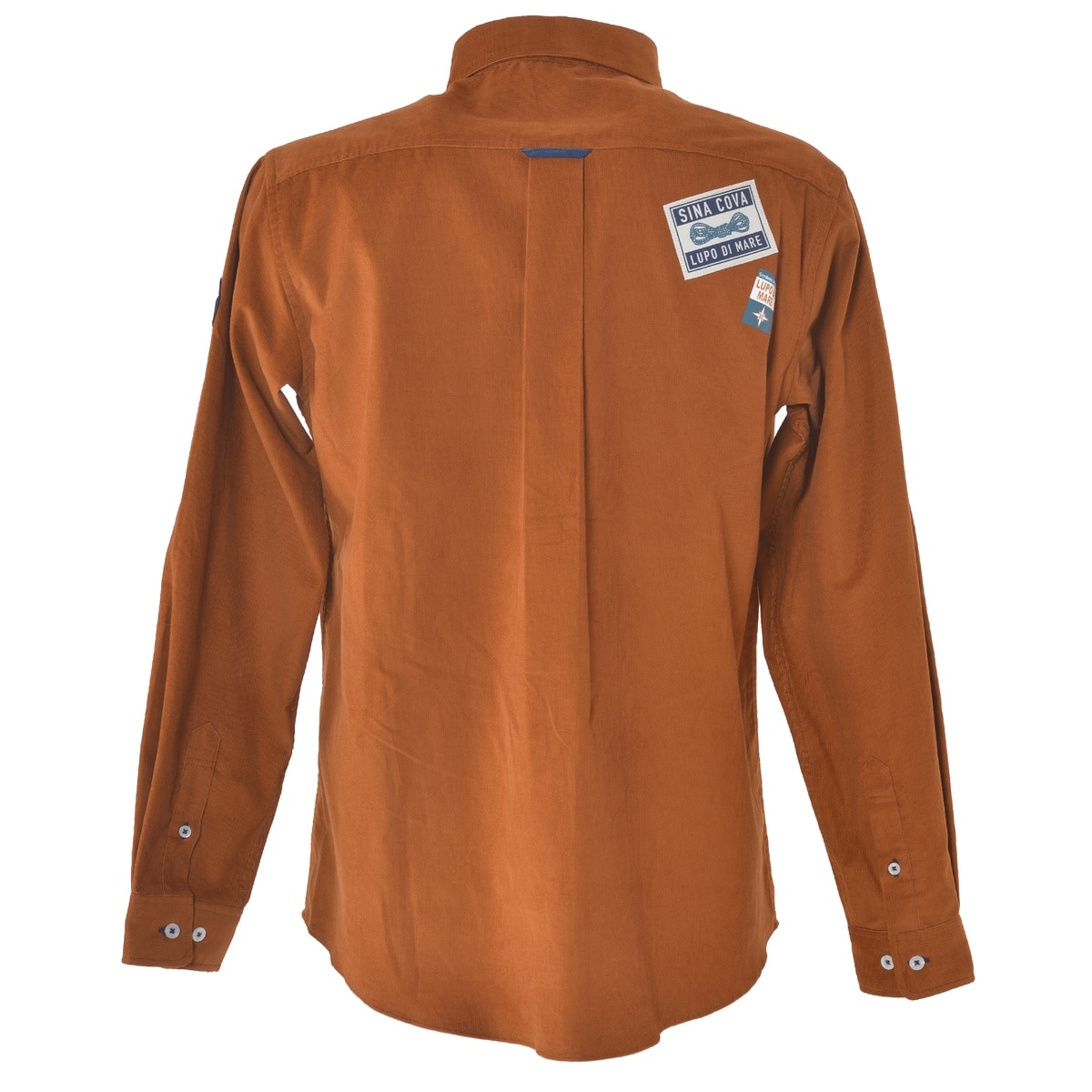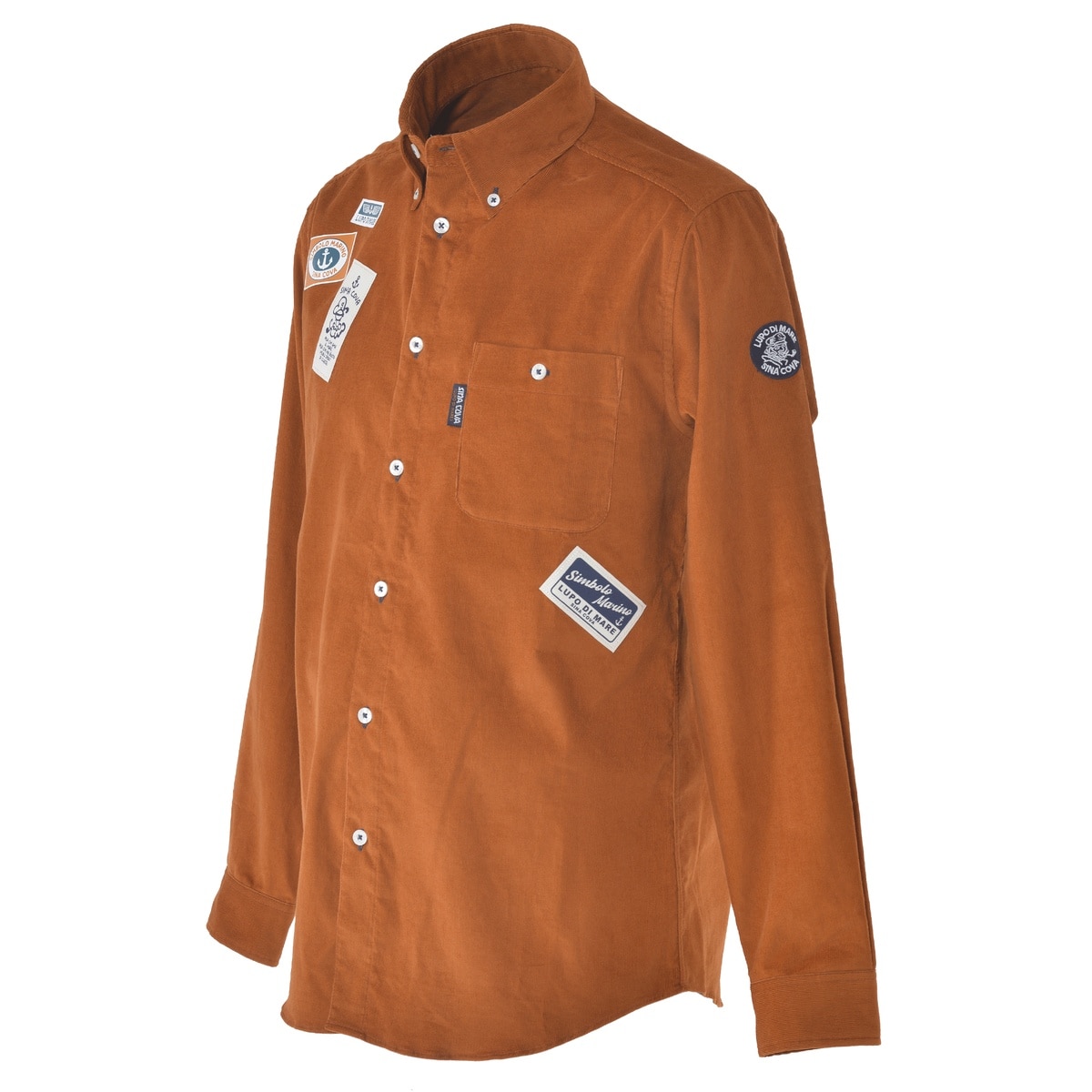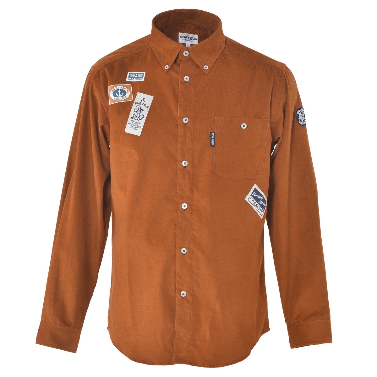 前後にネームモチーフのワッペンとプリントをデザインしたコーデュロイ長袖ボタンダウンシャツです。