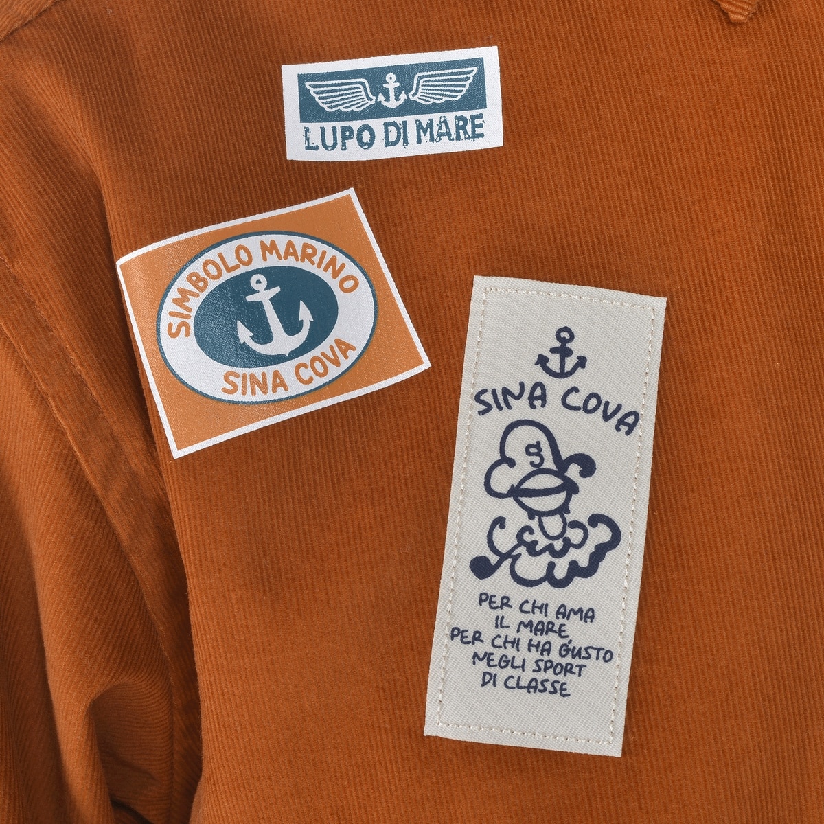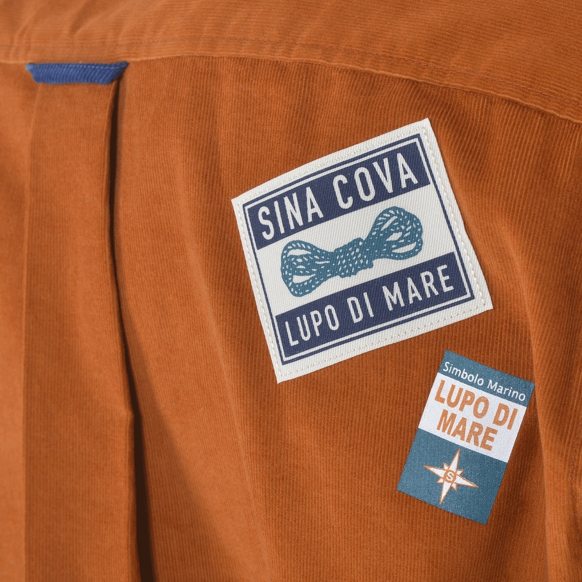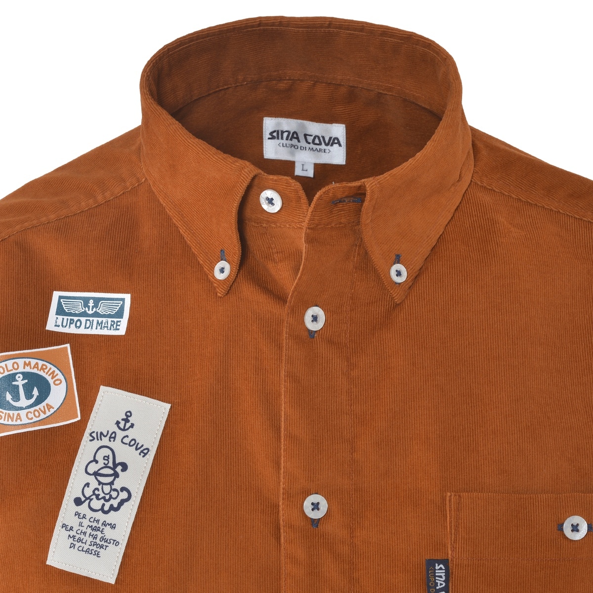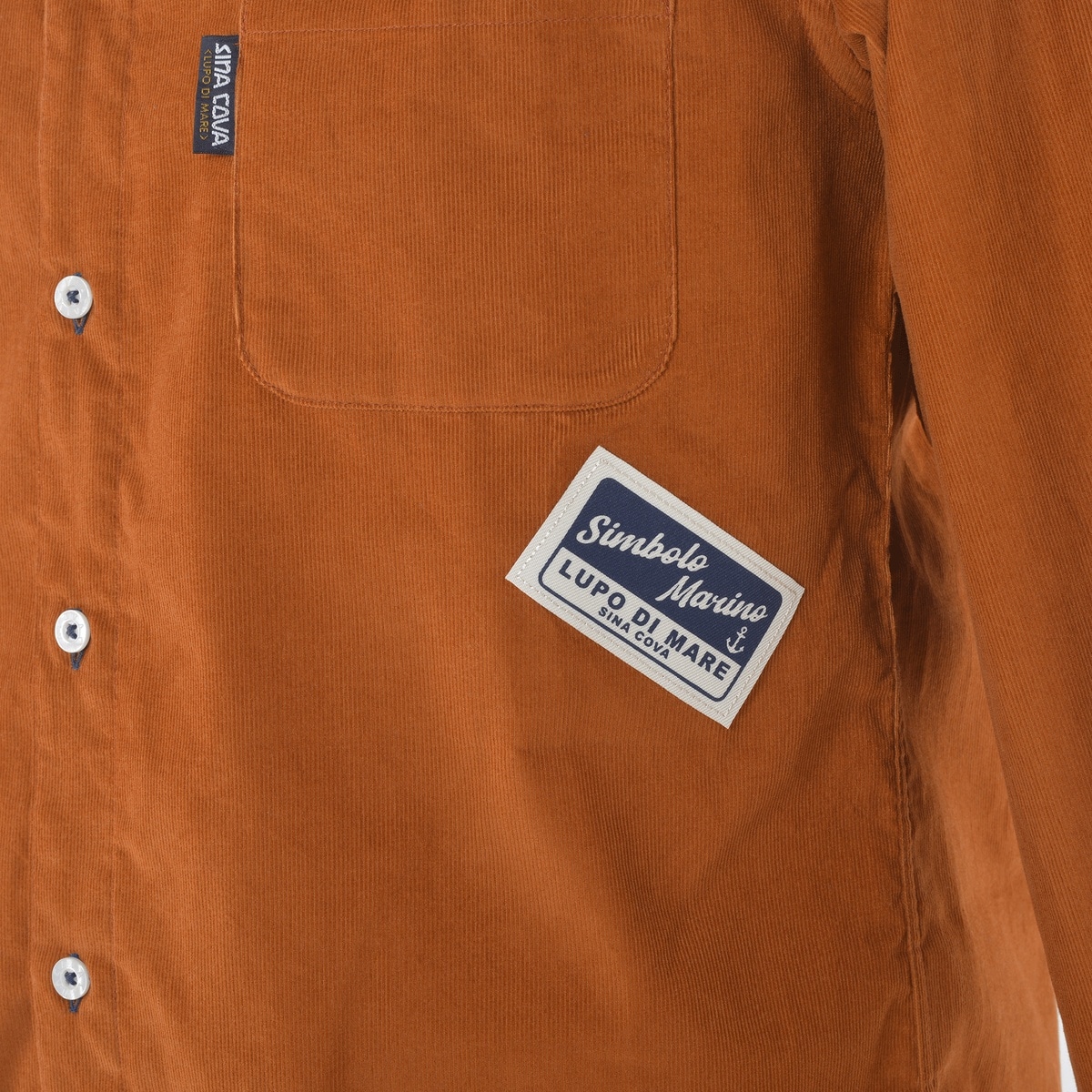 前後にネームモチーフのワッペンとプリントをデザインしたコーデュロイ長袖ボタンダウンシャツです。