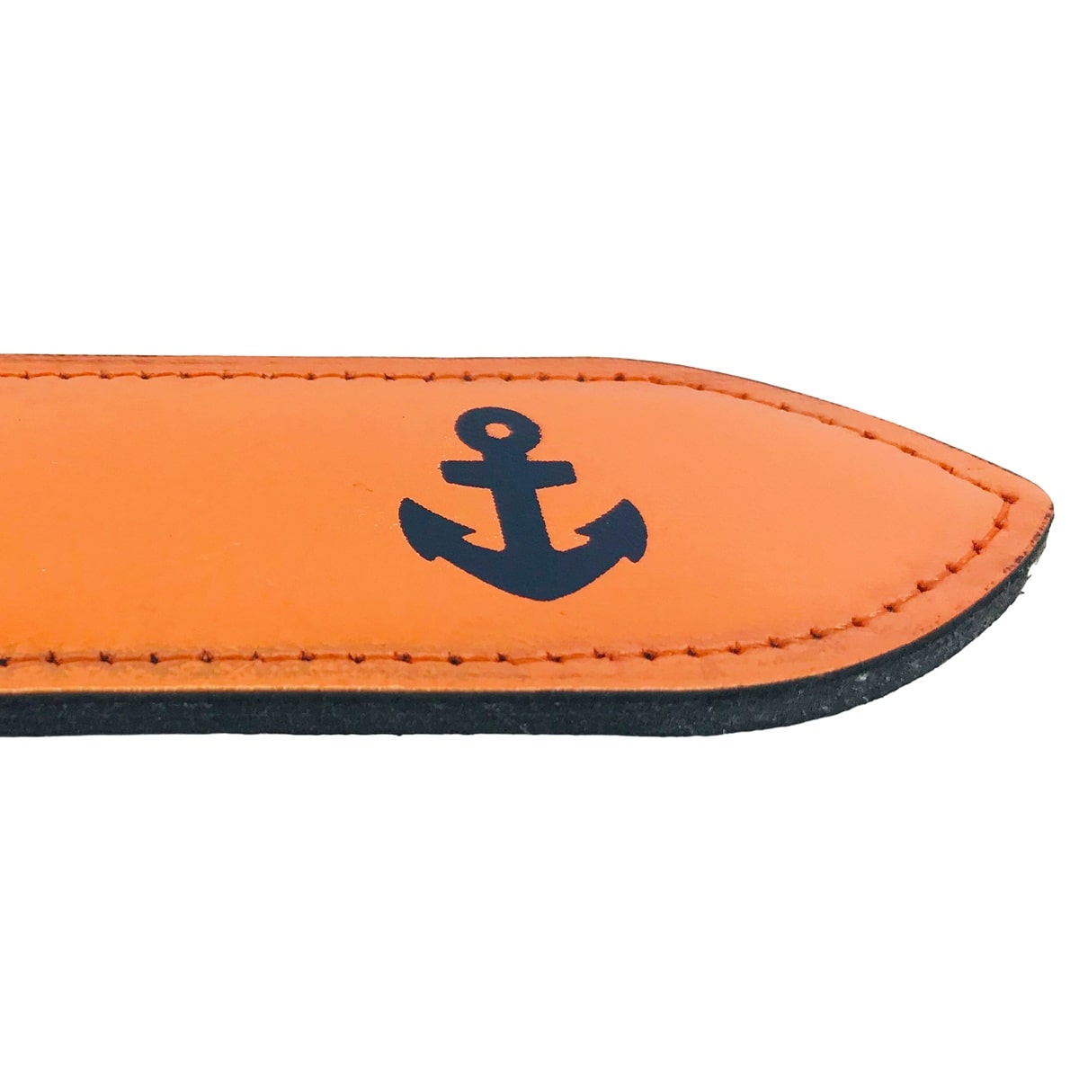 テープと牛革を使用しどのようなパンツスタイルにも合わせやすいく細部のパーツにもシナコバのオリジナリティー出しています。剣先部分部分のイカリマークがポイントです。