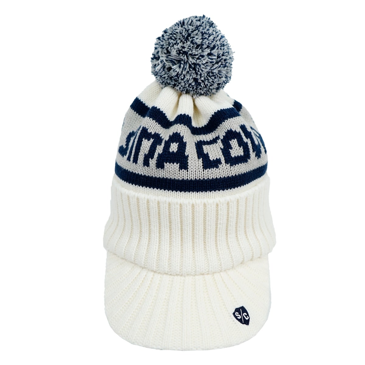 ブリム部分にエンブレム刺繍が入り、ロゴのジャガードが入ったツバ付きニットキャップ。