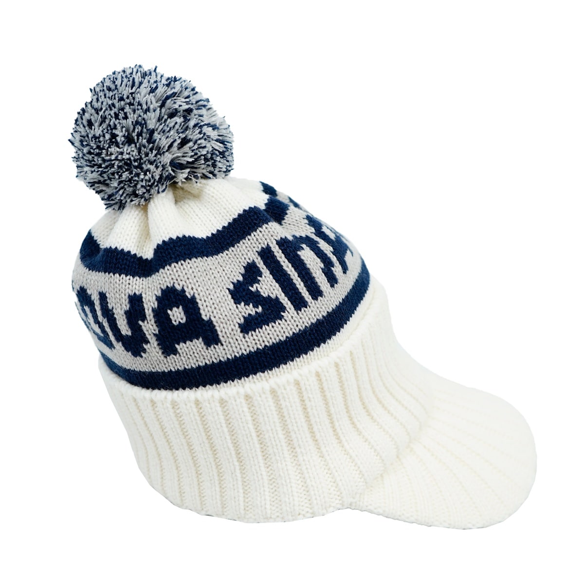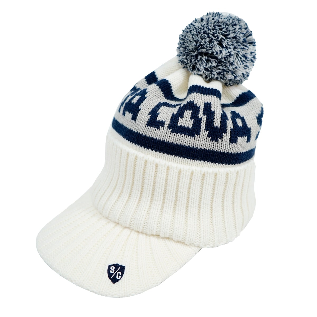 「SINA COVA」ロゴとツバ部分にエンブレムロゴをジャガード編みでデザインした