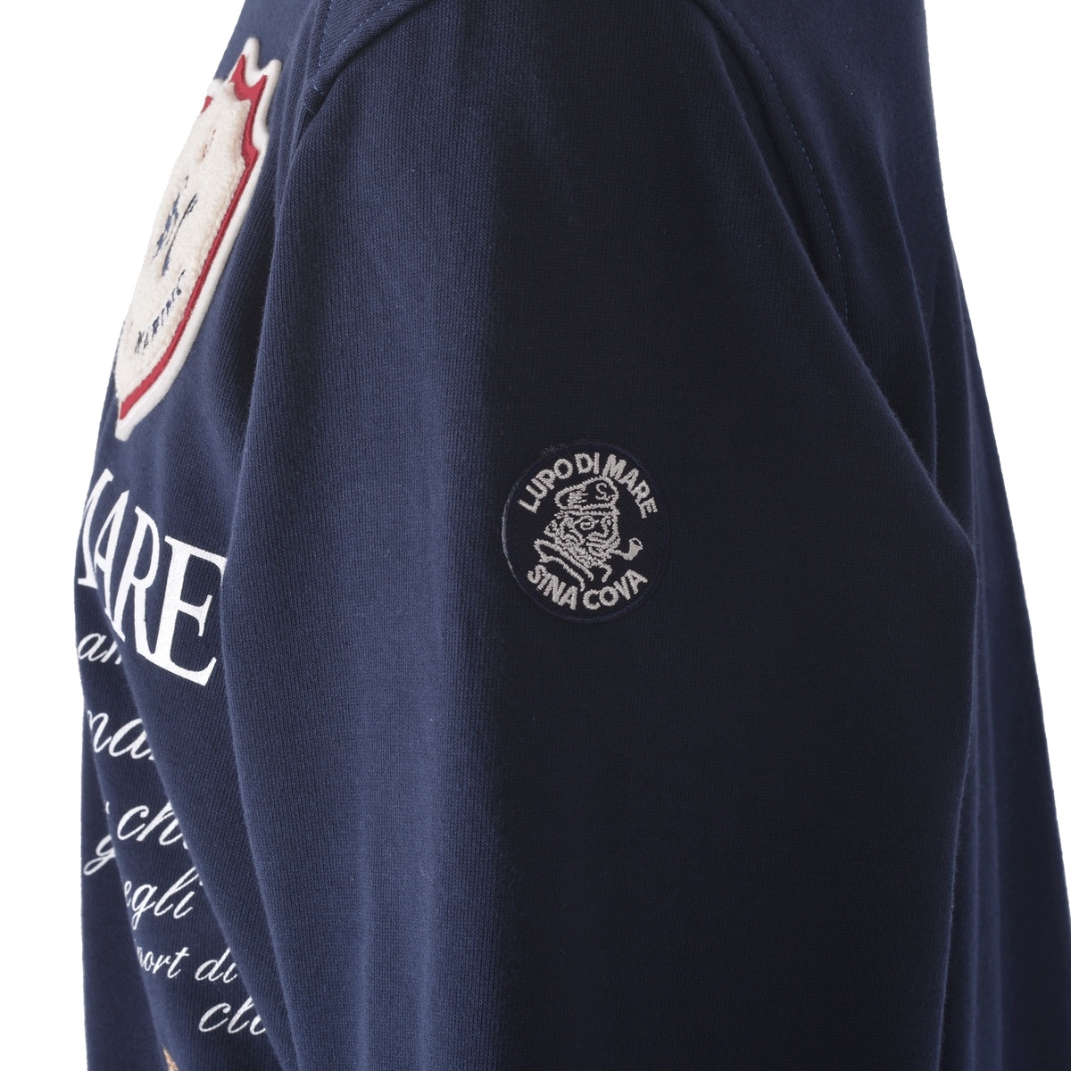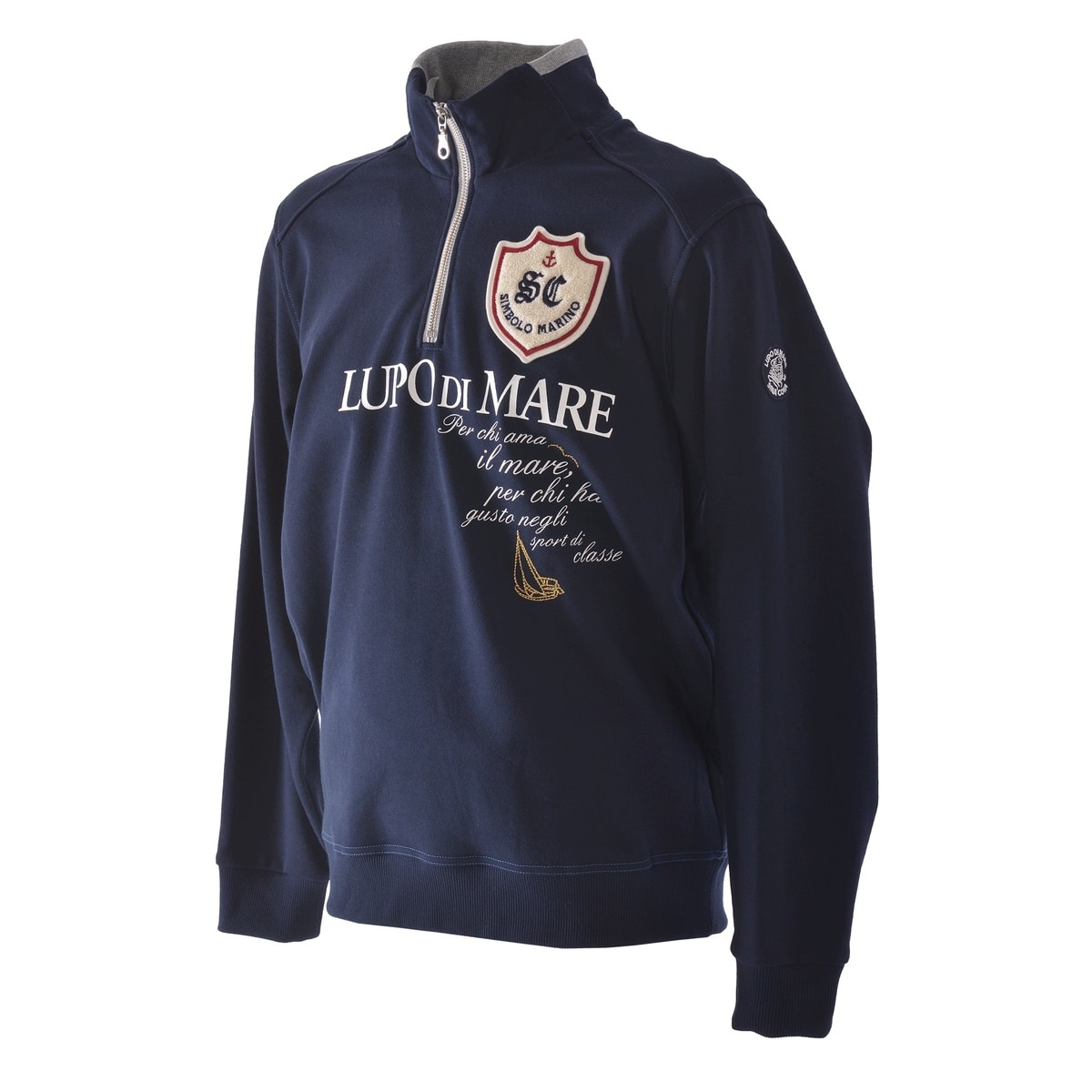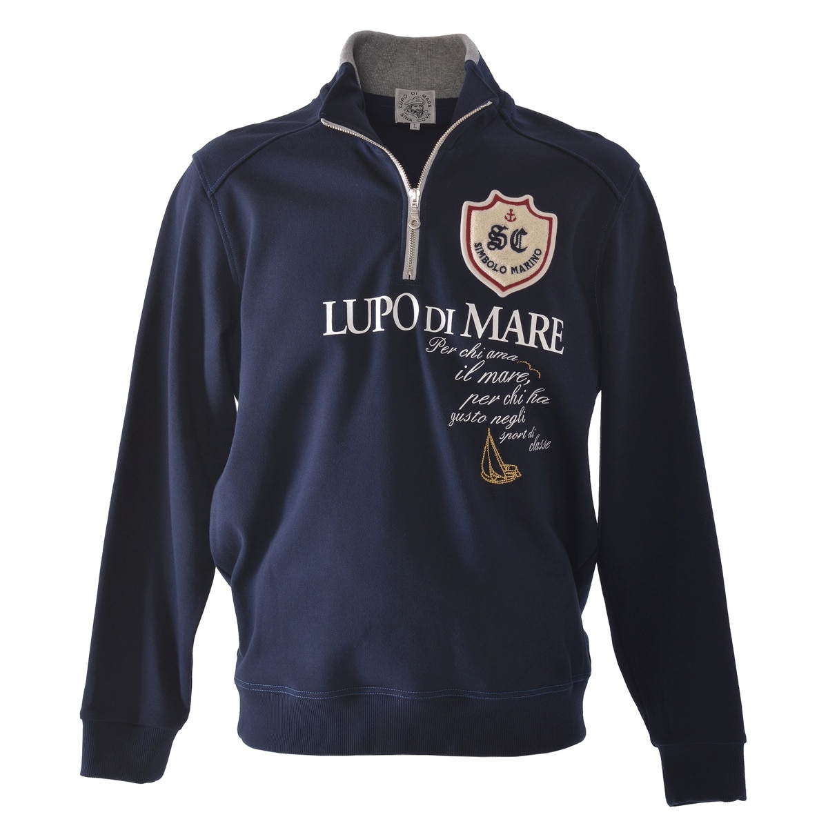 フロントに「SC」エンブレムモチーフのサガラ刺?ワッペンと「LUPO DI MARE」メッセージ文字をプリントでデザインしたハーフジッププルオーバーです。
