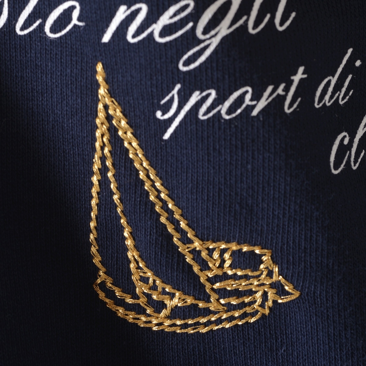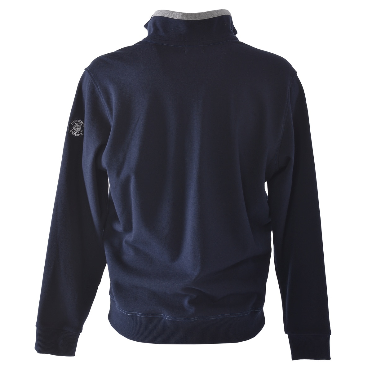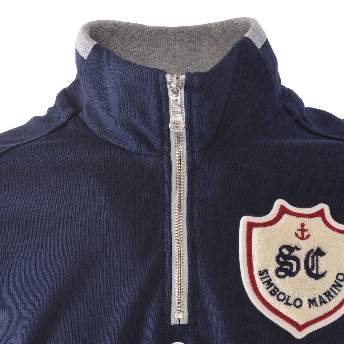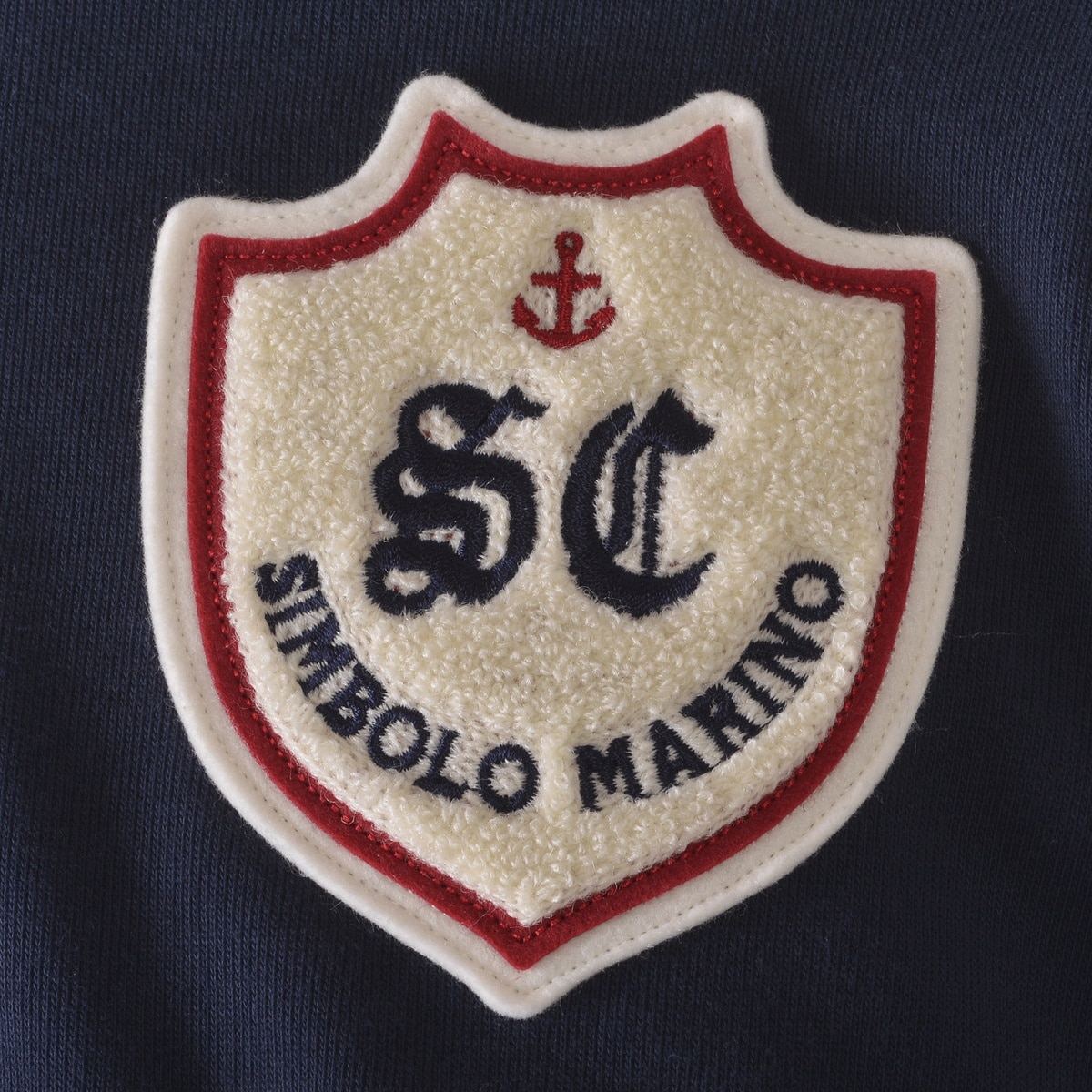 フロントに「SC」エンブレムモチーフのサガラ刺?ワッペンと「LUPO DI MARE」メッセージ文字をプリントでデザインしたハーフジッププルオーバーです。
