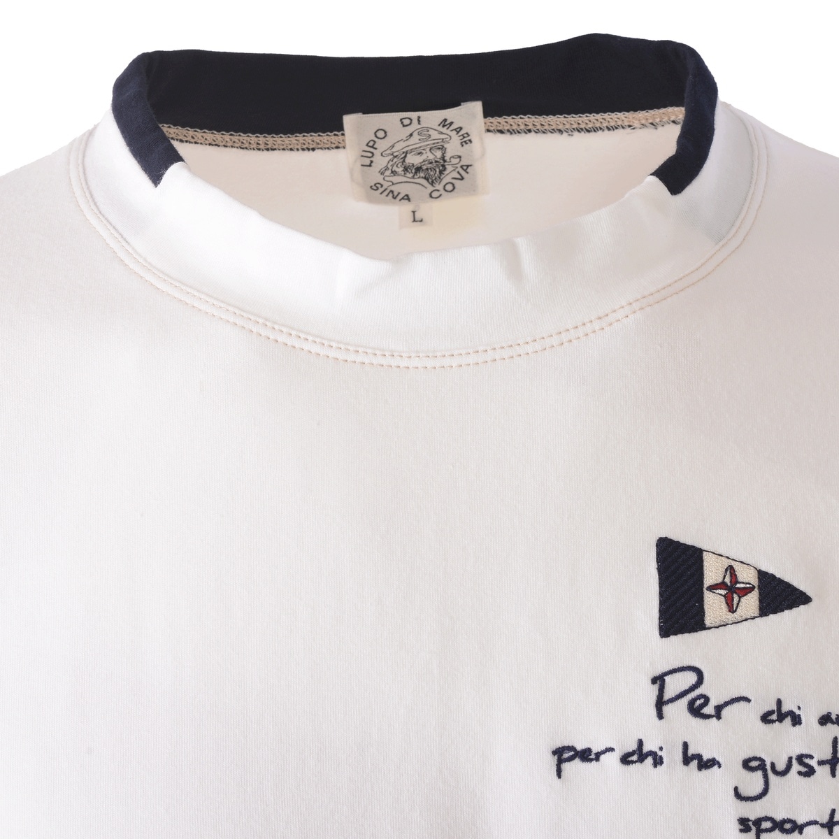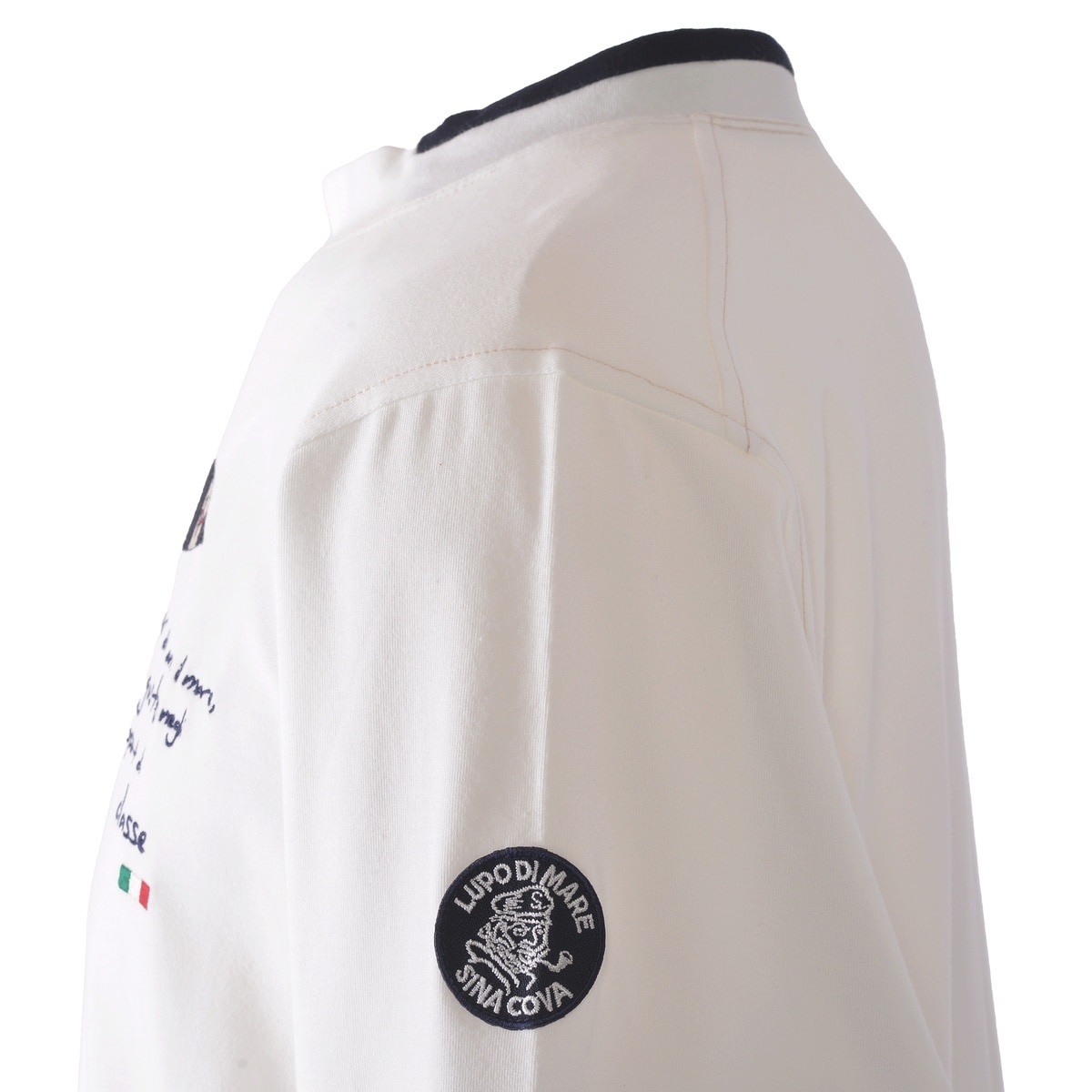 オーガニックコットン(農薬や化学肥料を使わない農地で育て上げた綿)を使用した素材を使い、ややスタンドネックの衿を切替の配色でデザインしたTシャツです。肌に優しいオーガニックコットンとややストレッチがある素材のため、着脱にもストレスフリーの感覚で着用していただけます。また、左胸にフラッグとメッセージ系の文字の刺繍を入れています。