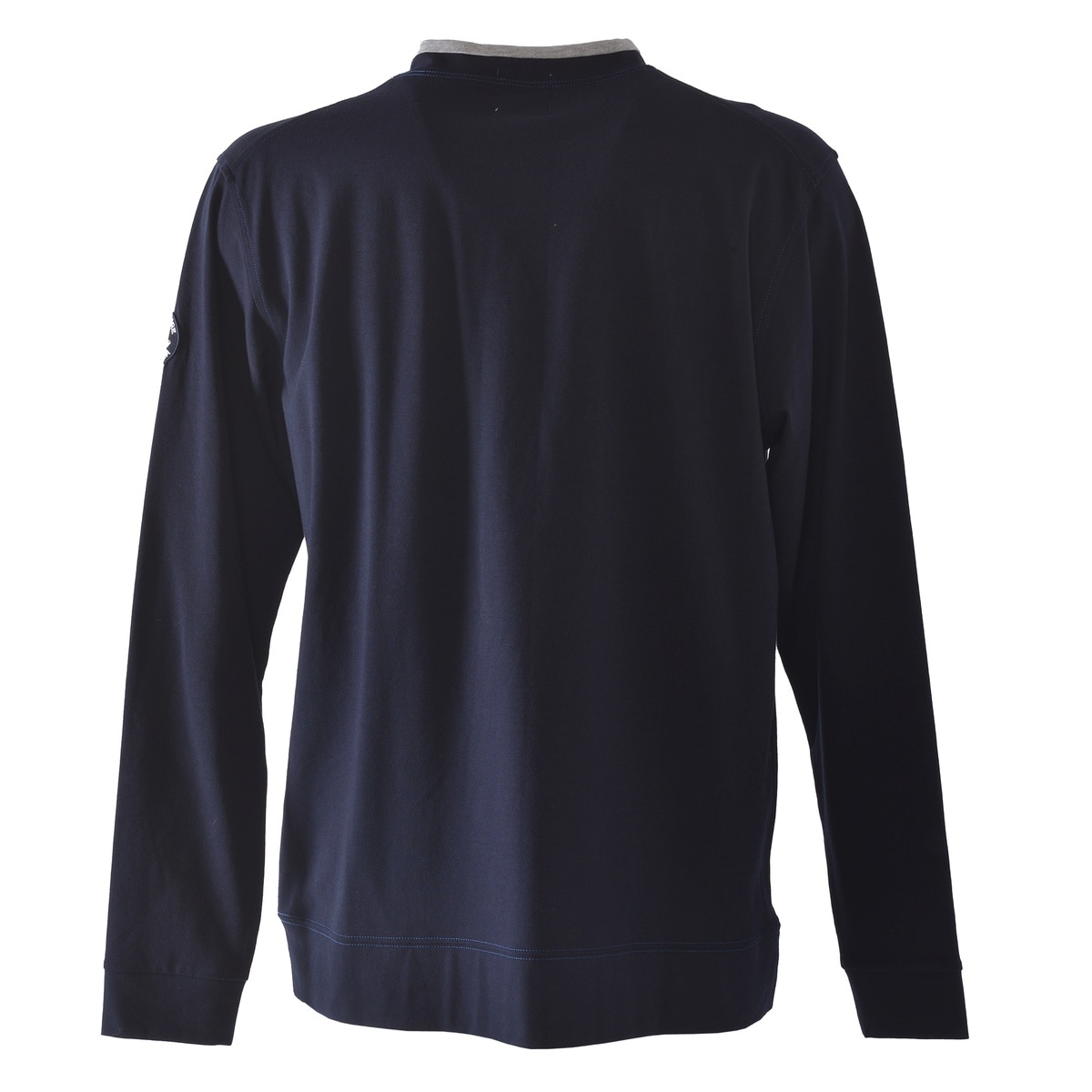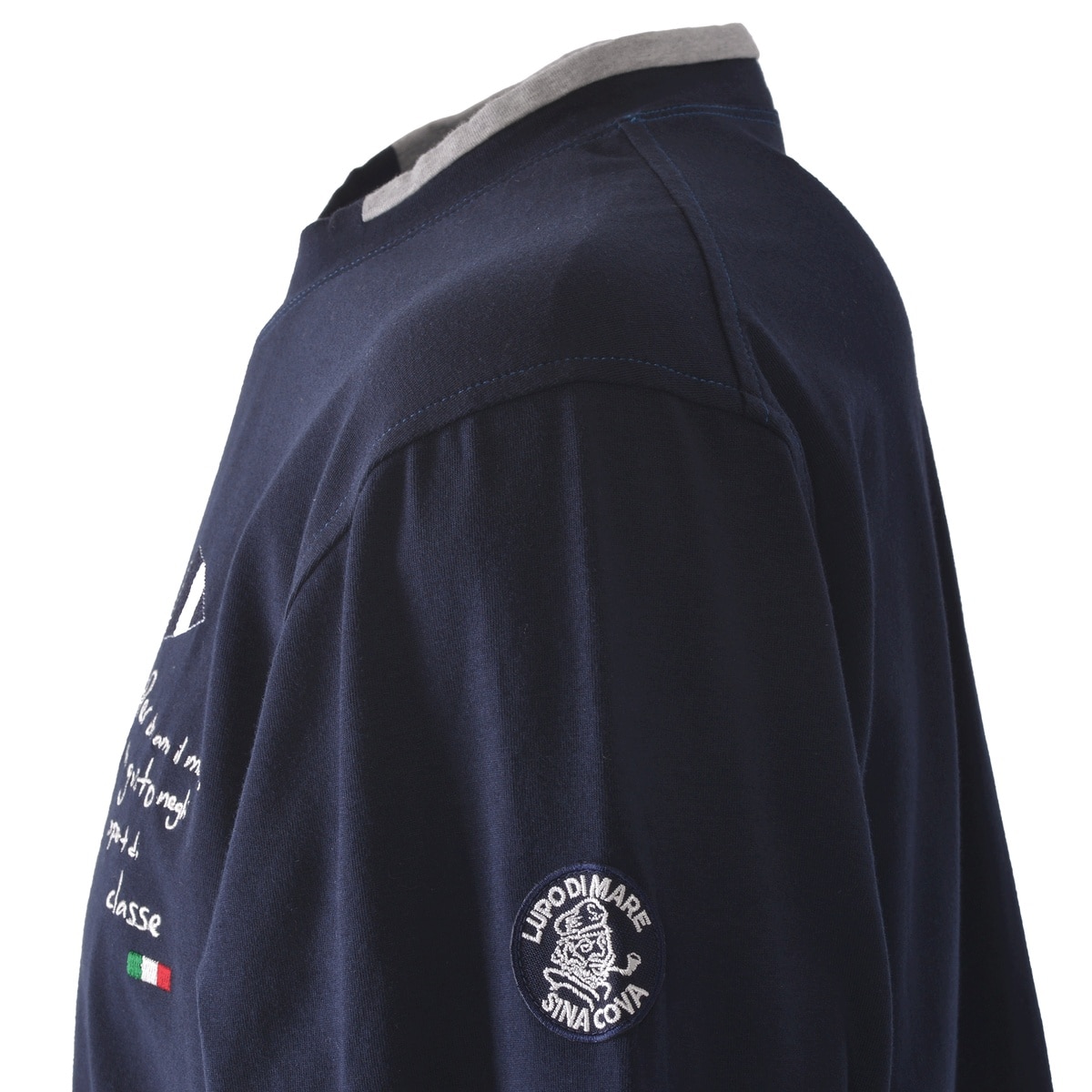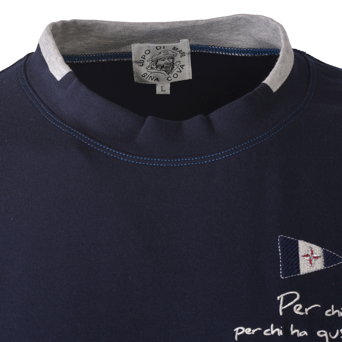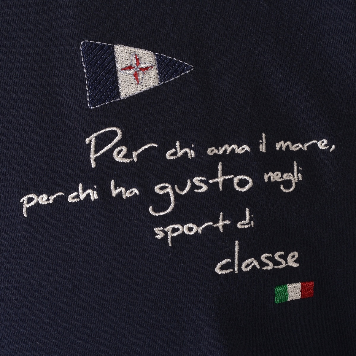 フロントにフラグと「per chi ama il mare , per chi ha gusto naegli sport di class 」の文字刺繍をデザインしたモックネック長袖Tシャツです。