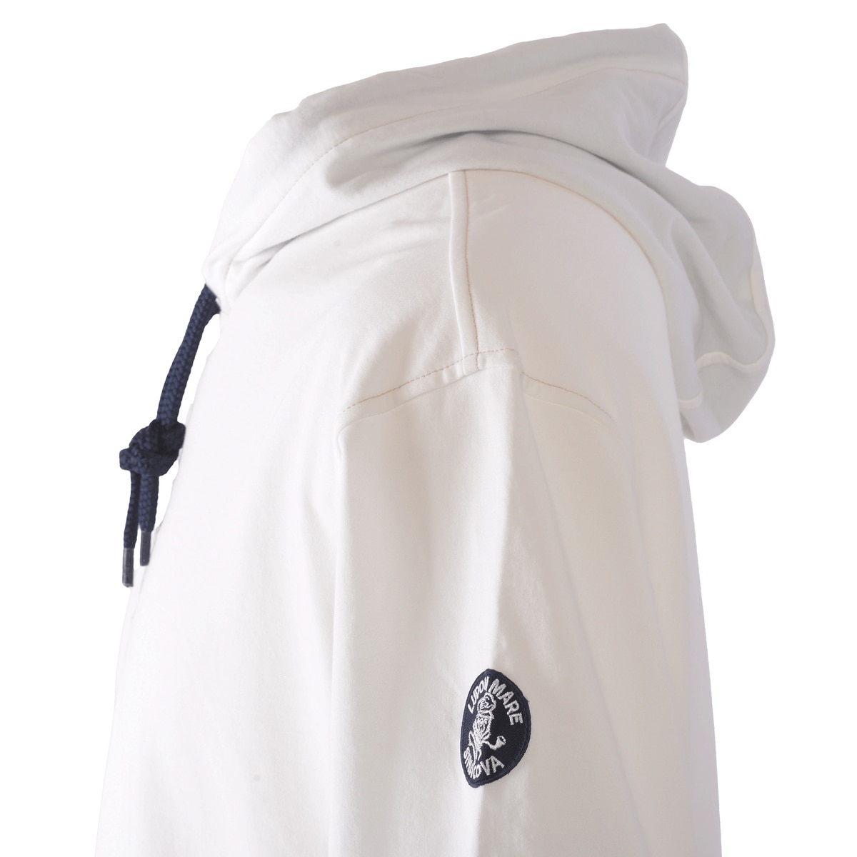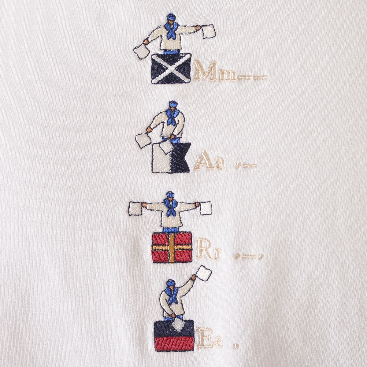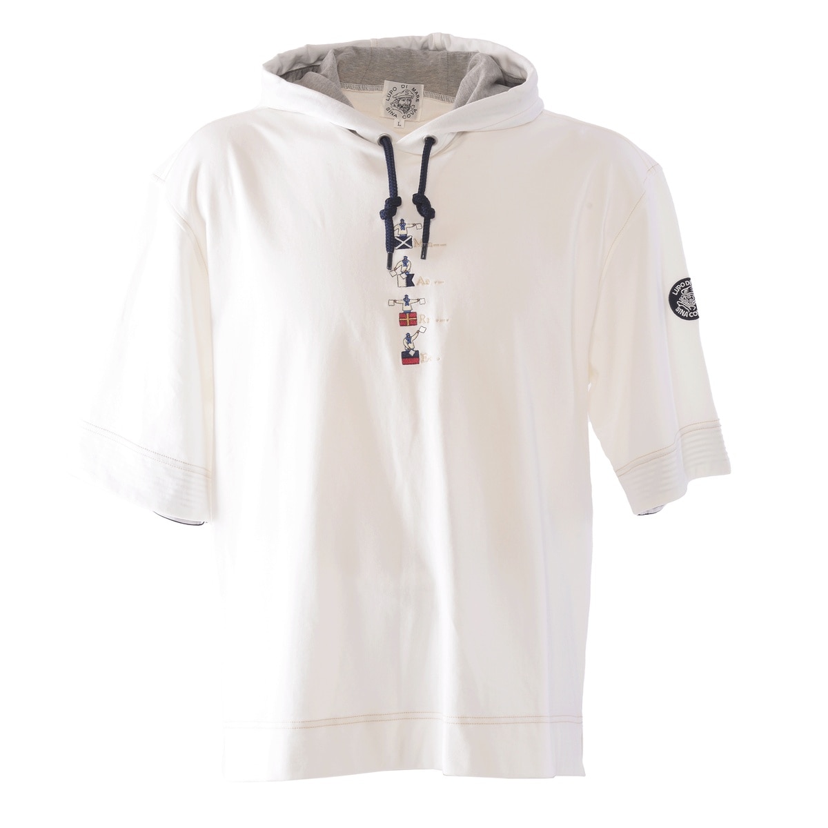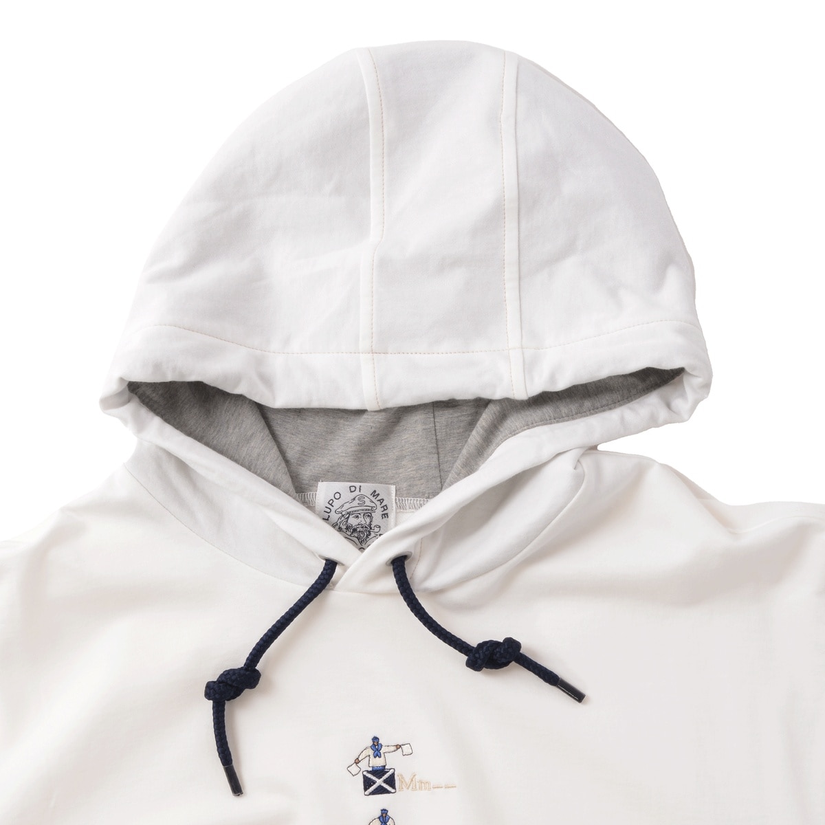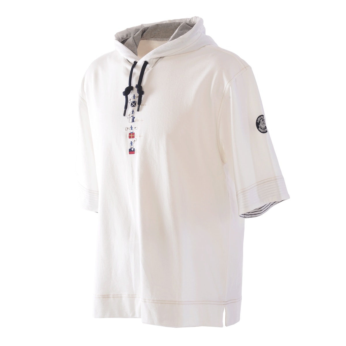 希少性の高いハイゲージの裏毛機を使用して、従来の細番手の糸を使用した薄い素材ですが生地の加工により、ソフトな風合いと膨らみのある素材を使用した5分袖のパーカーです。フードのコードは少し太めの物を使用し、コード先もエイトノットの結び方をしています。フード裏と袖口裏には別布を使用しており、後ろ姿でフードの中が配色で見え、袖口を少し折るとボーダー柄が覗く使用にしており、前中心には国際信号のL、P、Mを手旗信号で表現しているシナコバならではの刺繍を施した商品に仕上げています。