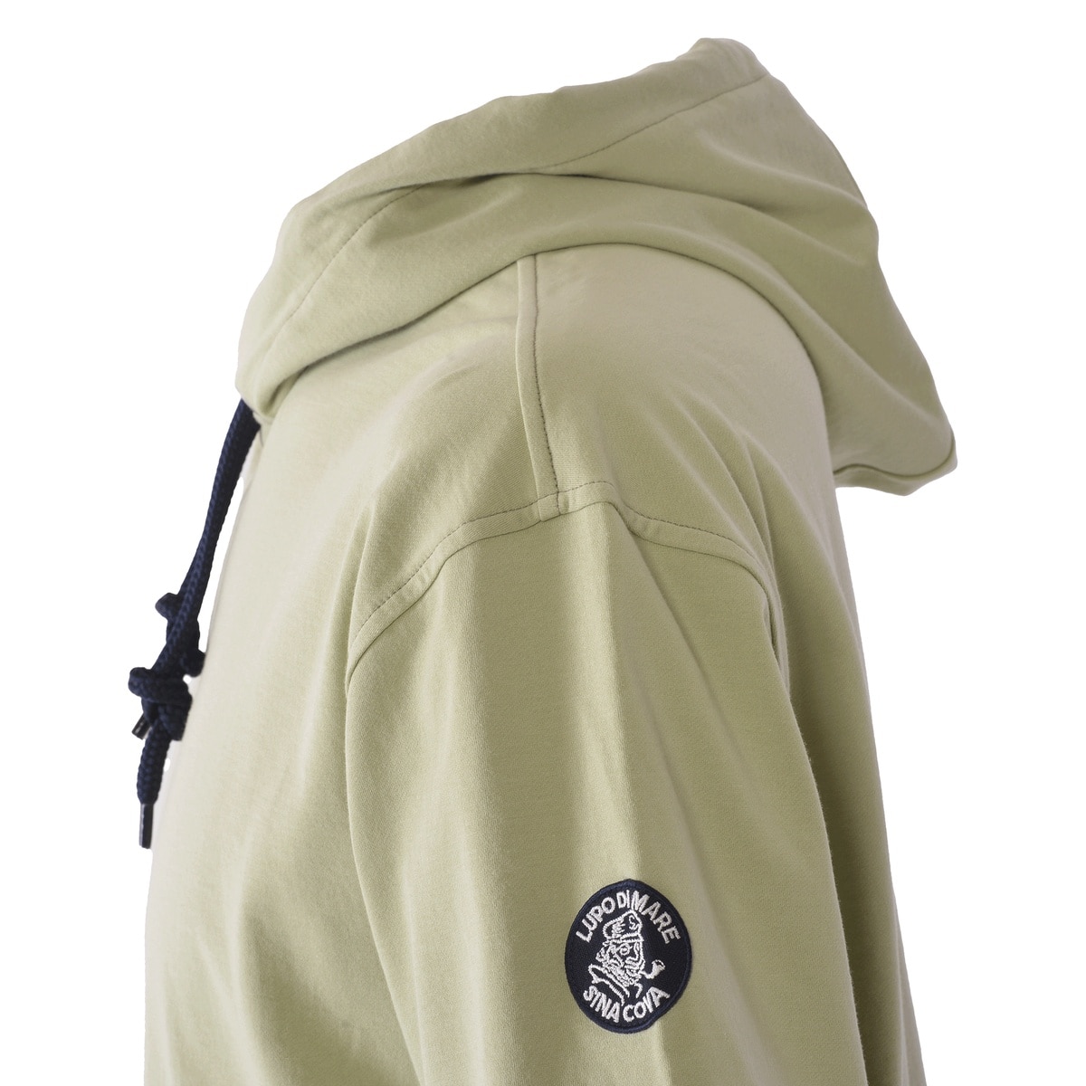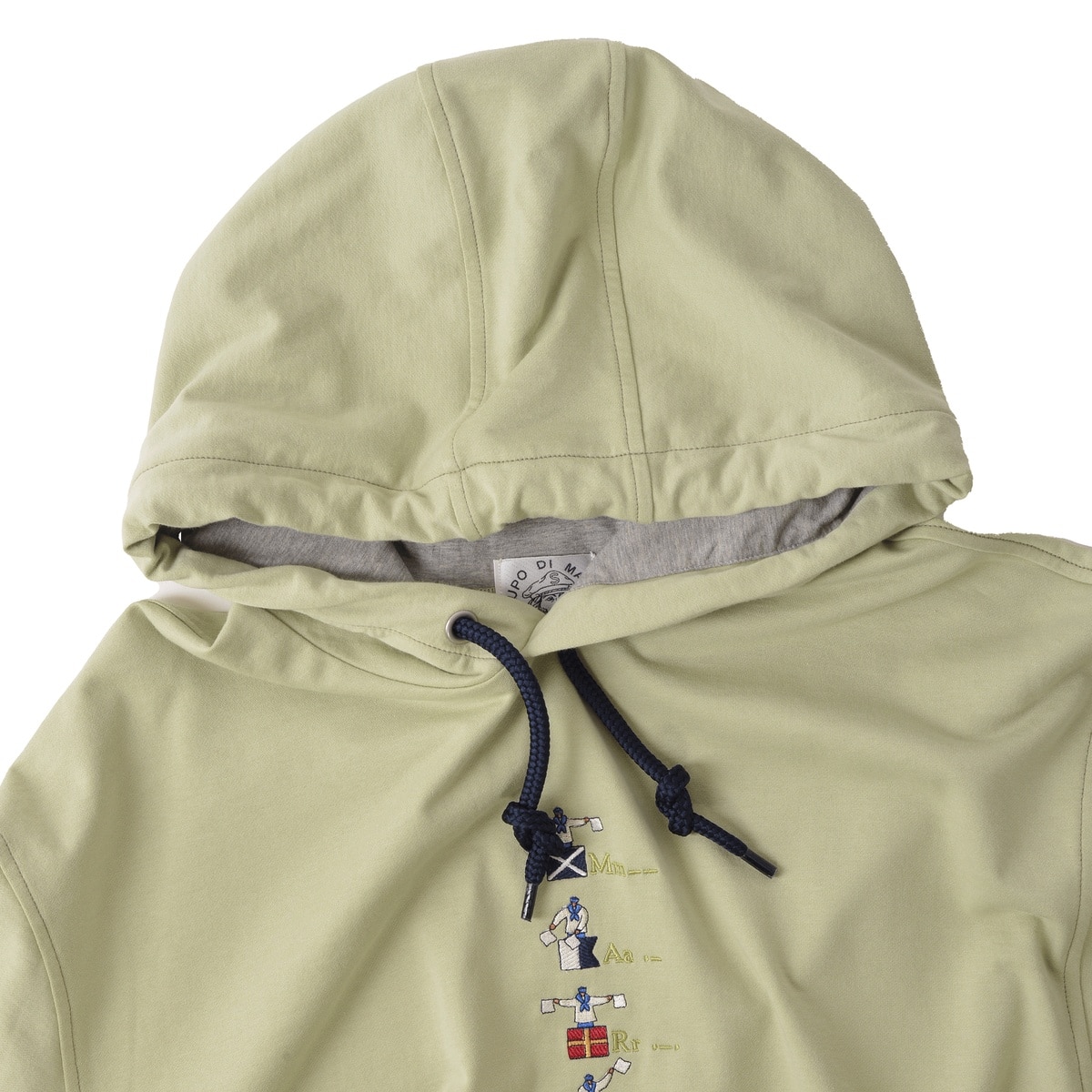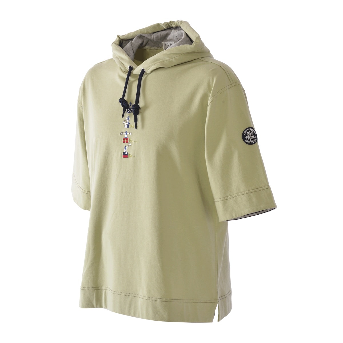 希少性の高いハイゲージの裏毛機を使用して、従来の細番手の糸を使用した薄い素材ですが生地の加工により、ソフトな風合いと膨らみのある素材を使用した5分袖のパーカーです。フードのコードは少し太めの物を使用し、コード先もエイトノットの結び方をしています。フード裏と袖口裏には別布を使用しており、後ろ姿でフードの中が配色で見え、袖口を少し折るとボーダー柄が覗く使用にしており、前中心には国際信号のL、P、Mを手旗信号で表現しているシナコバならではの刺繍を施した商品に仕上げています。