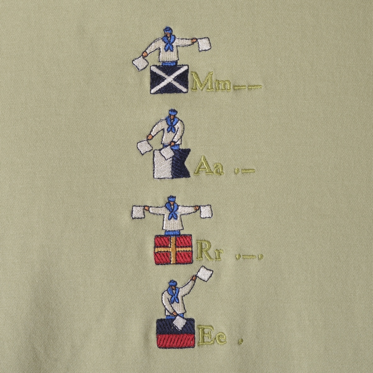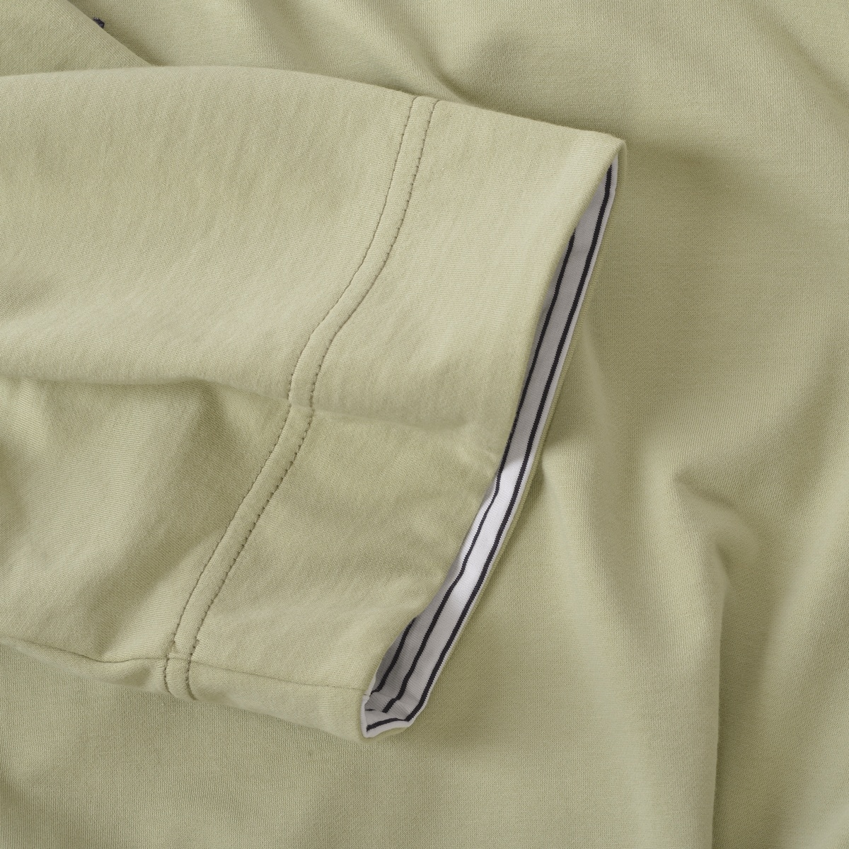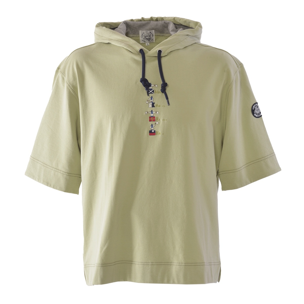 希少性の高いハイゲージの裏毛機を使用して、従来の細番手の糸を使用した薄い素材ですが生地の加工により、ソフトな風合いと膨らみのある素材を使用した5分袖のパーカーです。フードのコードは少し太めの物を使用し、コード先もエイトノットの結び方をしています。フード裏と袖口裏には別布を使用しており、後ろ姿でフードの中が配色で見え、袖口を少し折るとボーダー柄が覗く使用にしており、前中心には国際信号のL、P、Mを手旗信号で表現しているシナコバならではの刺繍を施した商品に仕上げています。