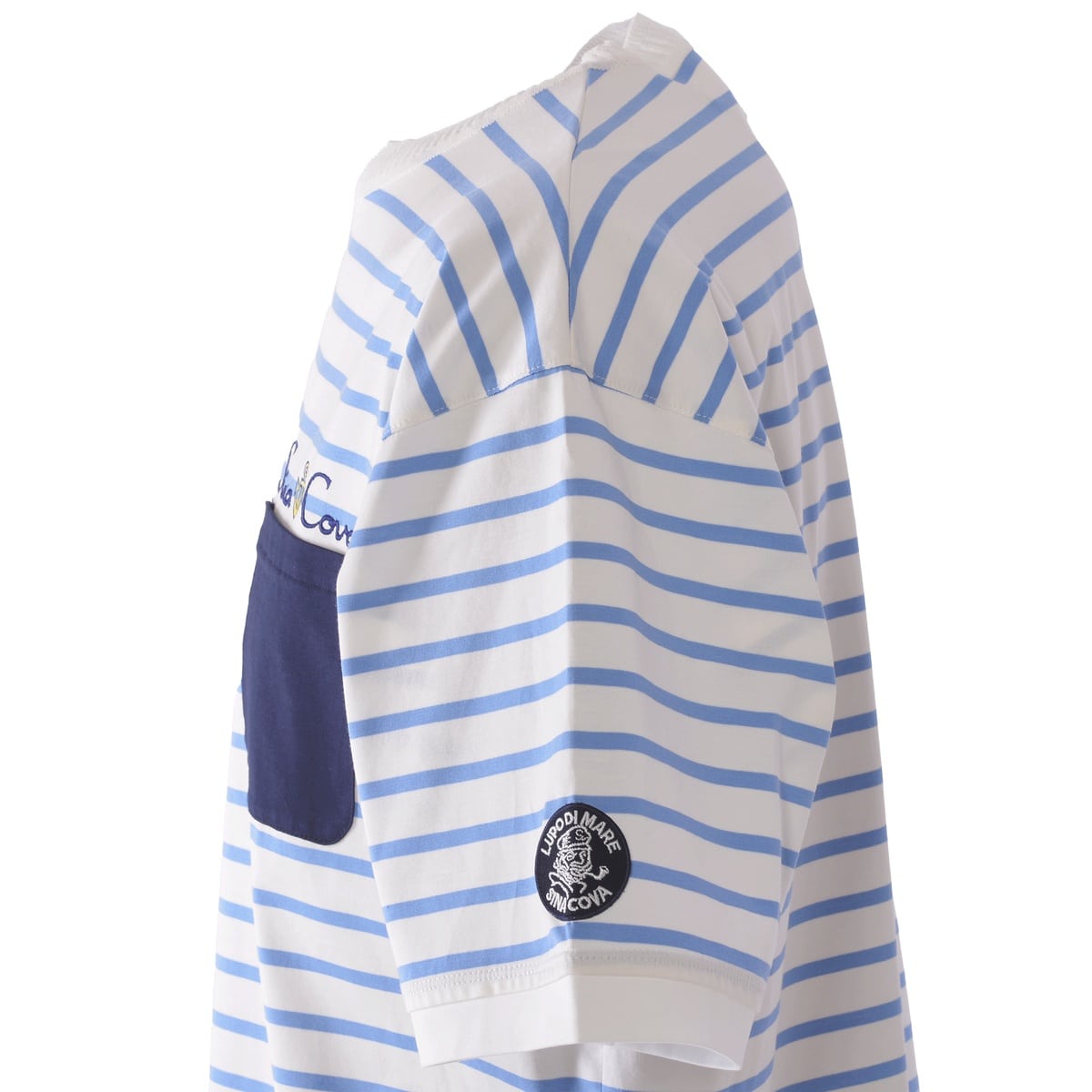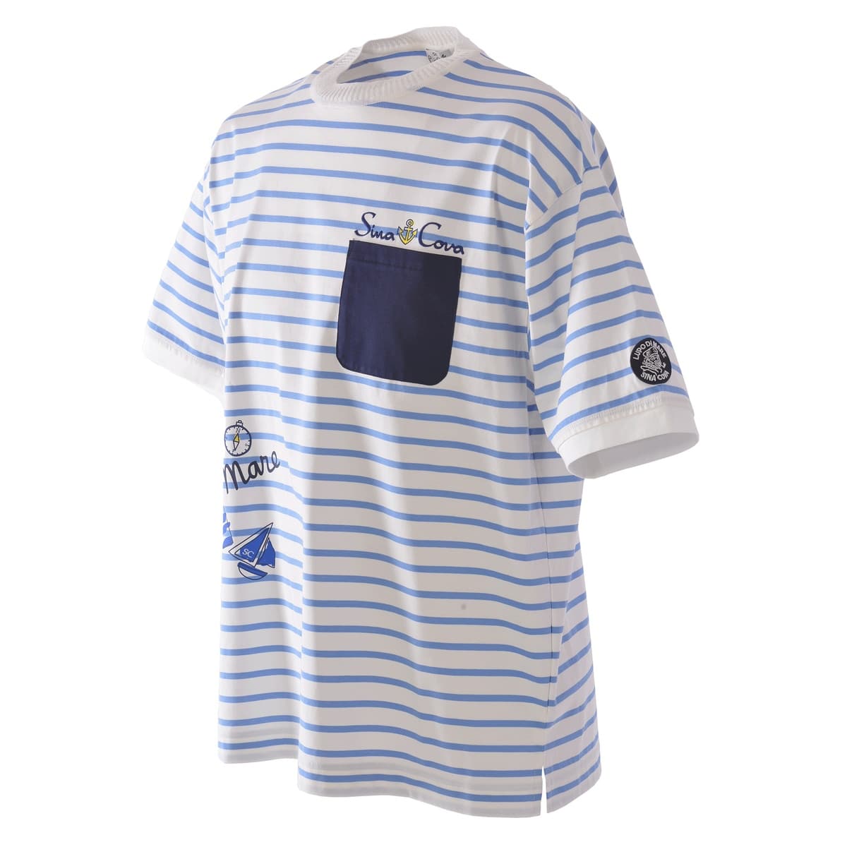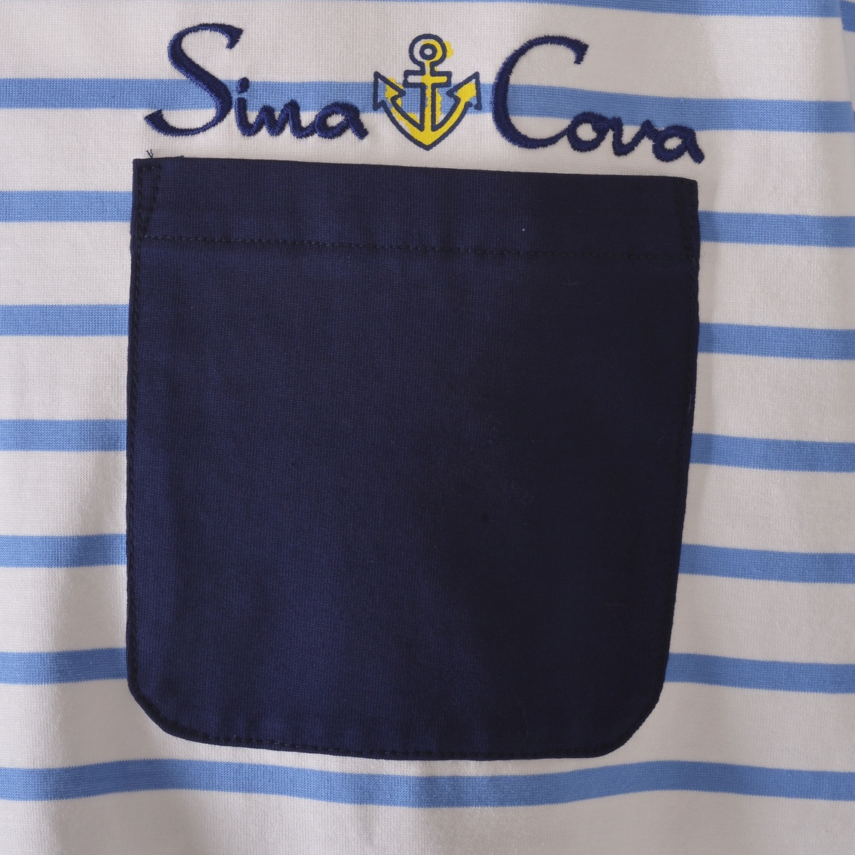 フロントに「SINA COVA」文字の刺繍とプリントを入れ、ポケットをニット素材でデザインしたボーダー半袖Tシャツです。