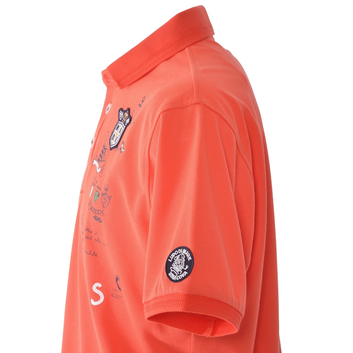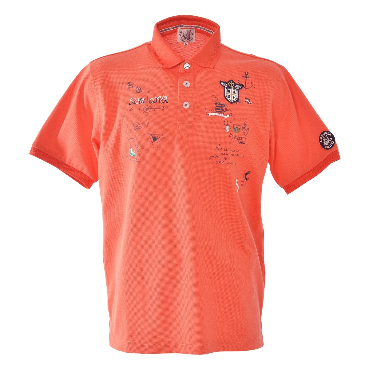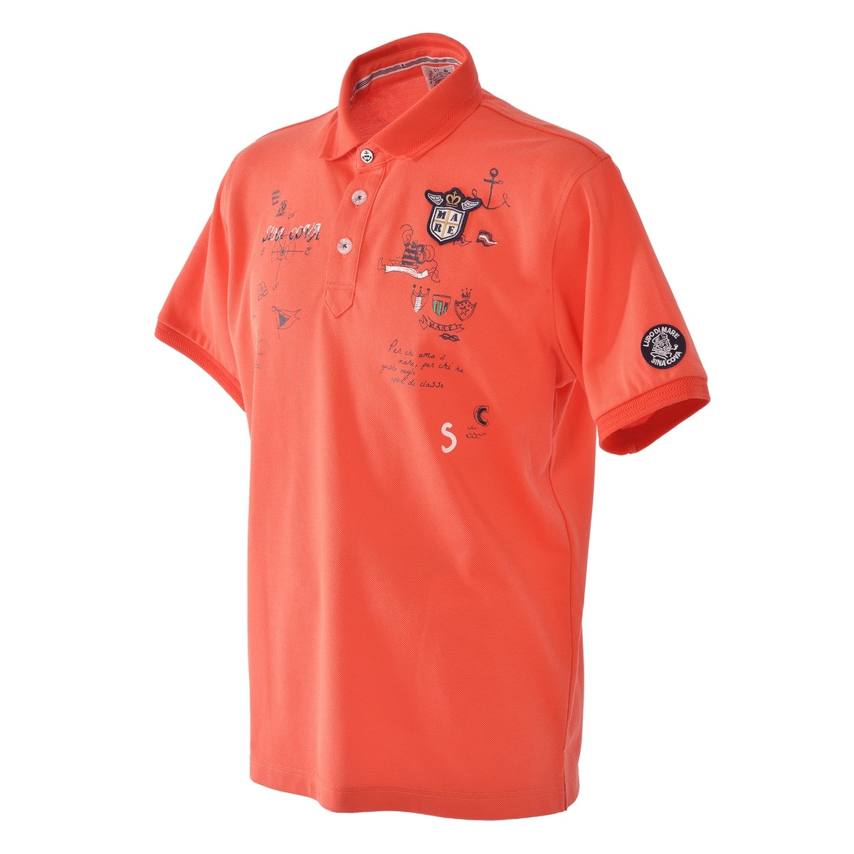 フロントには手書き風のキャプテンや海のモチーフプリントとエンブレム風ワッペンをデザインした半袖ポロシャツです。
