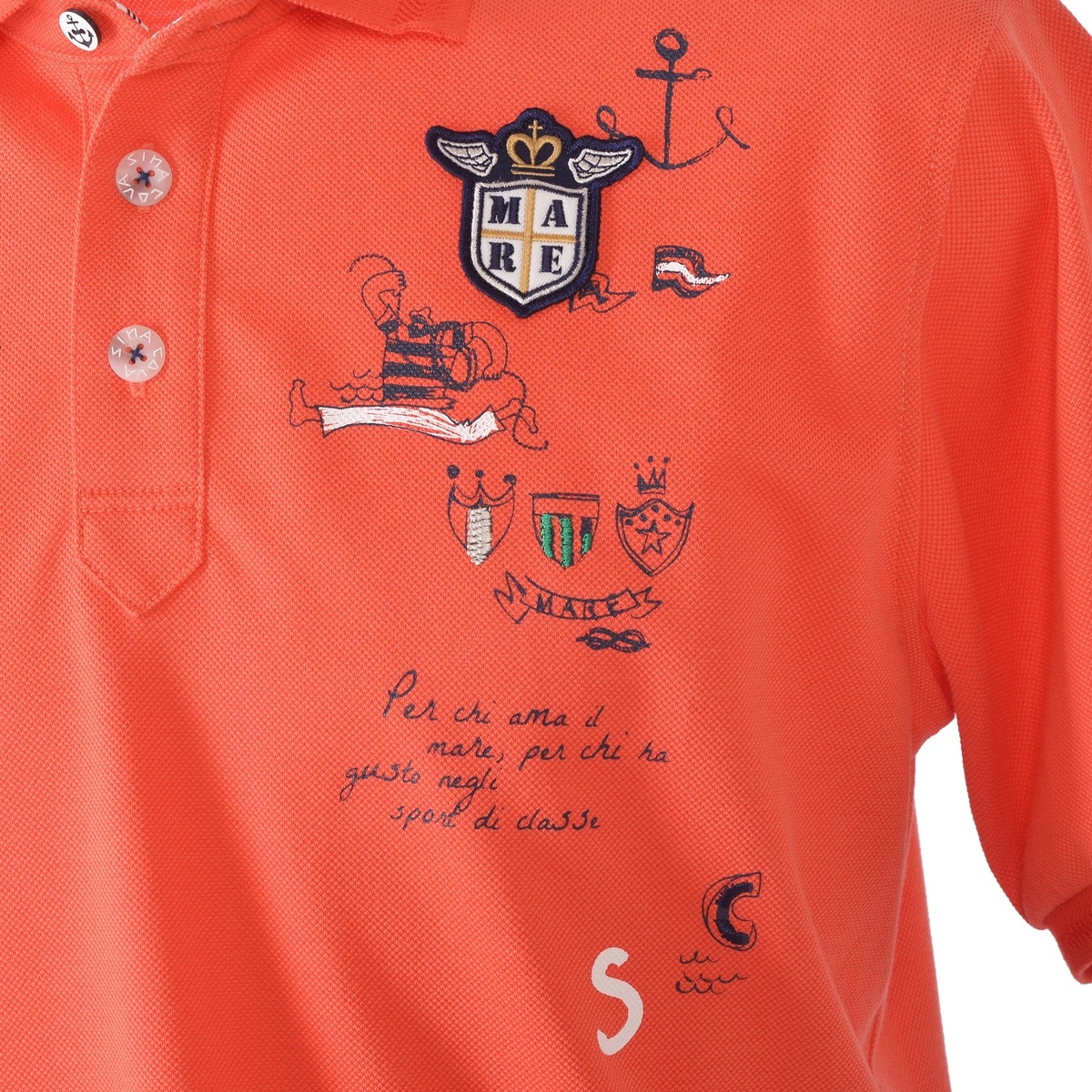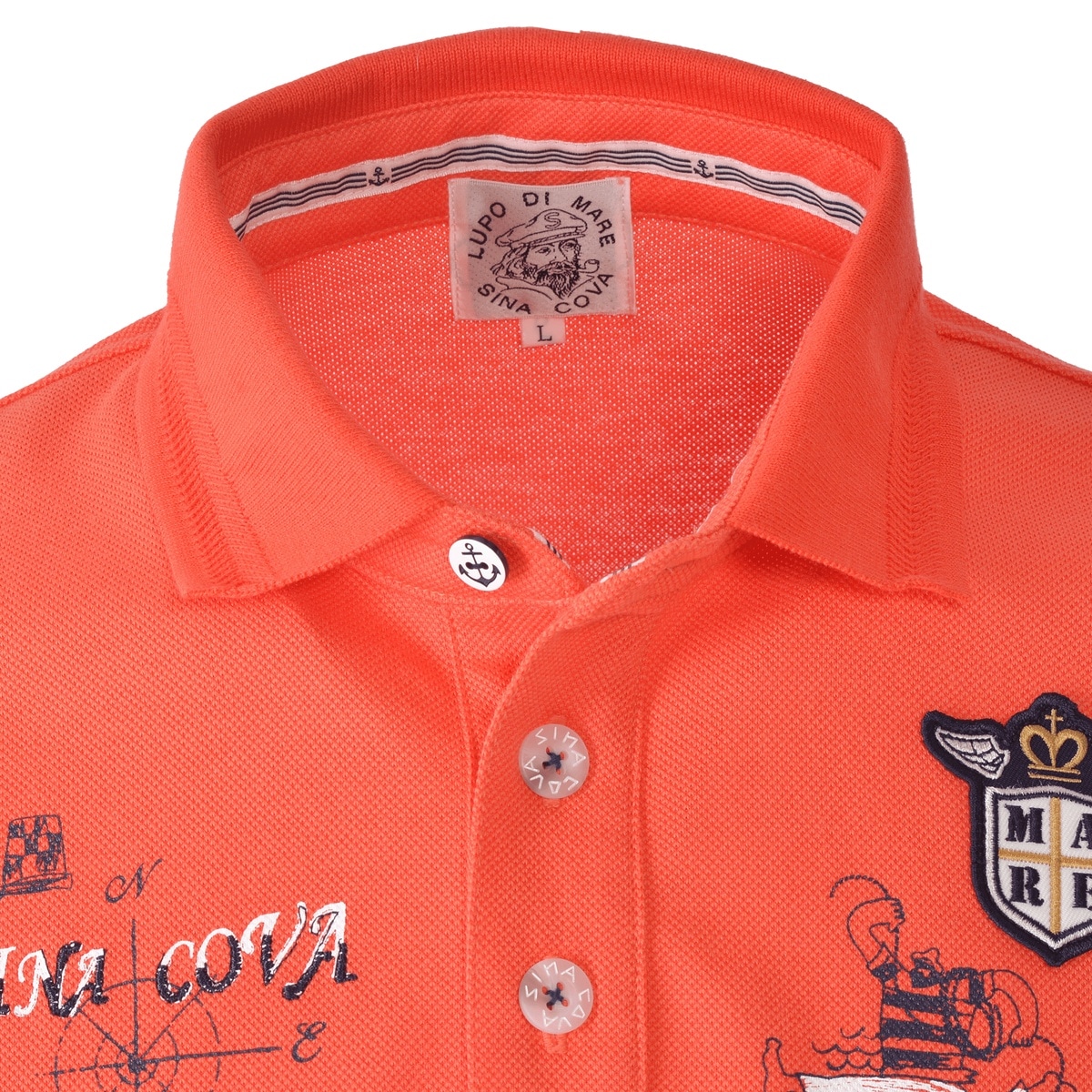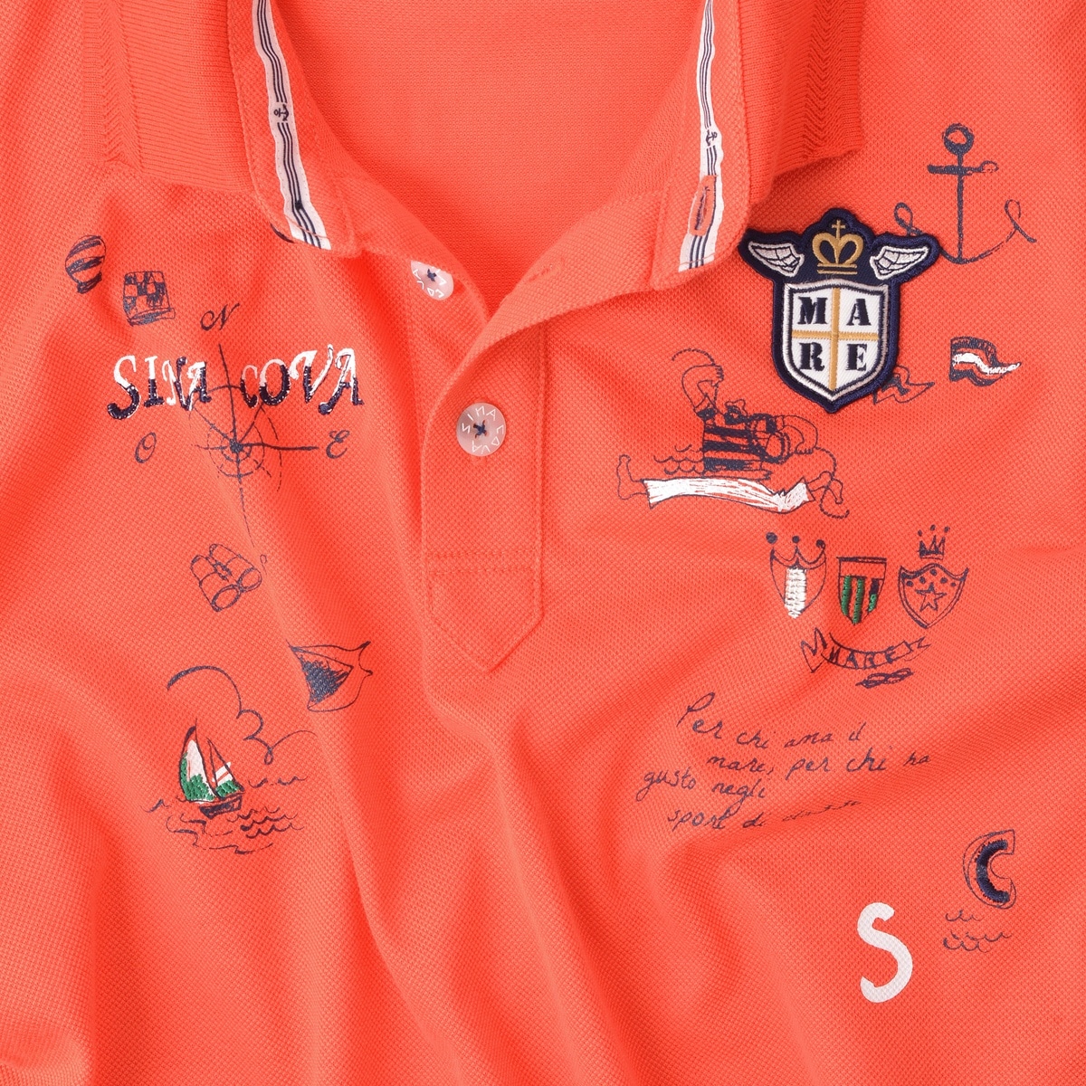 フロントには手書き風のキャプテンや海のモチーフプリントとエンブレム風ワッペンをデザインした半袖ポロシャツです。