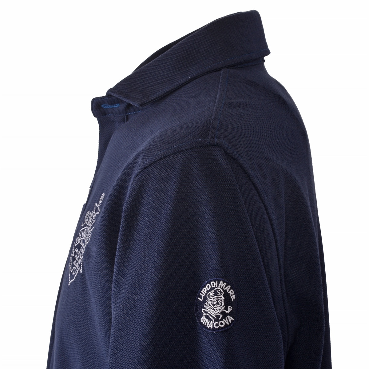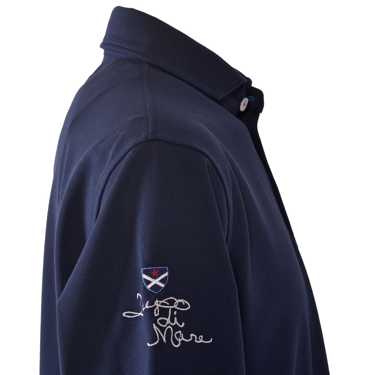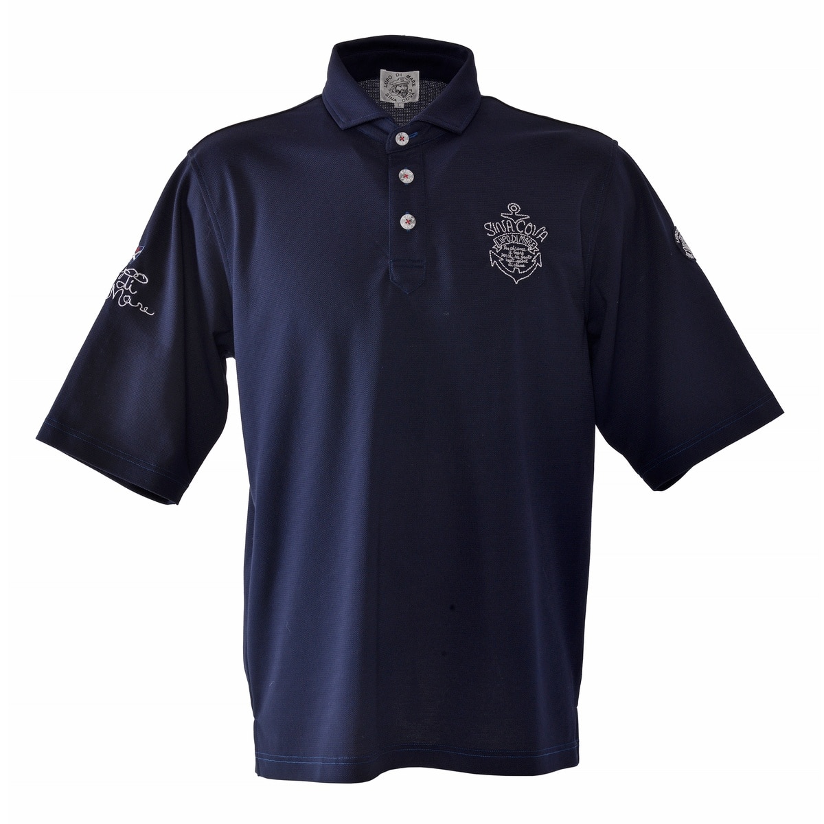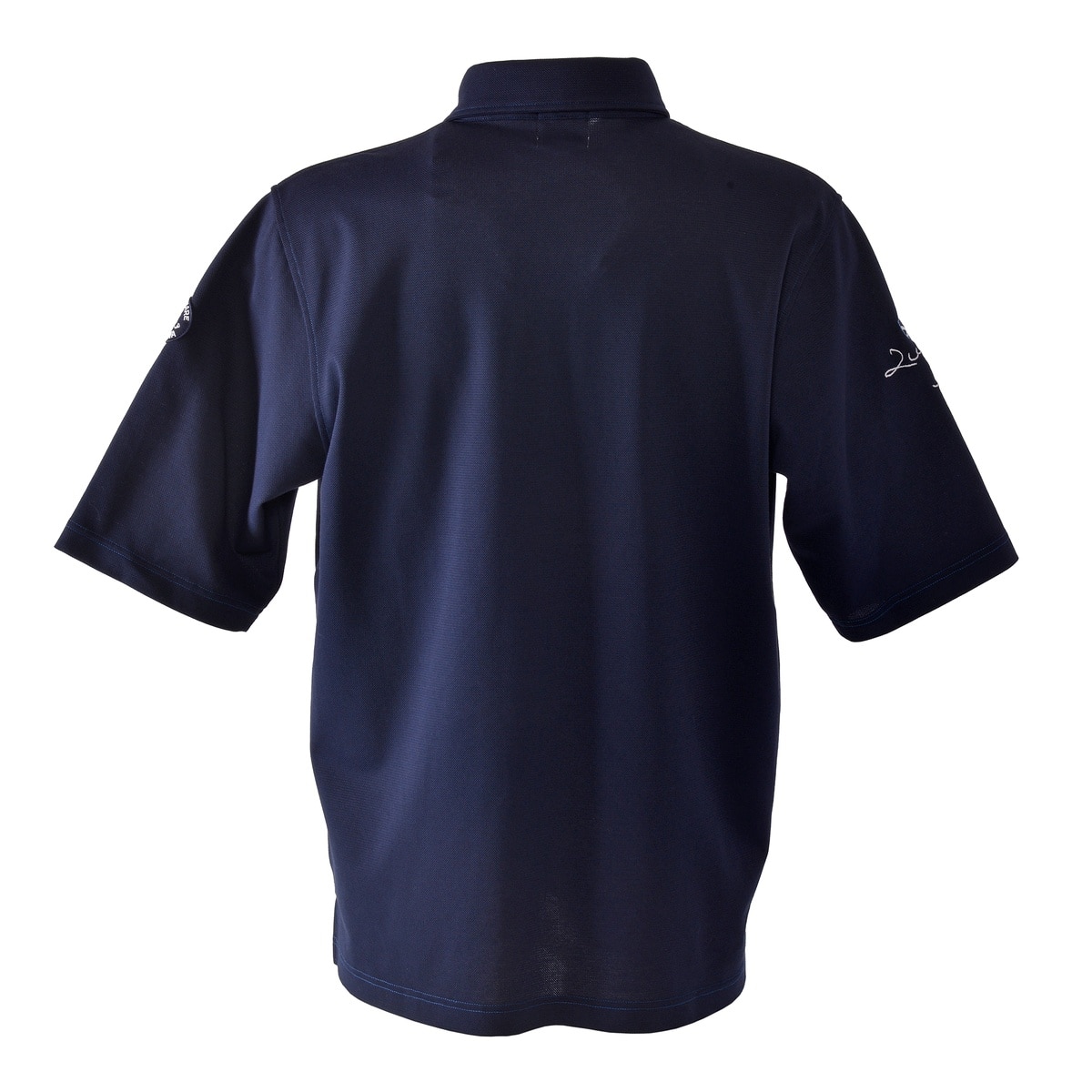 胸と袖にエンブレム調の刺繍とロゴをデザインした5分袖ポロシャツです。