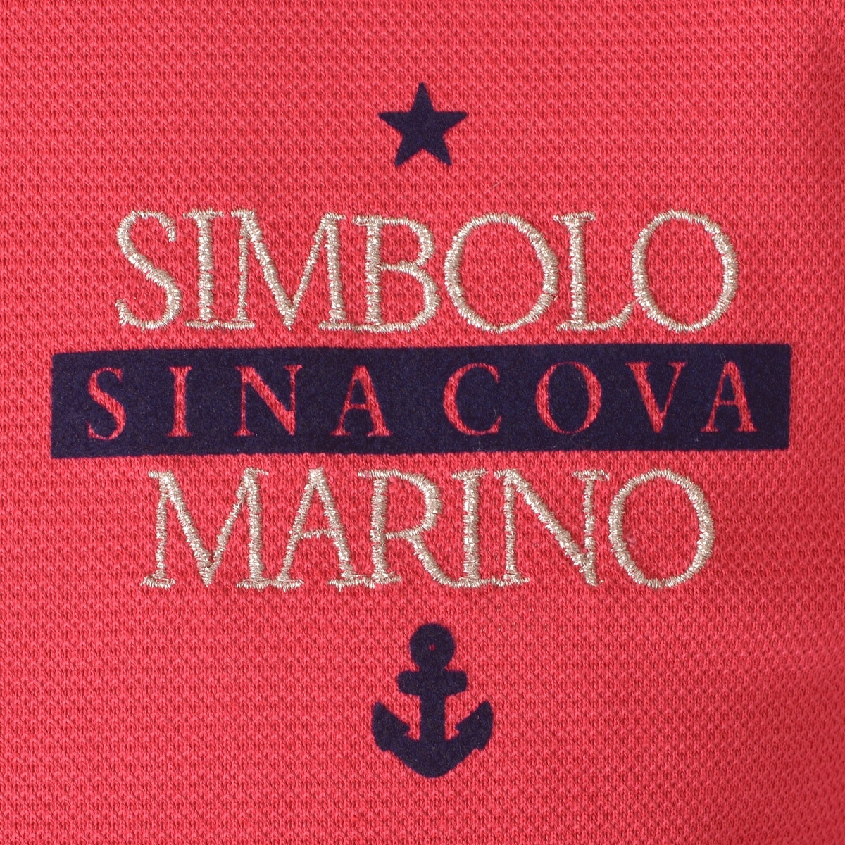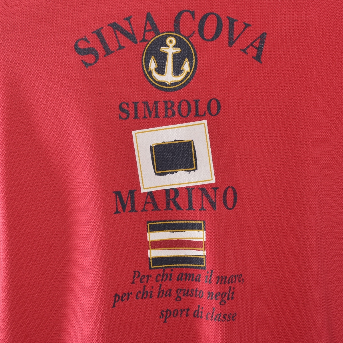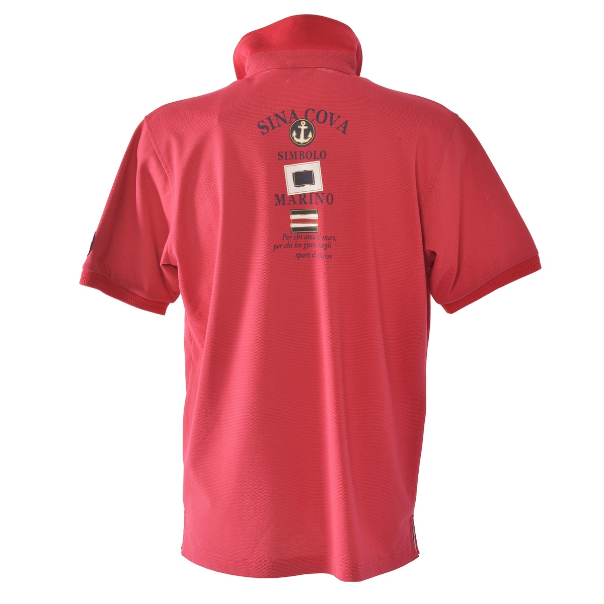 フロントに「SINA COVA」文字を刺繍とフロッキープリント、バックに手旗信号のフラッグモチーフをプリントをデザインした半袖ポロシャツです。