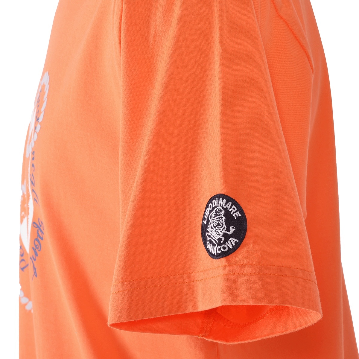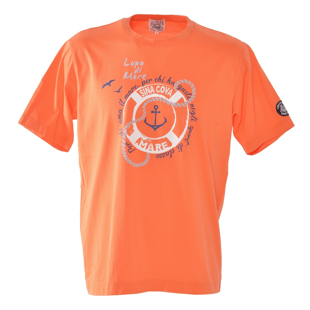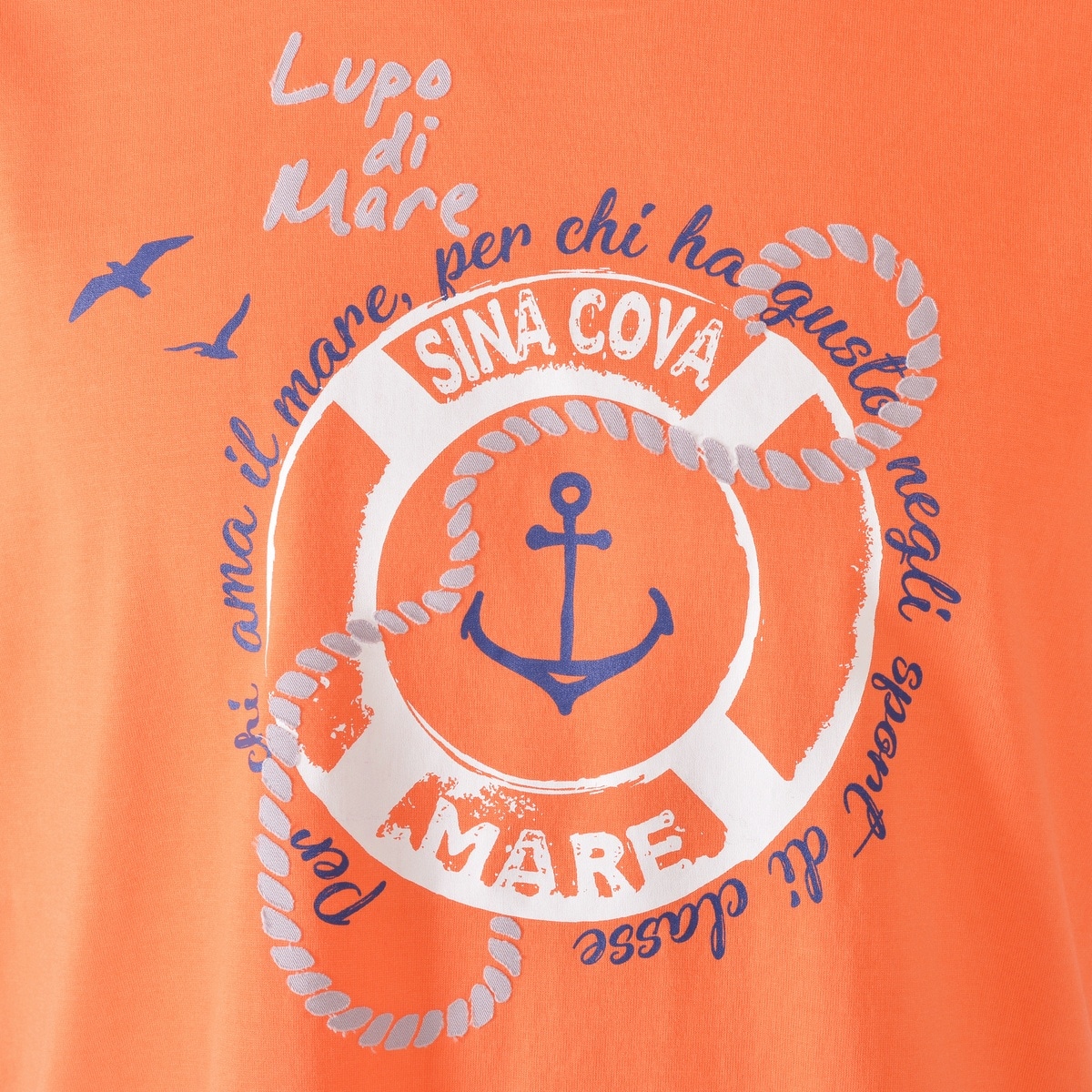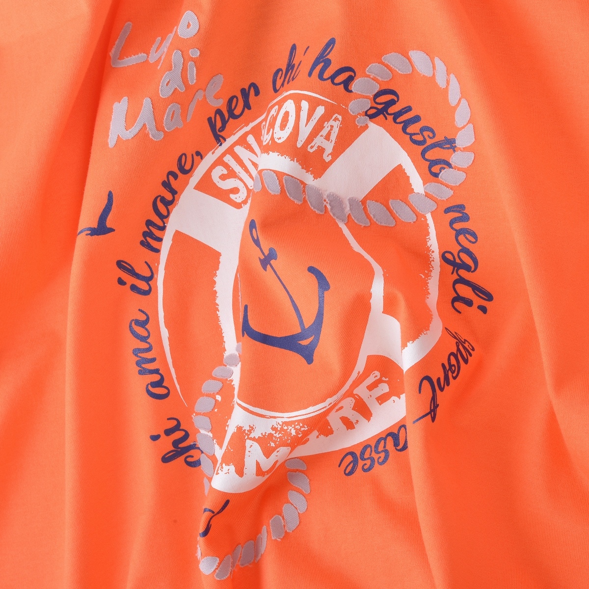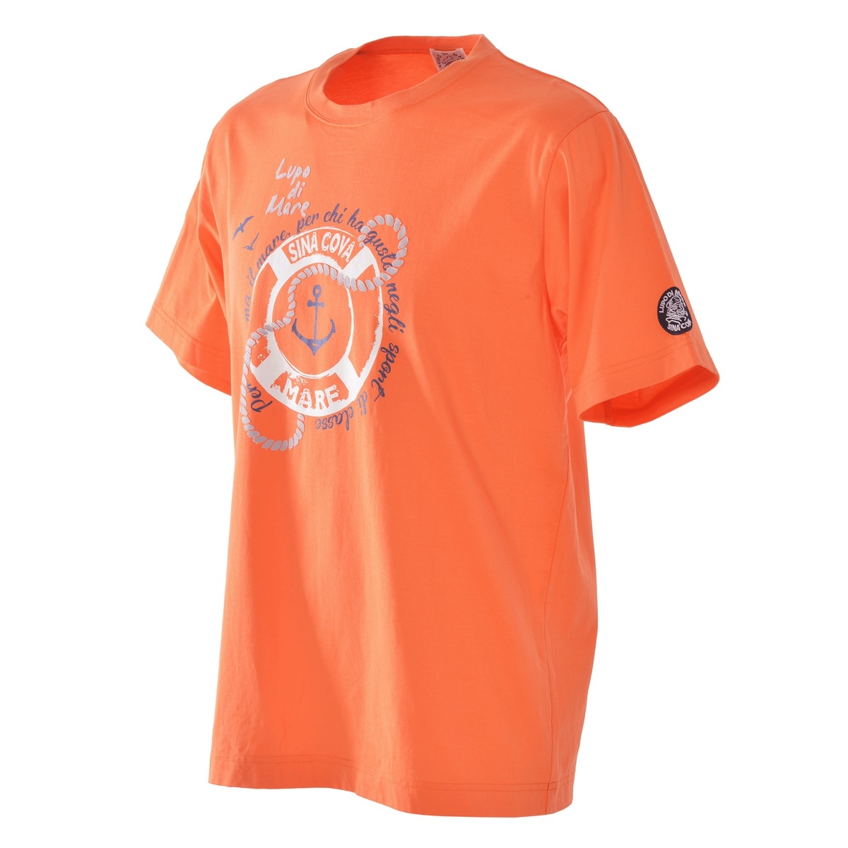 イカリと浮き輪をメインにシナコバロゴをオパール加工とプリントでデザインした半袖Tシャツです。「Lupo di Mare」とロープ部分はオパール加工を施し立体感を出しています。生地にはハイゲージで編み立てガス焼き工程を通すことで毛羽立ちを抑えさらっとした肌触りで耐久性も優れた素材を使用しています。クリアーで高級感のあるオリジナル素材です。・光沢がありさらっちした肌触りの生地