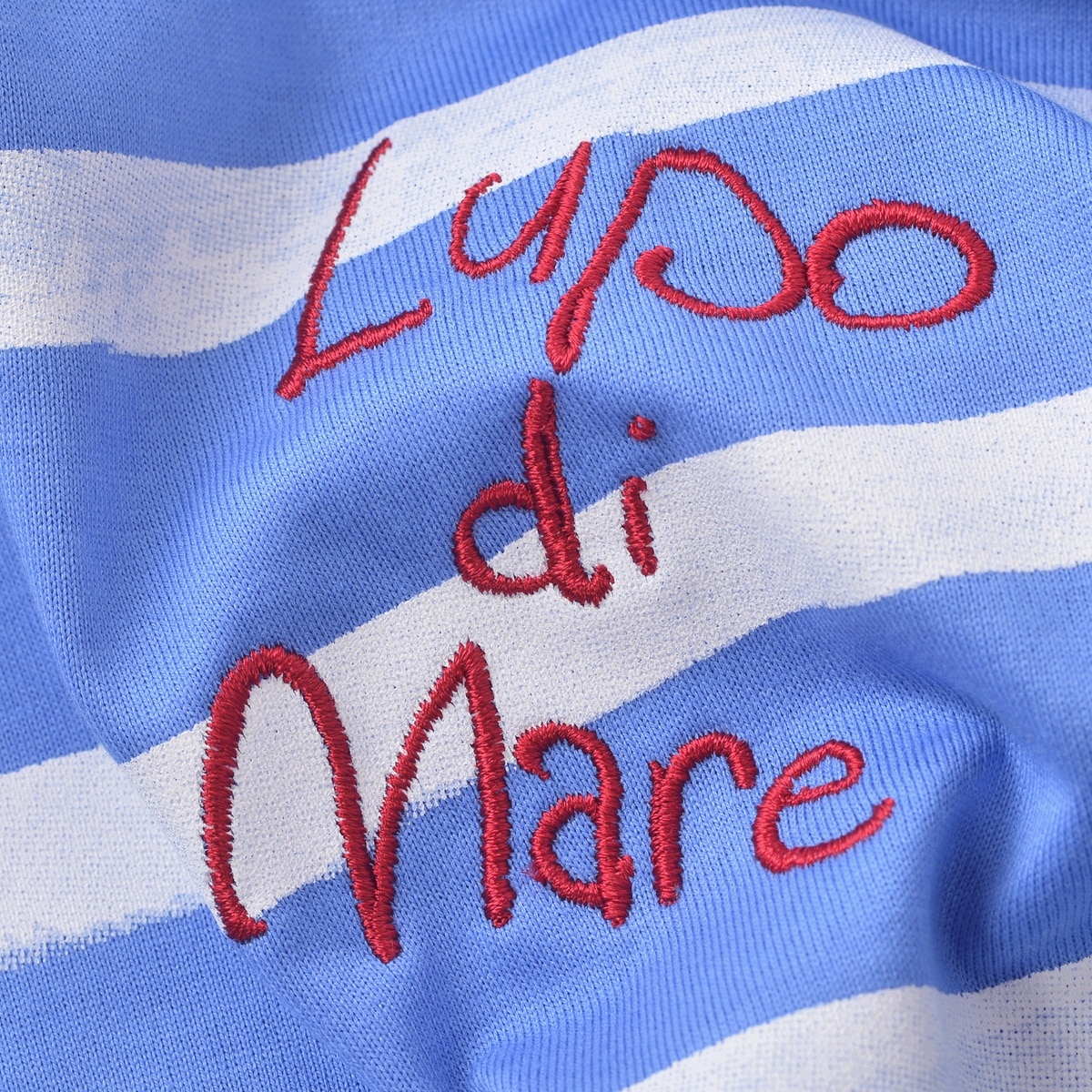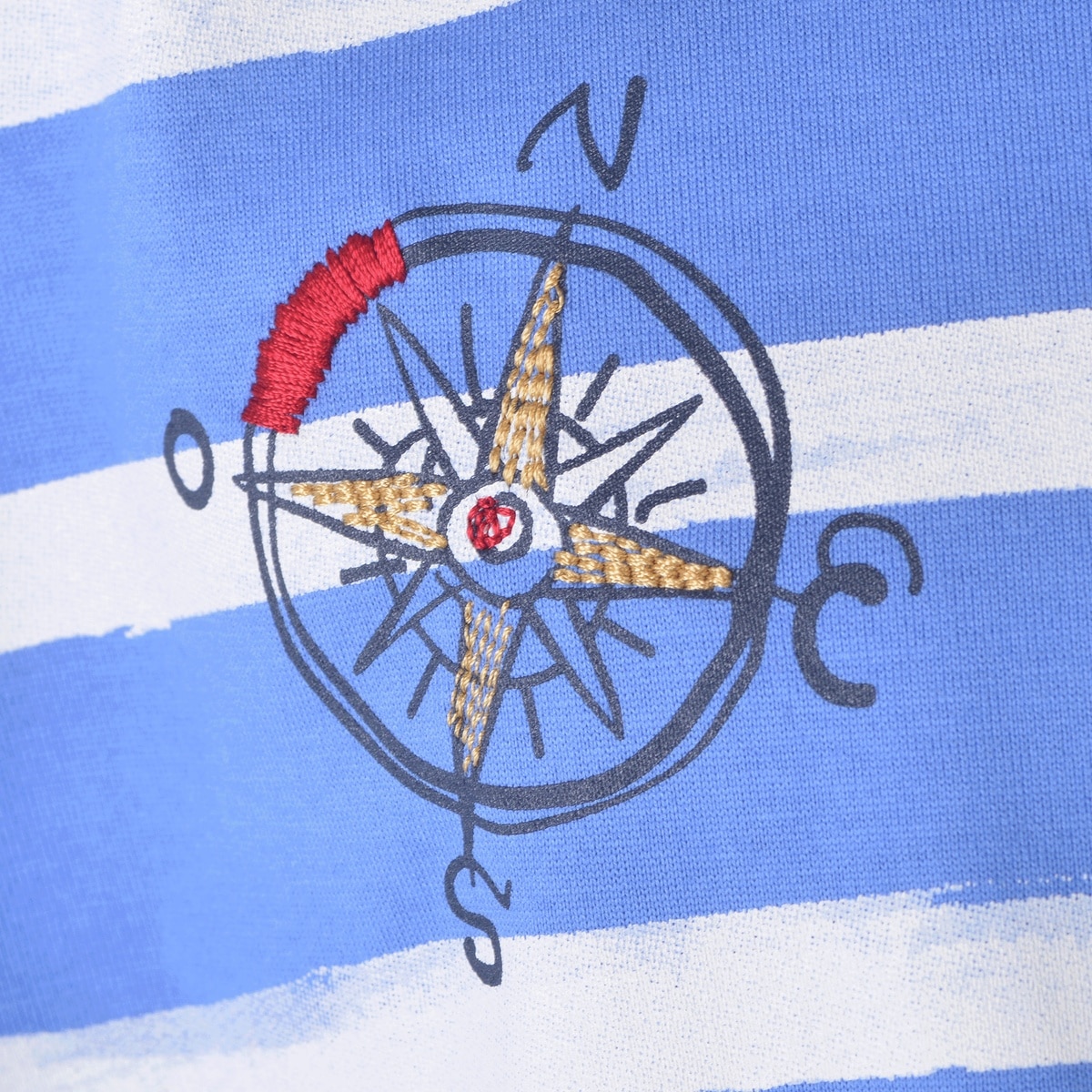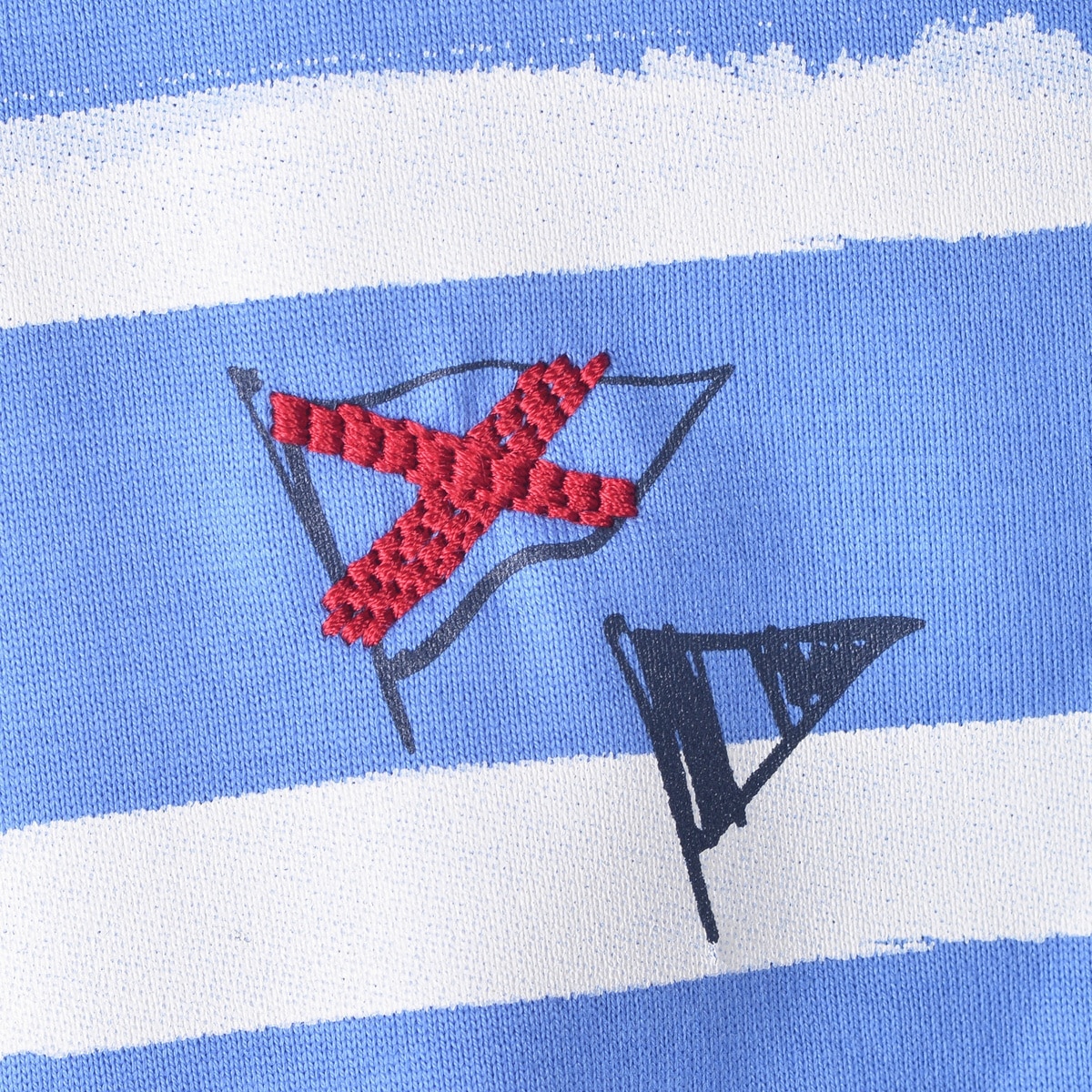 40/2のハイゲージで編み立て、ガス焼き工程を通す事で毛羽をそぎ落としたクリアーな表面感とシルケット加工により発色もよく耐久性にも優れ、肌触りがさらっとしているオリジナル素材のTシャツ。マリンと言えばボーダーが連想されるように、シナコバのボーダーイメージのパネル風の柄を施したTシャツです。ポーターと羅針盤、イカリ、ロゴ、旗、エンブレムと目いっぱいマリンのモチーフを使いプリントの上に刺繍を重ねる高度な手法でこだわった商品です。