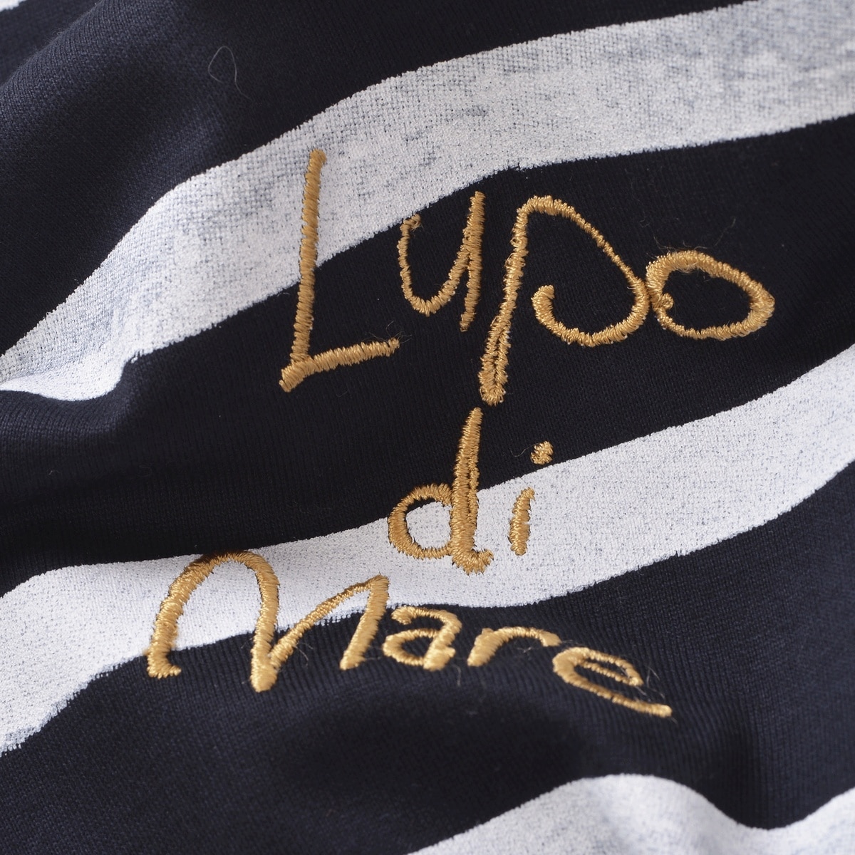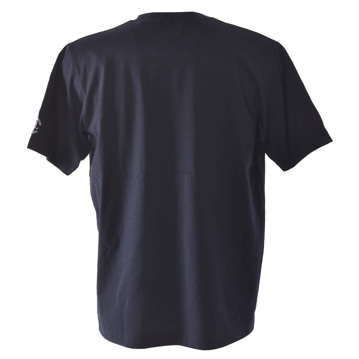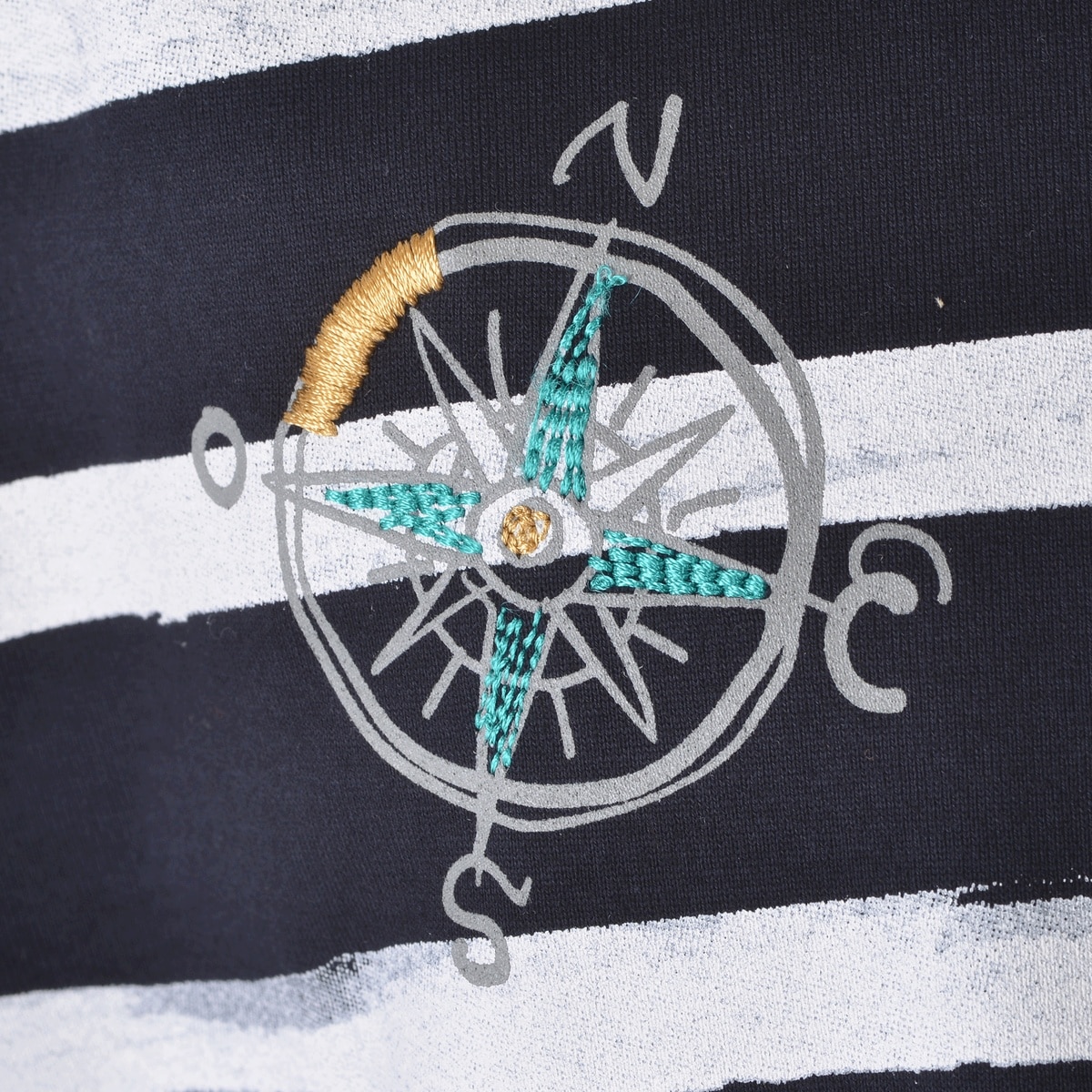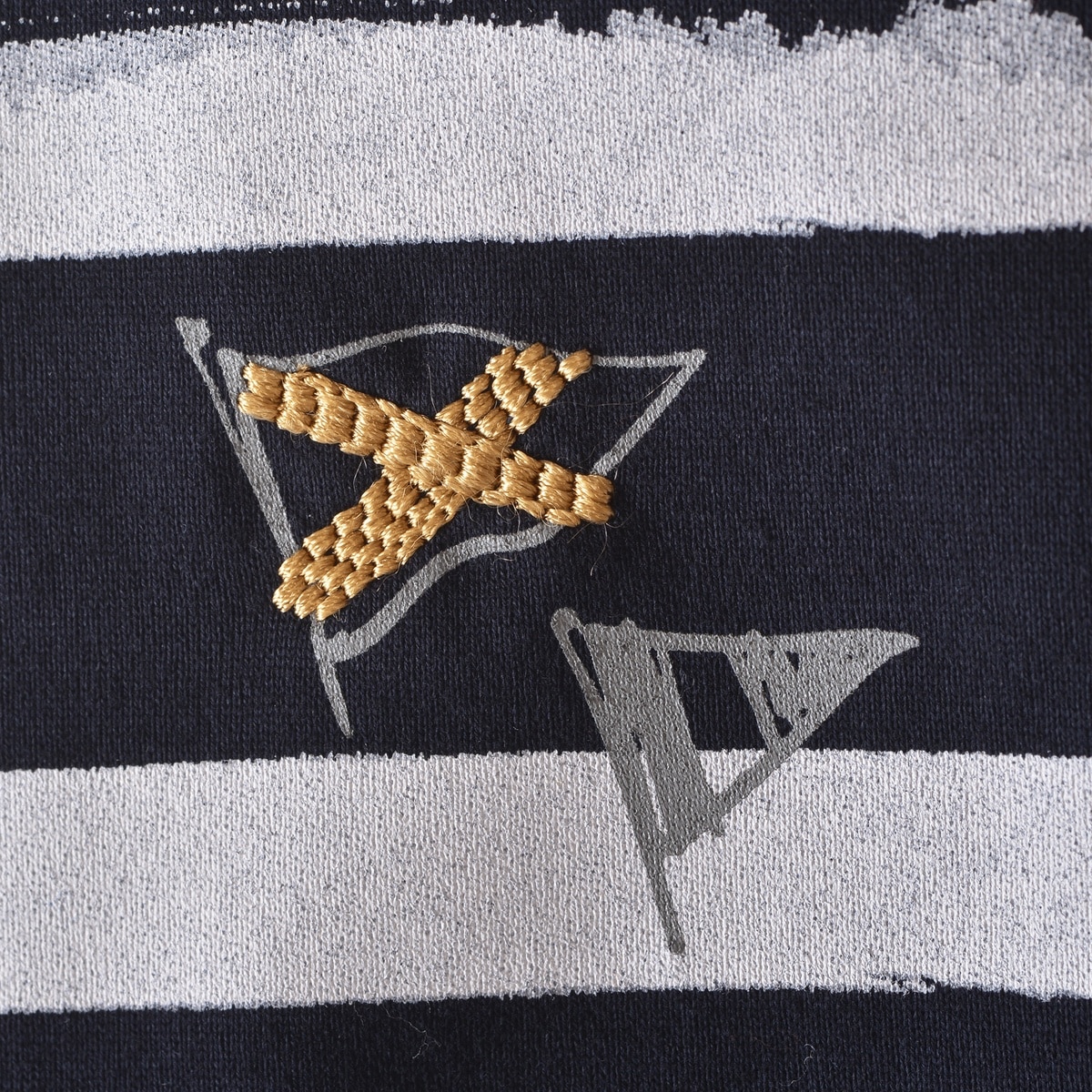40/2のハイゲージで編み立て、ガス焼き工程を通す事で毛羽をそぎ落としたクリアーな表面感とシルケット加工により発色もよく耐久性にも優れ、肌触りがさらっとしているオリジナル素材のTシャツ。マリンと言えばボーダーが連想されるように、シナコバのボーダーイメージのパネル風の柄を施したTシャツです。ポーターと羅針盤、イカリ、ロゴ、旗、エンブレムと目いっぱいマリンのモチーフを使いプリントの上に刺繍を重ねる高度な手法でこだわった商品です。