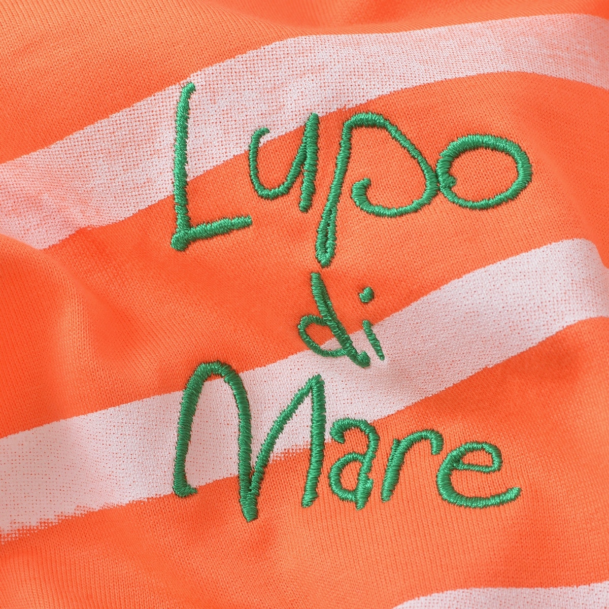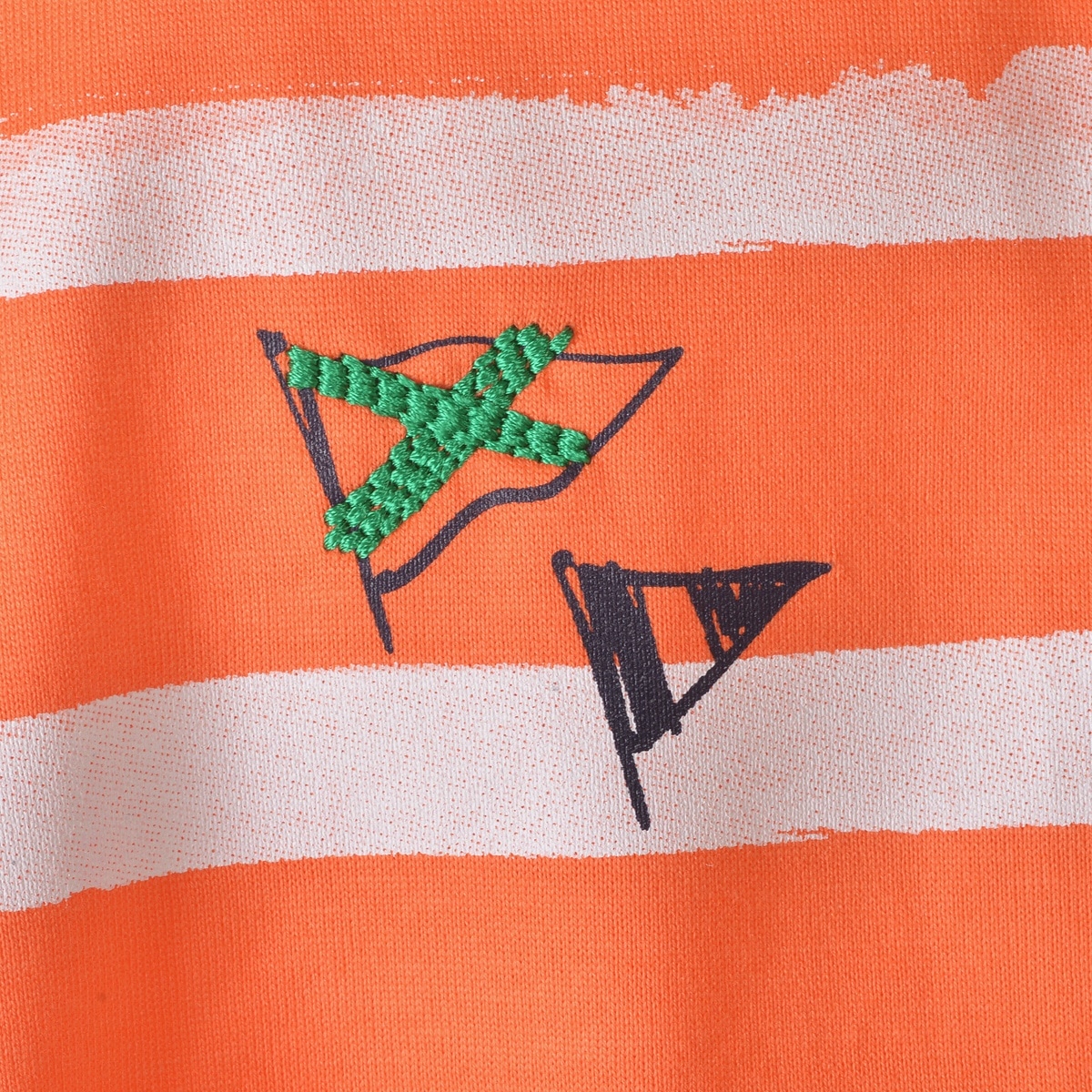 40/2のハイゲージで編み立て、ガス焼き工程を通す事で毛羽をそぎ落としたクリアーな表面感とシルケット加工により発色もよく耐久性にも優れ、肌触りがさらっとしているオリジナル素材のTシャツ。マリンと言えばボーダーが連想されるように、シナコバのボーダーイメージのパネル風の柄を施したTシャツです。ポーターと羅針盤、イカリ、ロゴ、旗、エンブレムと目いっぱいマリンのモチーフを使いプリントの上に刺繍を重ねる高度な手法でこだわった商品です。