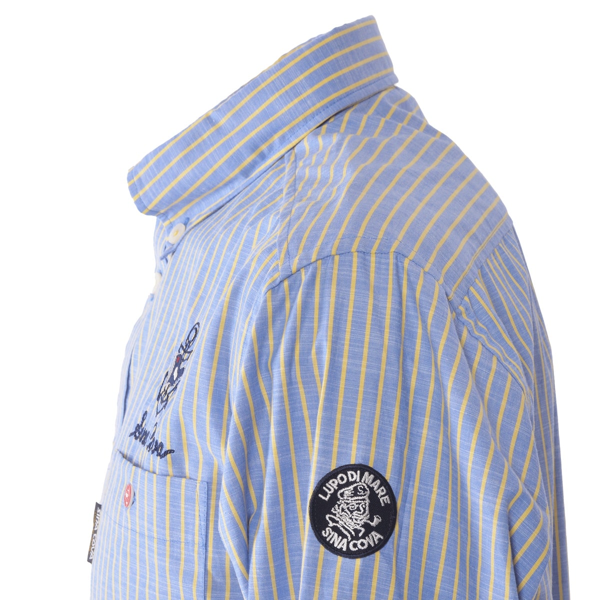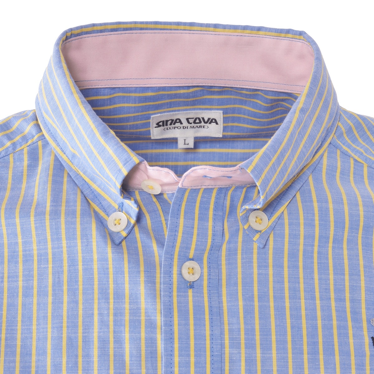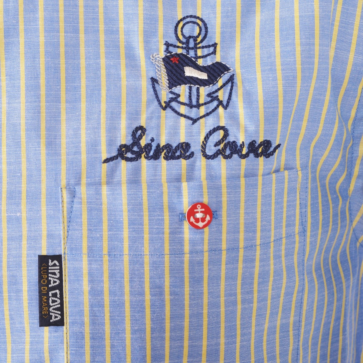 ポケット上部に「SINA COVA」文字とイカリのモチーフ、左スリーブに「Per chi ama il mare」の文字刺繍をデザインしたストライプ柄ボタンダウンシャツです。