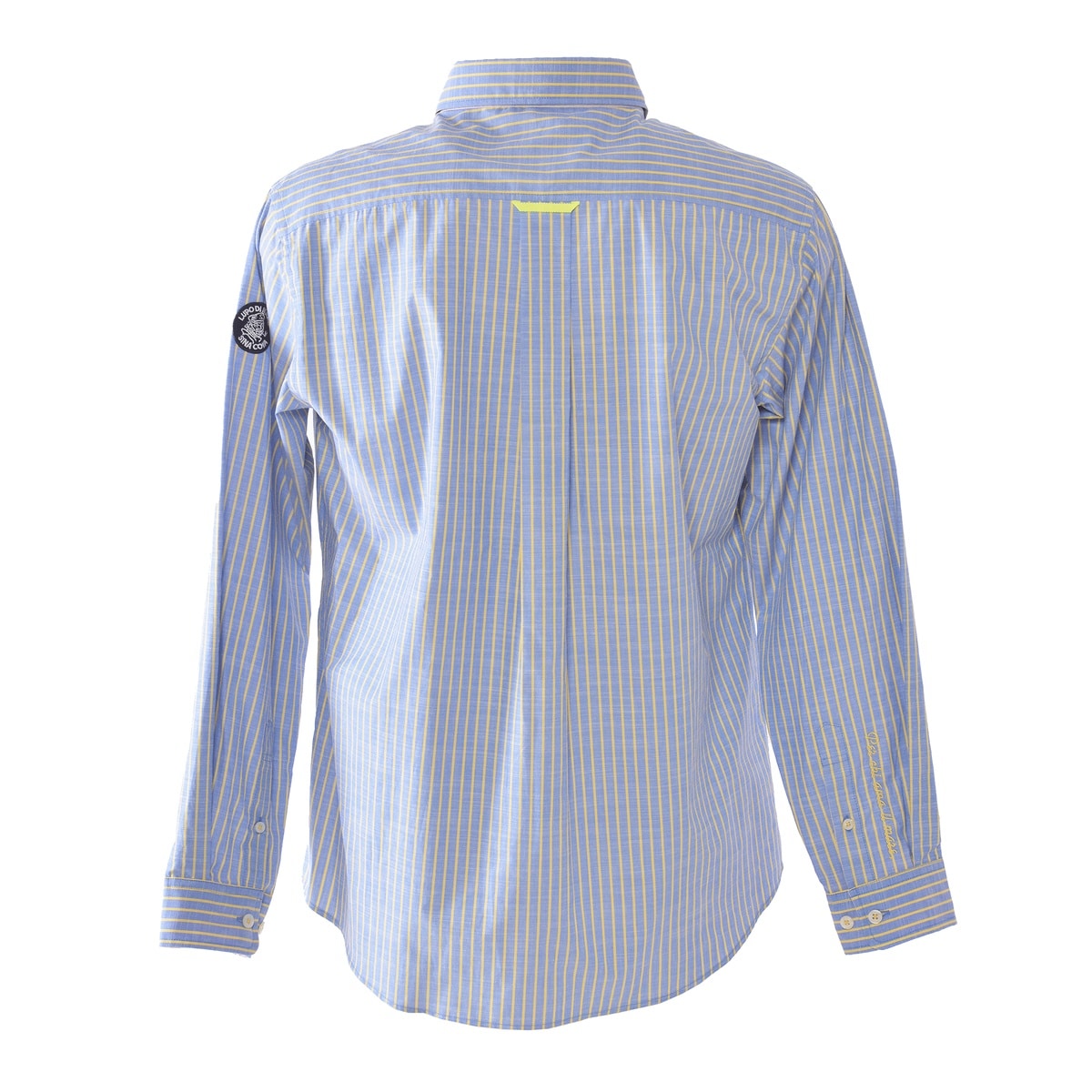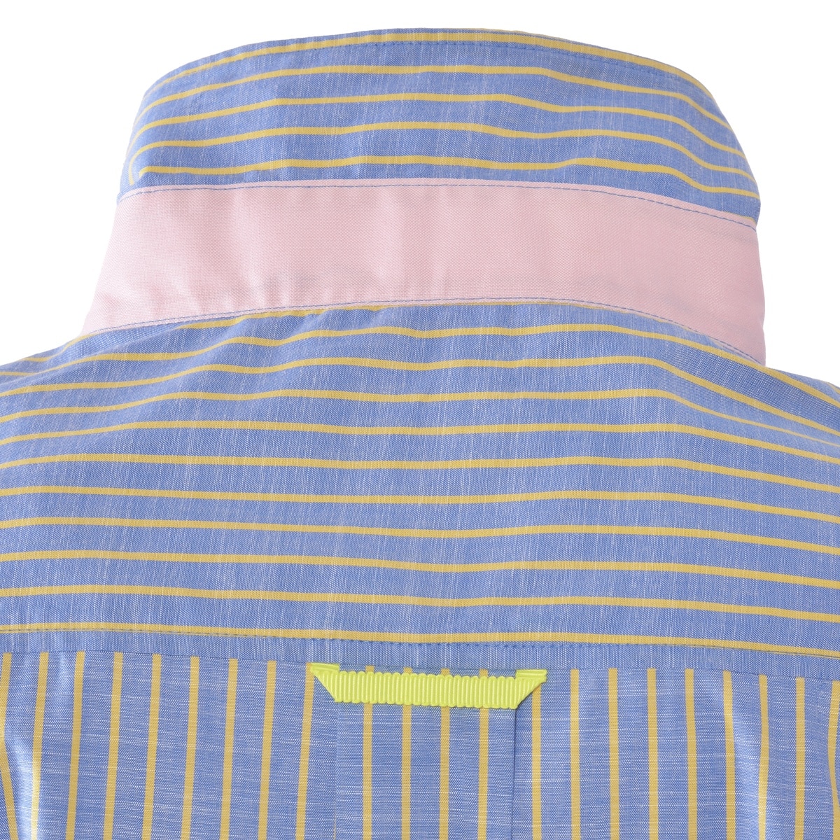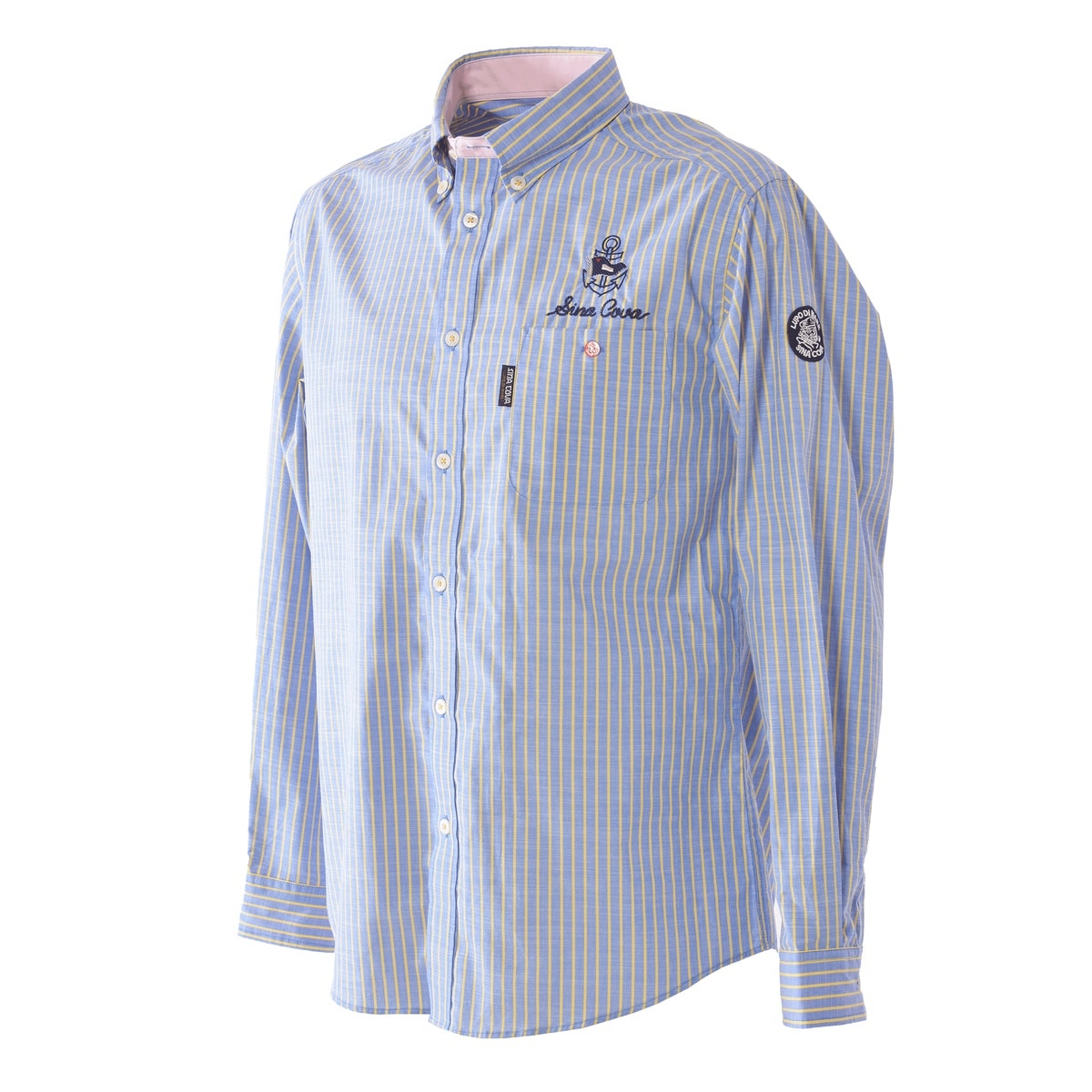 ポケット上部に「SINA COVA」文字とイカリのモチーフ、左スリーブに「Per chi ama il mare」の文字刺繍をデザインしたストライプ柄ボタンダウンシャツです。