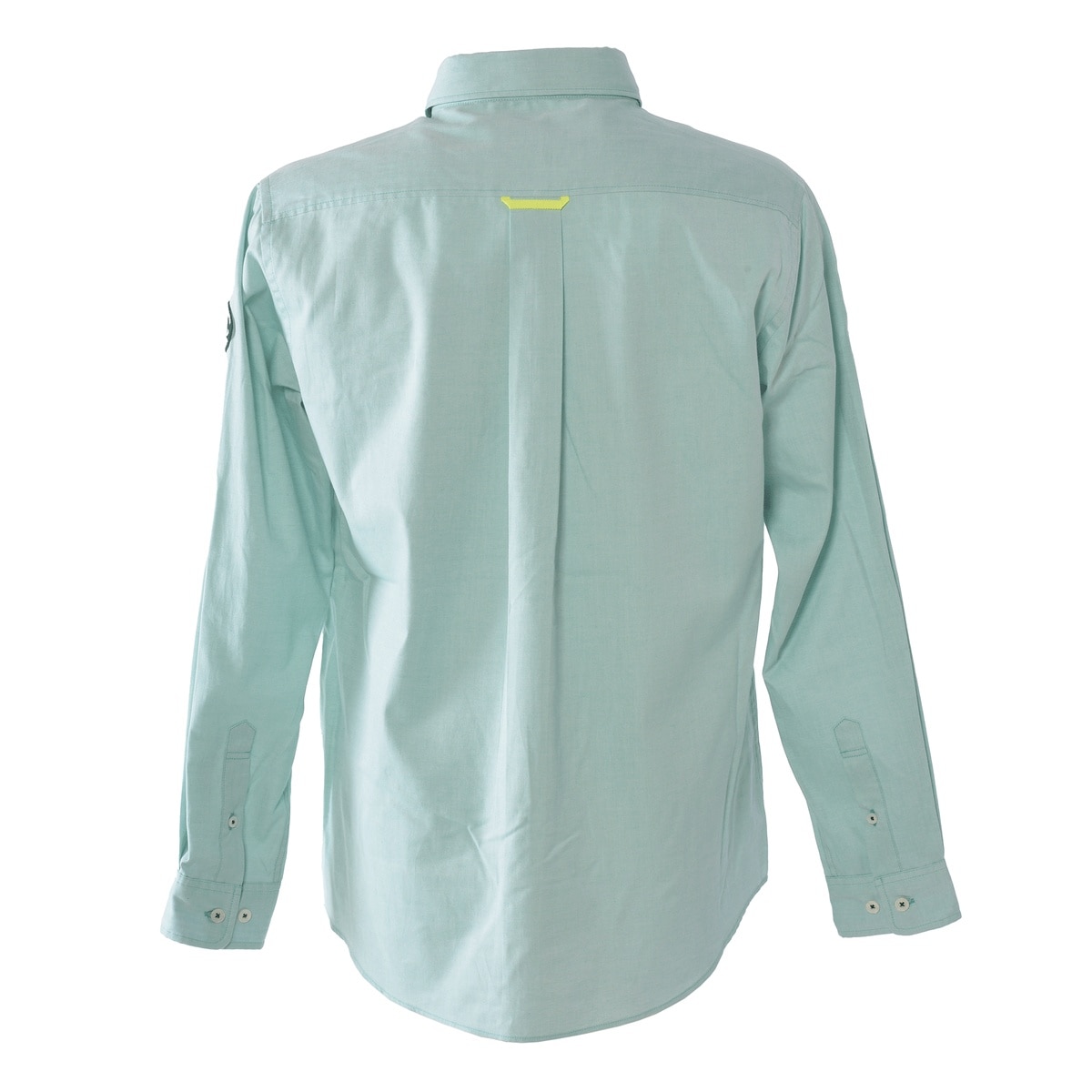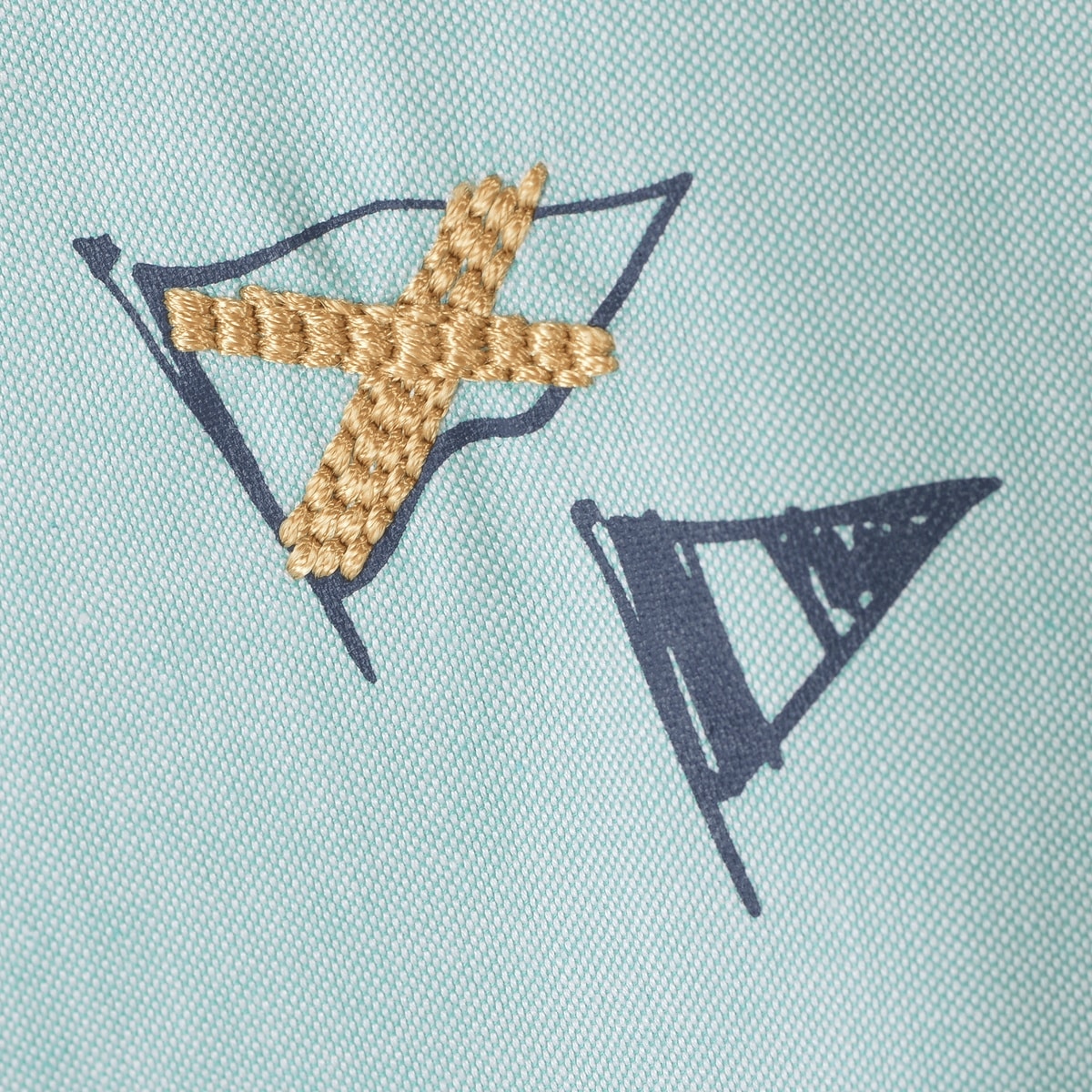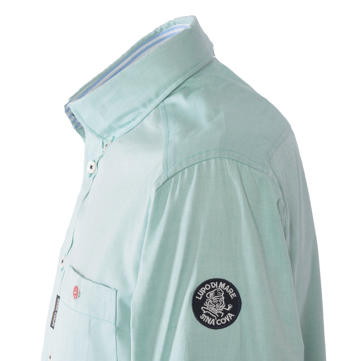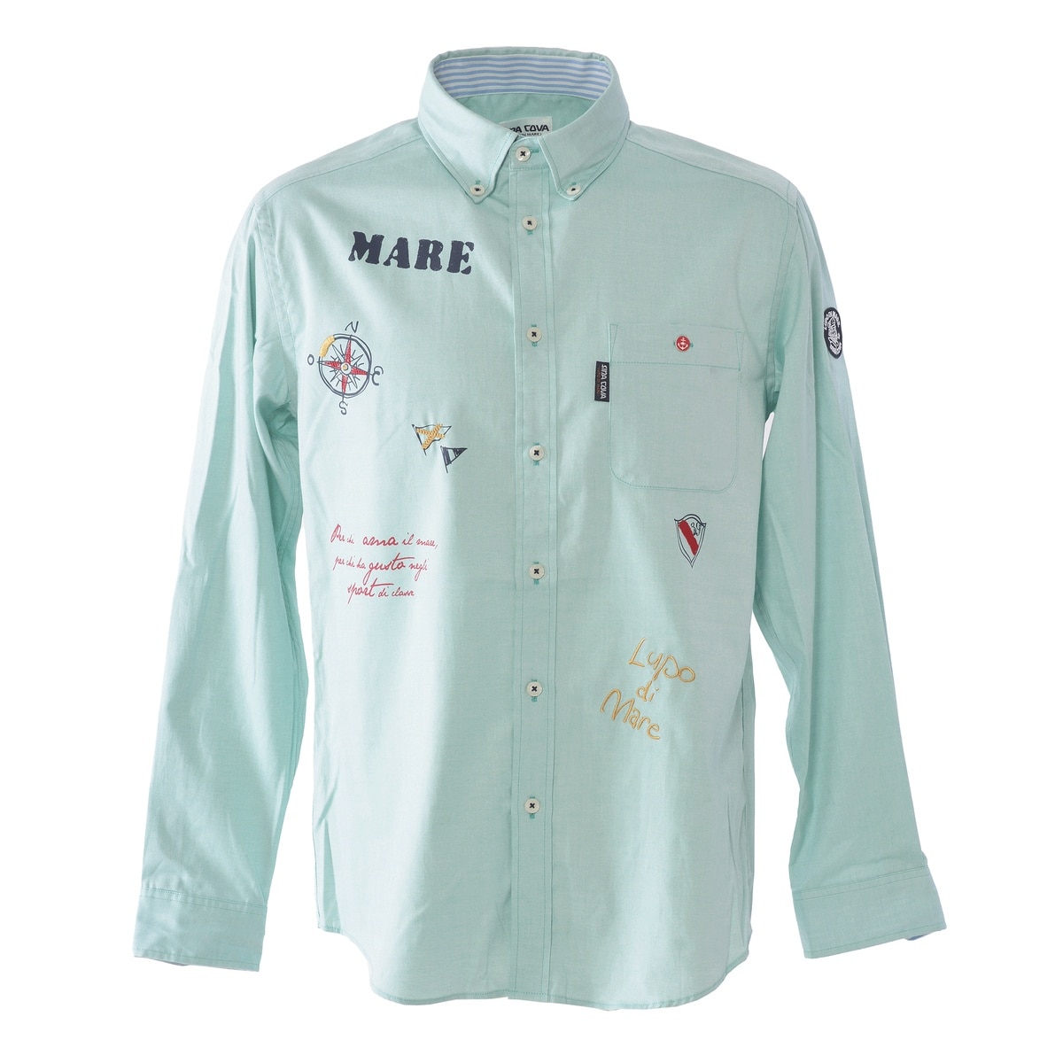 縦横ともに80/2双糸で作られたオックスフォード生地で肌触りもよく軽い感じが特長の素材を使用したカジュアルシャツに仕上げています。台衿内側とカフス裏には別布のボーダーを横使いし、後ろのボックスタック部分のハンガーフックに蛍光色のグログランテープを使用。ロゴやフラッグなどのマリンイメージのモチーフをプリントと刺繍で施した商品です。