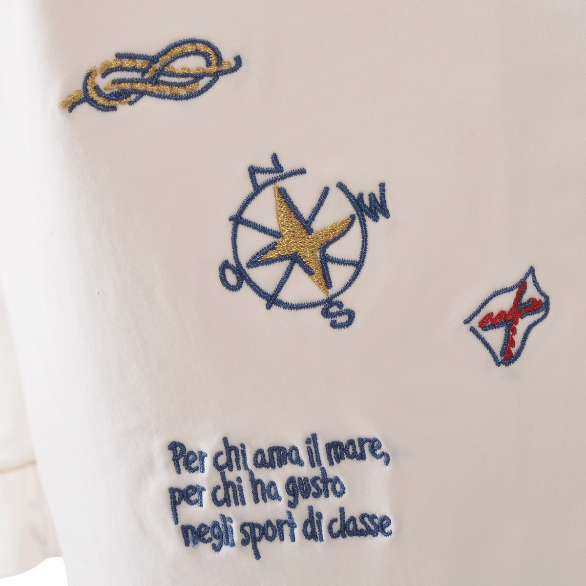 経糸に60番手の細番手を使用し緯糸に40番手のストレッチ性のある糸を打ち込んで、サテン組織で織り上げ、光沢感があり、柔らかく、軽くて伸びのある素材を使用しました。ウエストシャーリングで、3か所に王冠、ロゴ、イカリなどをラフな感じで刺繍を施し、総柄とはまた違う遊び心を入れたショートパンツにしました。同系色の配色と太番手のステッチワーク、カンドメ配色が魅力の商品です。