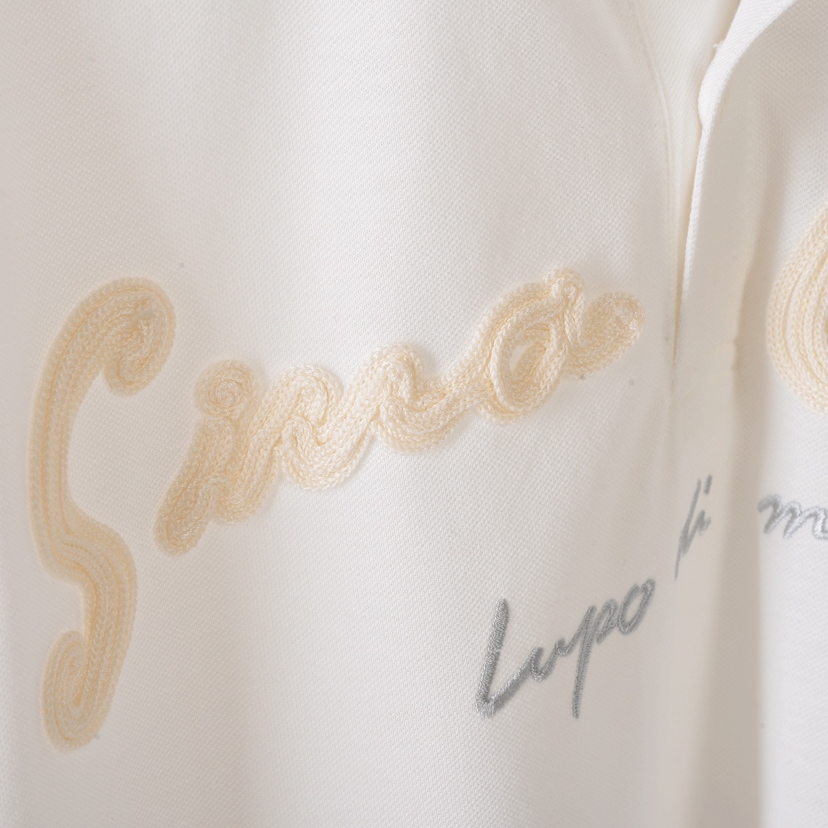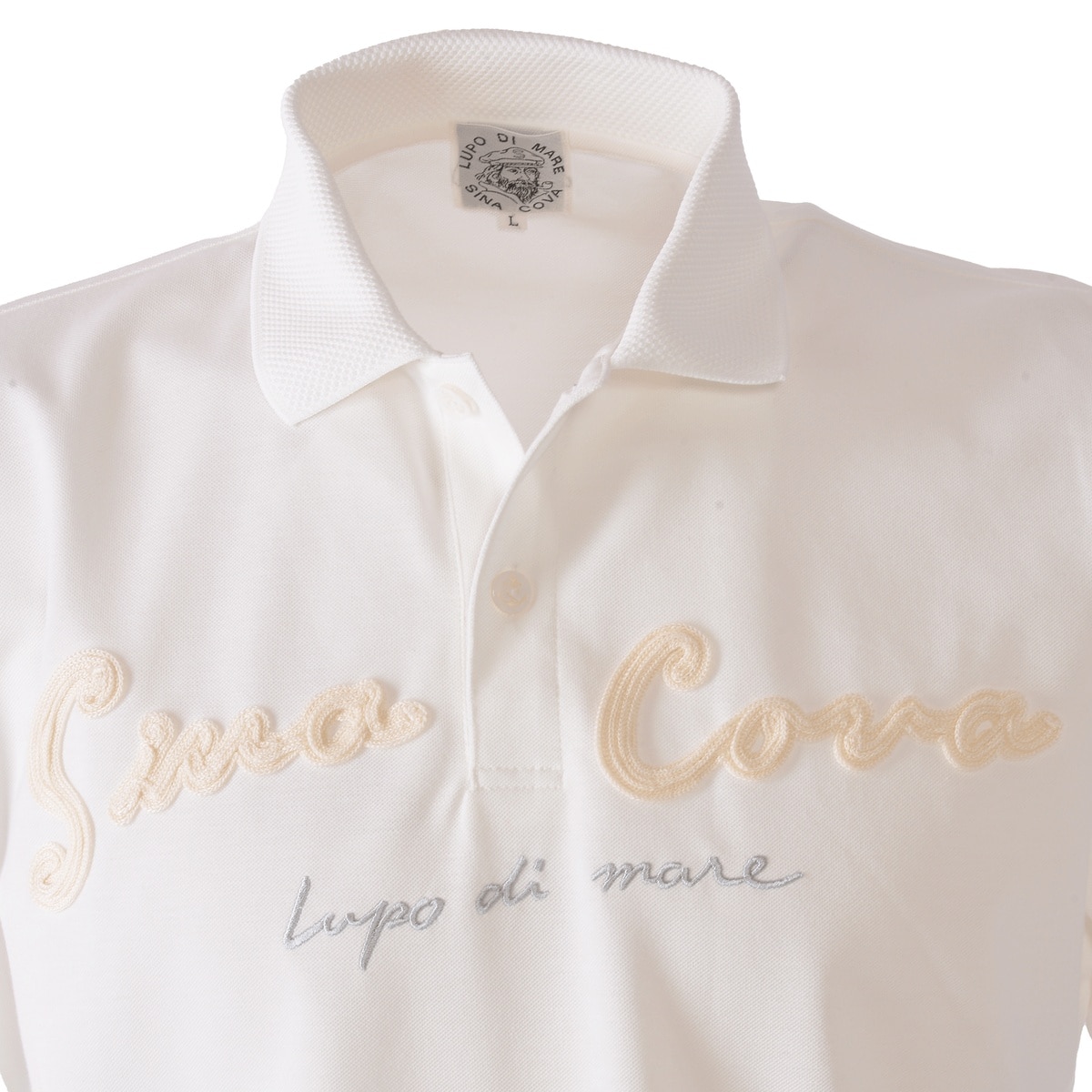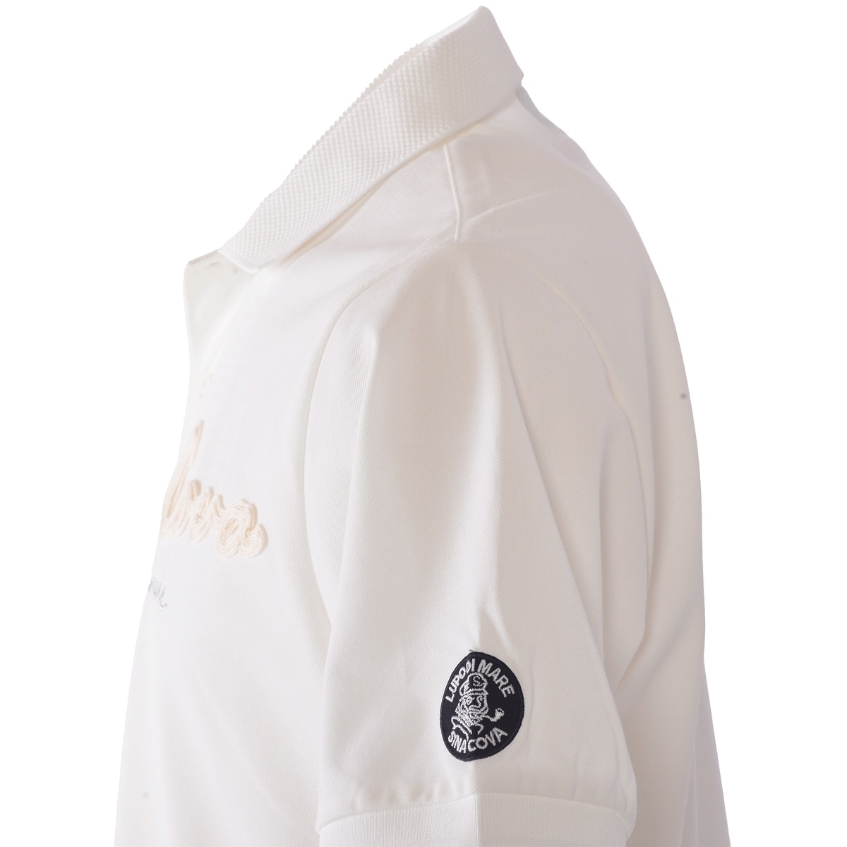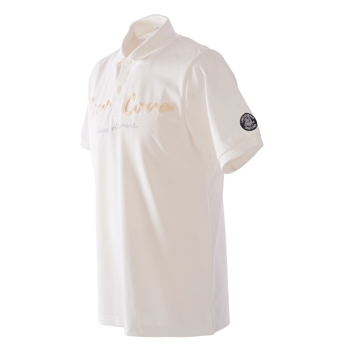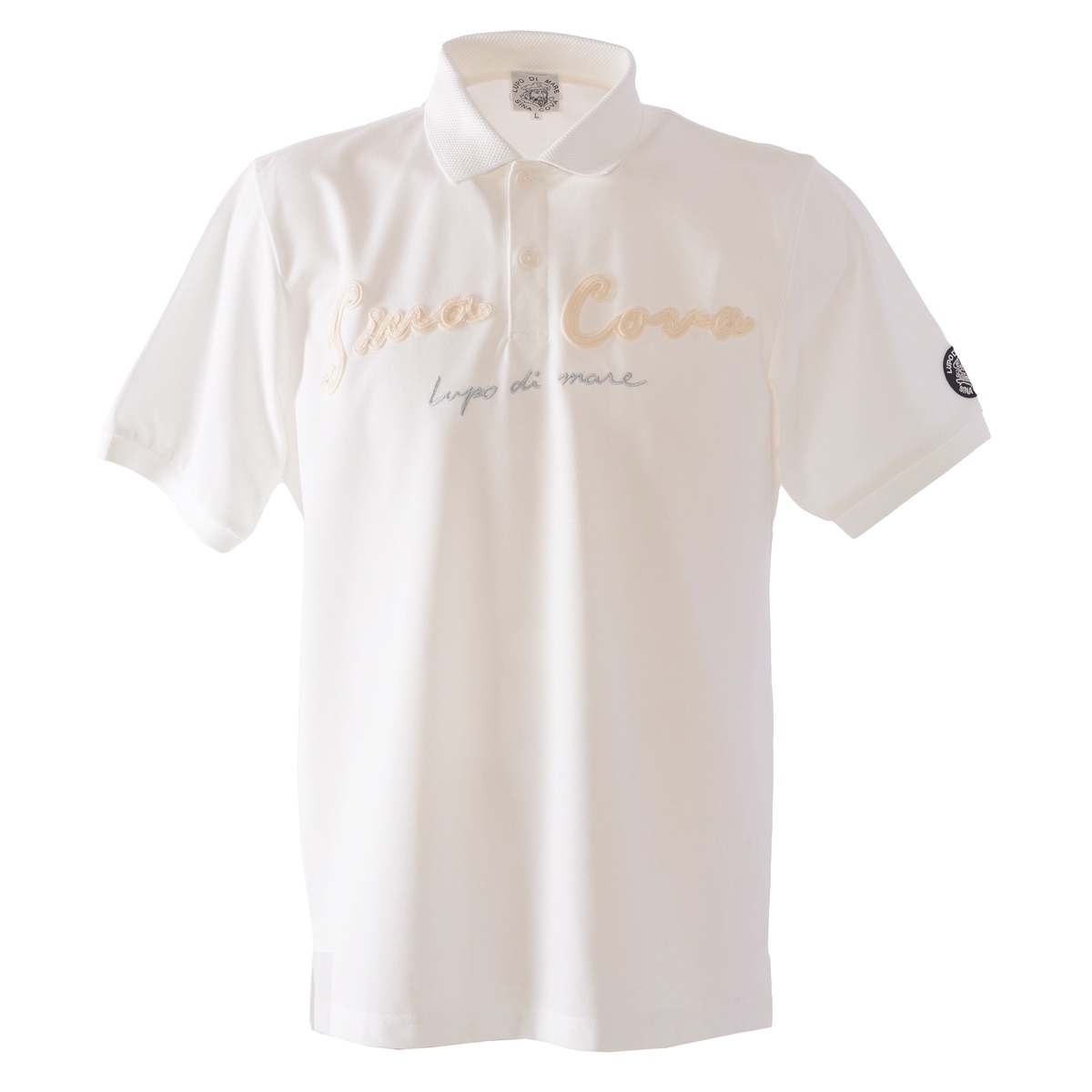 衿に「SINA COVA」ロゴをジャガードでデザインし胸元と袖にワンポイントワッペンモチーフを付けた半袖ポロシャツです。