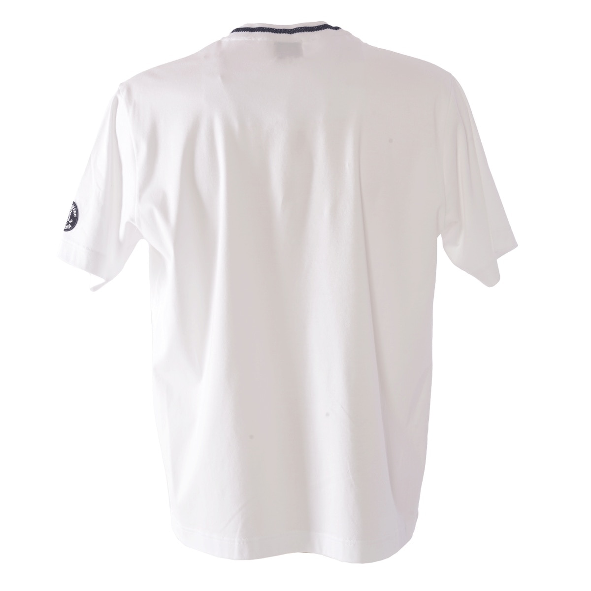 フロントにパイルとチェーン刺繍で立体感のあるロゴを入れ、ネック部分はメッシュ調のラインをデザインした半袖Tシャツです。
