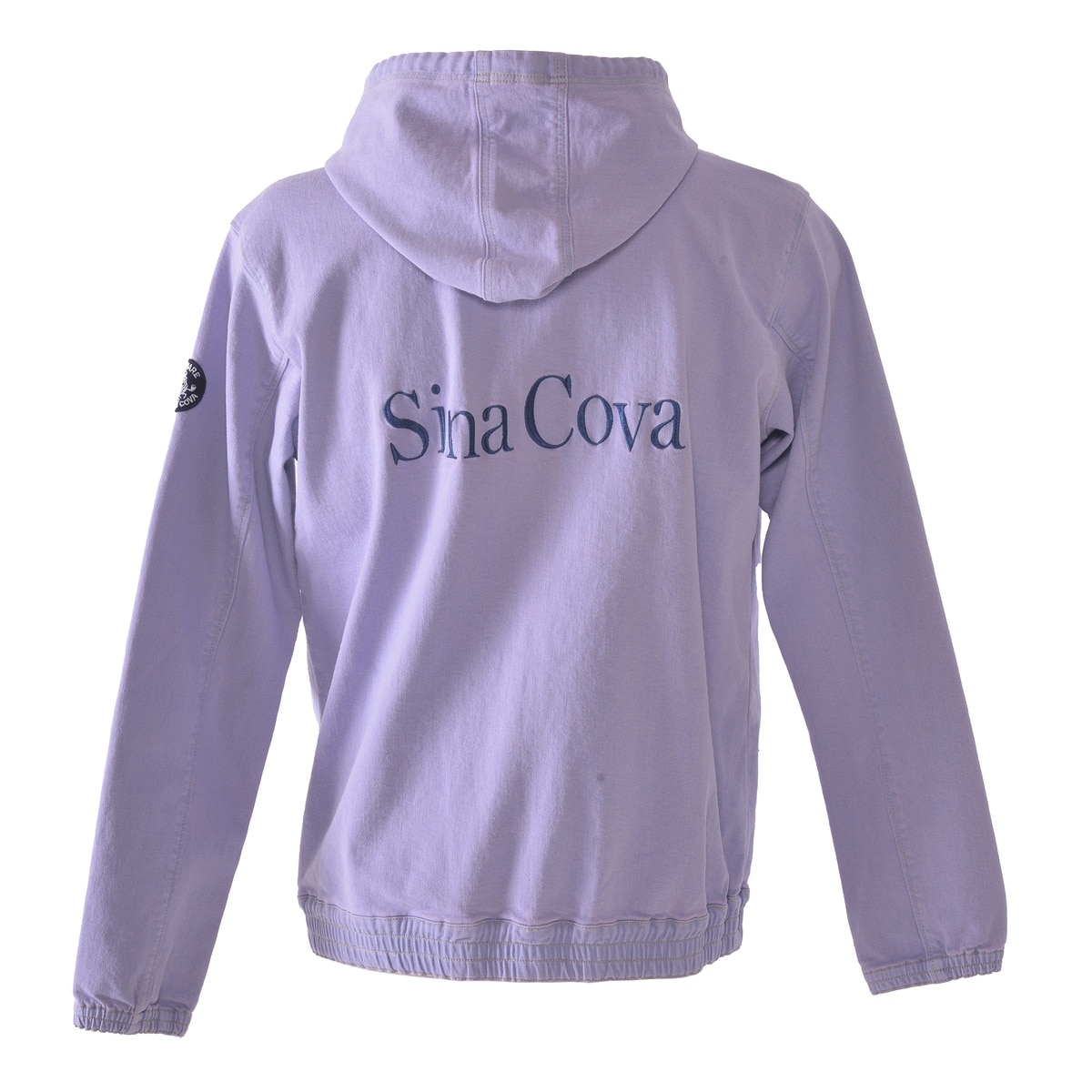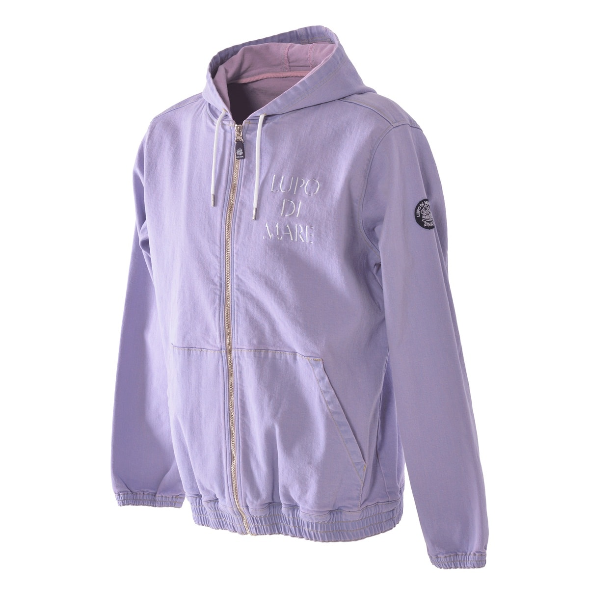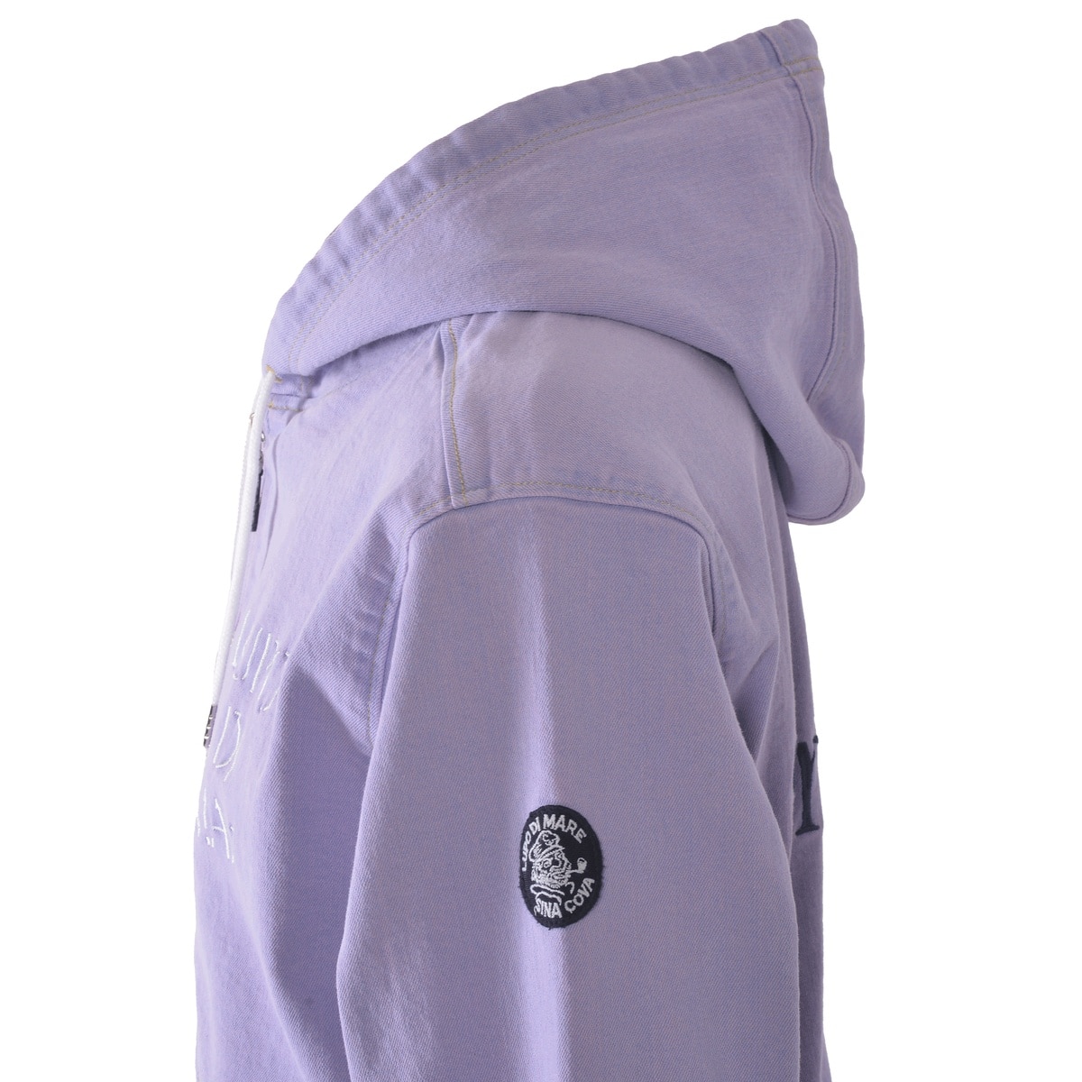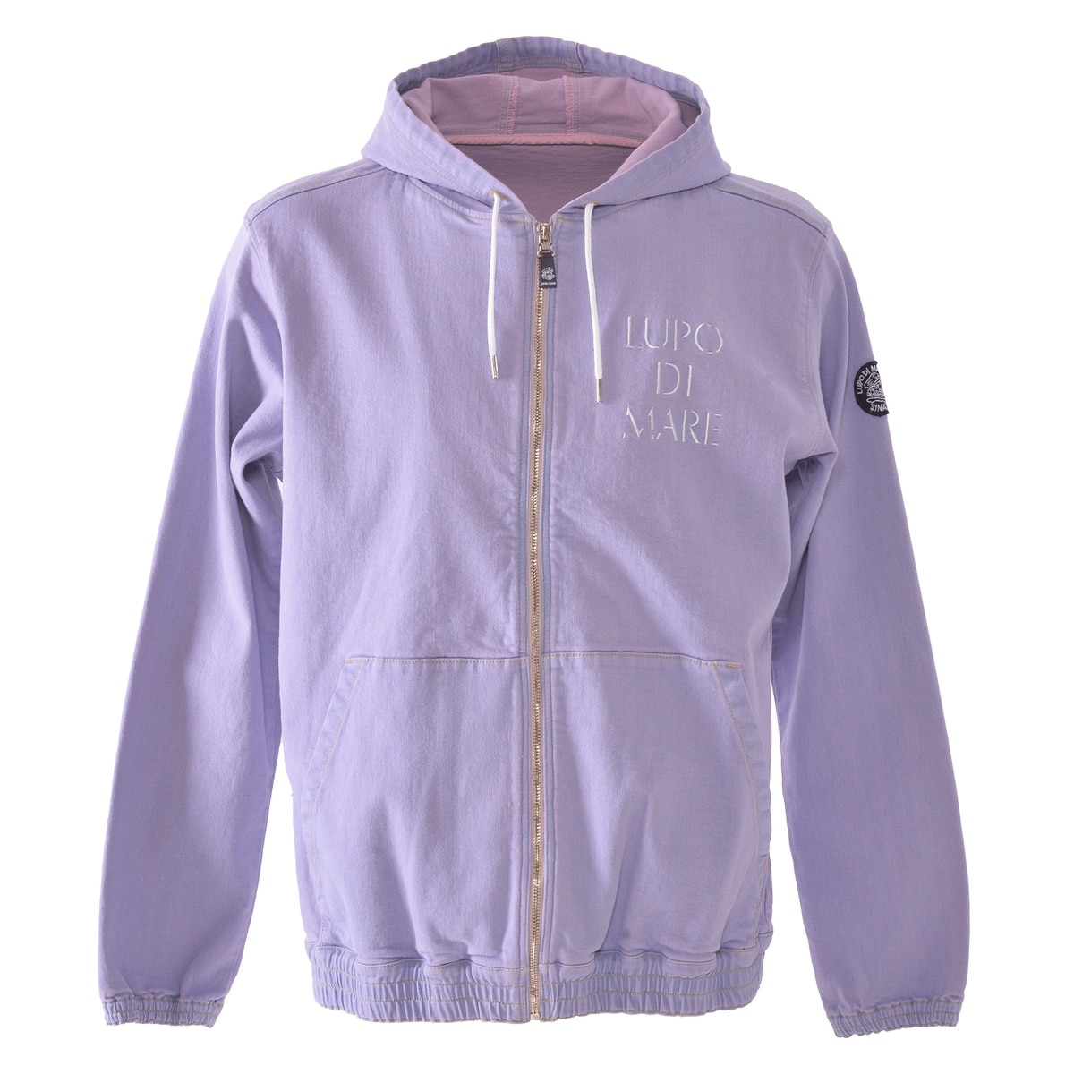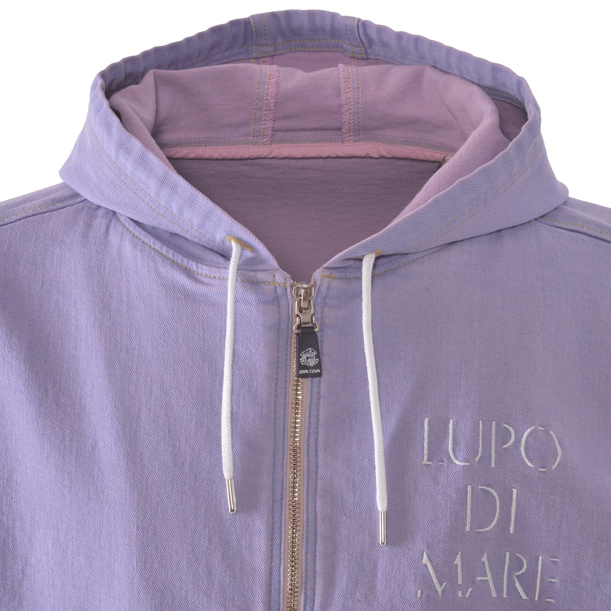 フロントに「LUPO DI MARE」、バックに「SINA COVA」文字を刺繍でデザインしたジップアップパーカーです。