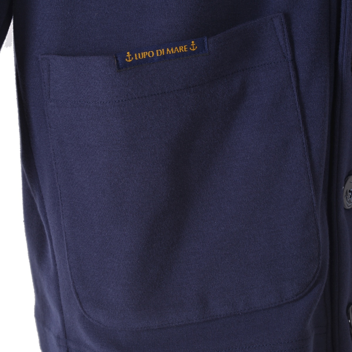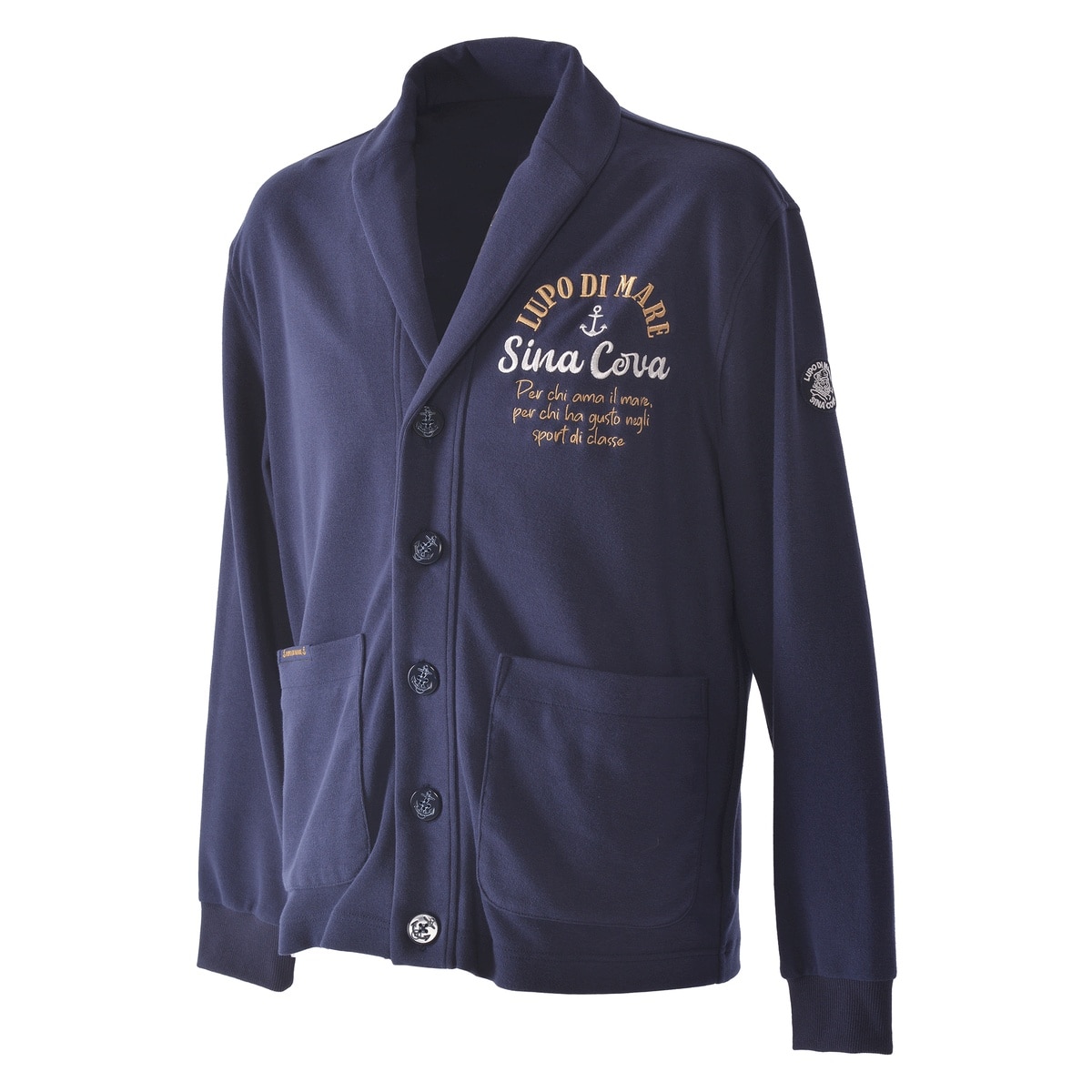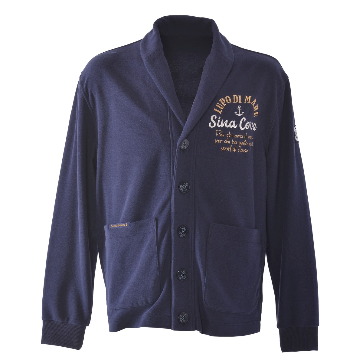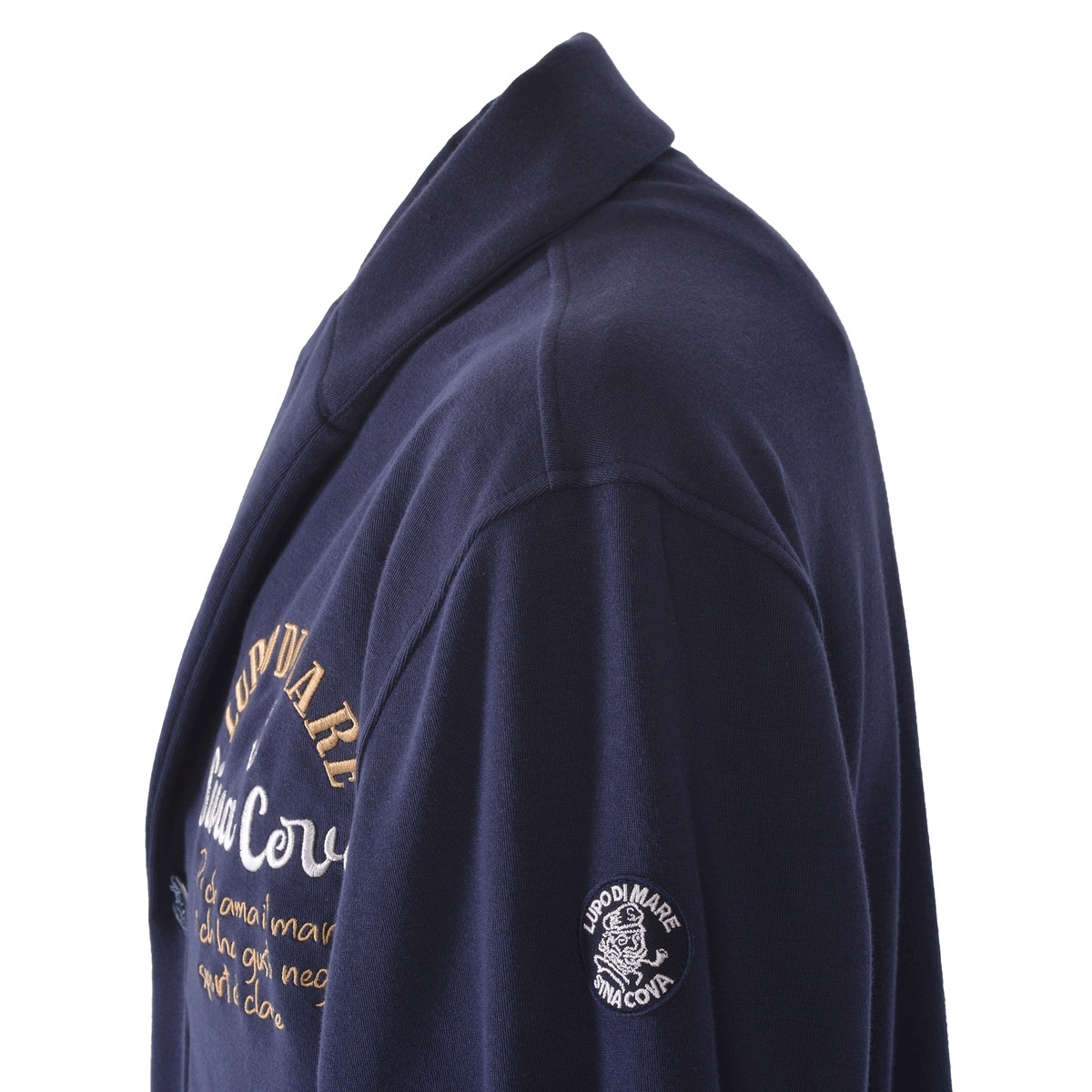 左胸にレターモチーフの「SINA COVA」文字刺繍をデザインしたショールカラージャケットです。