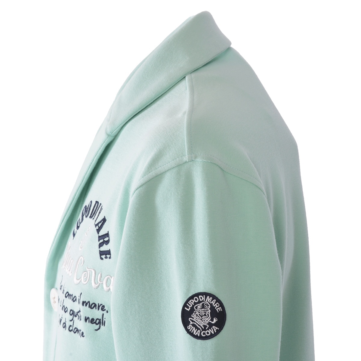 左胸にレターモチーフの「SINA COVA」文字刺繍をデザインしたショールカラージャケットです。