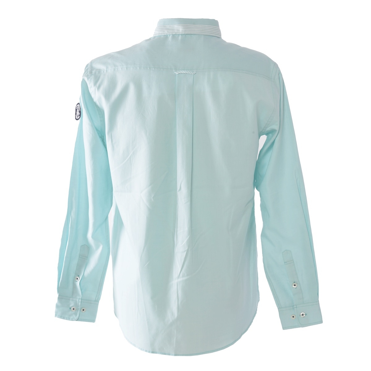 春夏向けに柔らかく肌ざわりの良い風合いの素材を使用し、ドレスからカジュアルまで活躍するシルエットです。超長綿のGIZAコットンを100%使用し、シルキーな光沢感と柔らかなタッチが魅力です。通気性が良く汗をかいても肌にはりつきにくく、薄手ですが目が詰まっているので透け感は比較的あまり気にせず着用できます。同素材のストライプ柄を衿で切り替えたデザインが最大の特徴で、カフス裏やハンガーループにも同素材が使われています。全体のムードを壊さないように、右胸に同素材でブランドの頭文字のアップリケ刺繍を施しております。