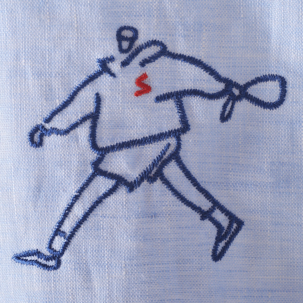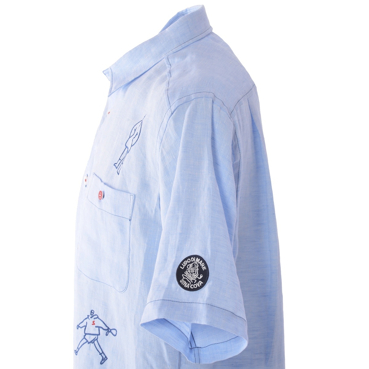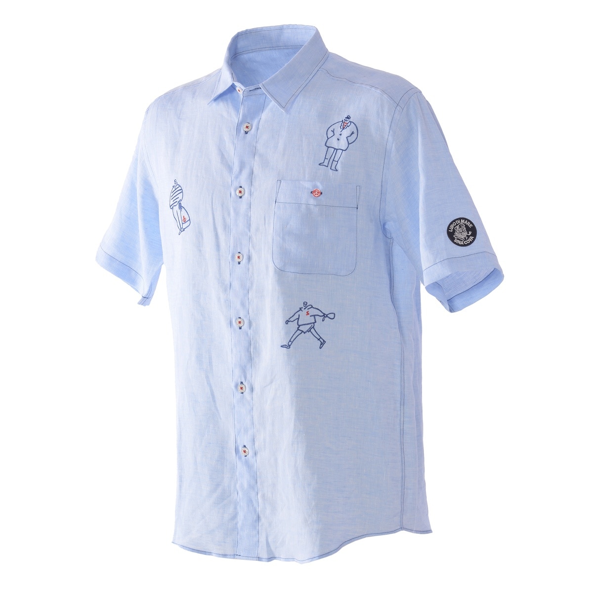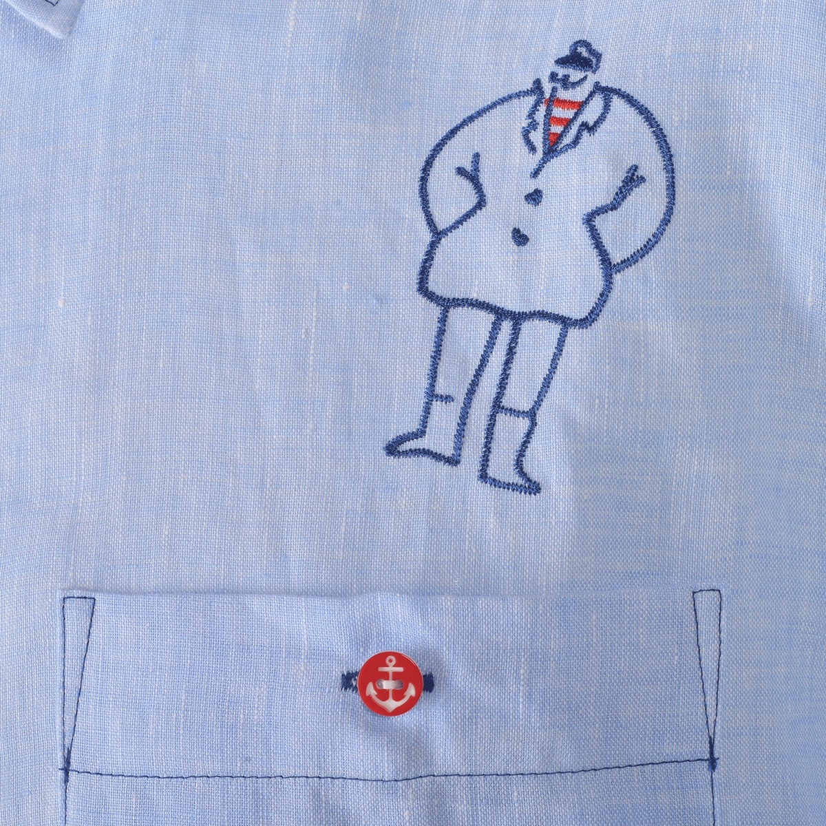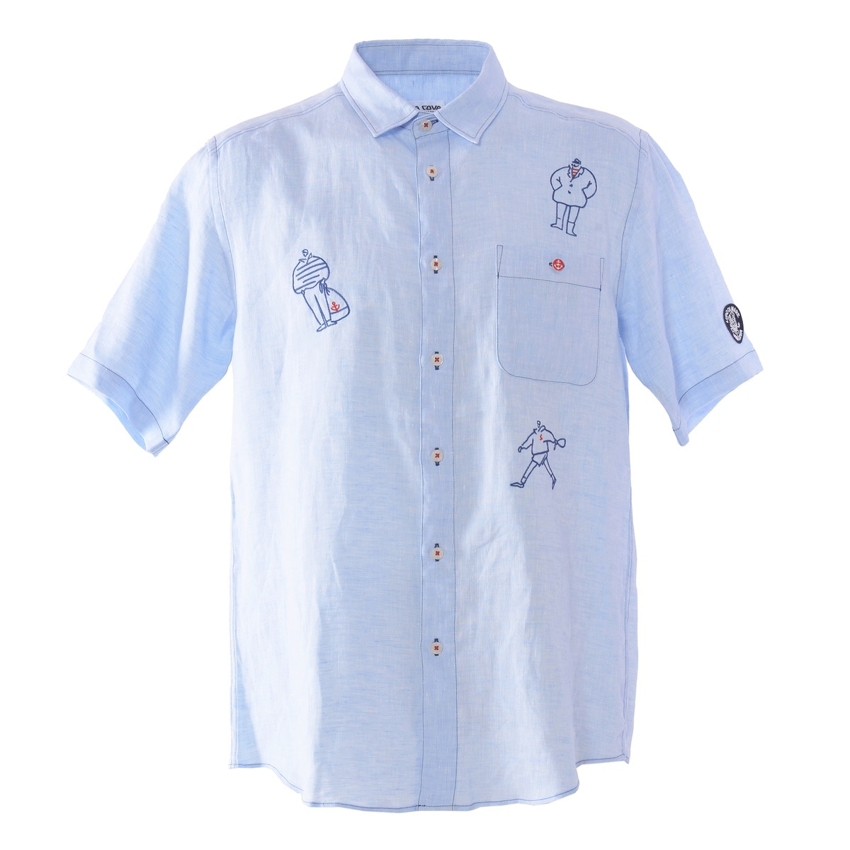 キャンプテンとクルーの刺繍をフロントには前面にバックには右裾にさり気なくデザインした麻100%半袖レギュラーシャツです。