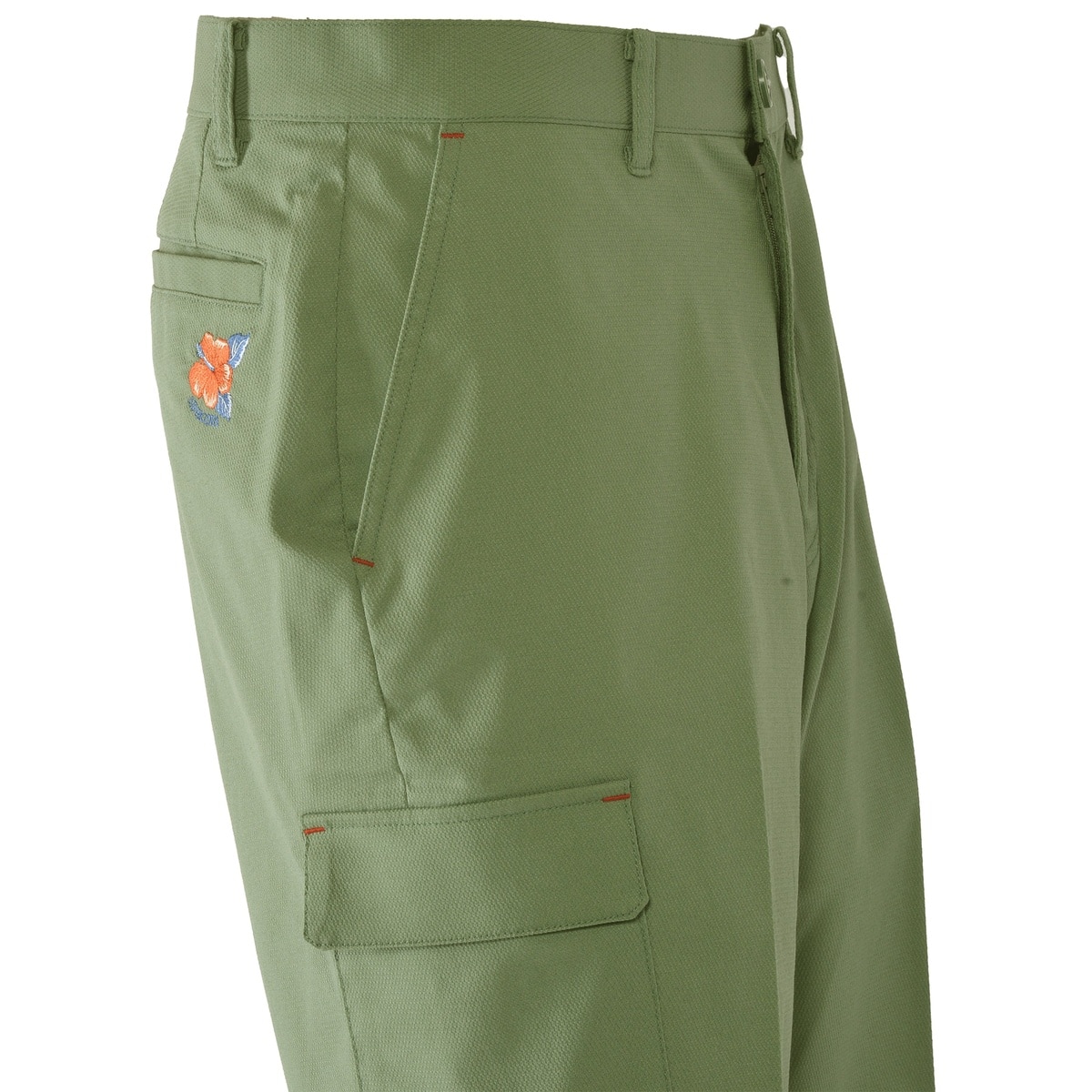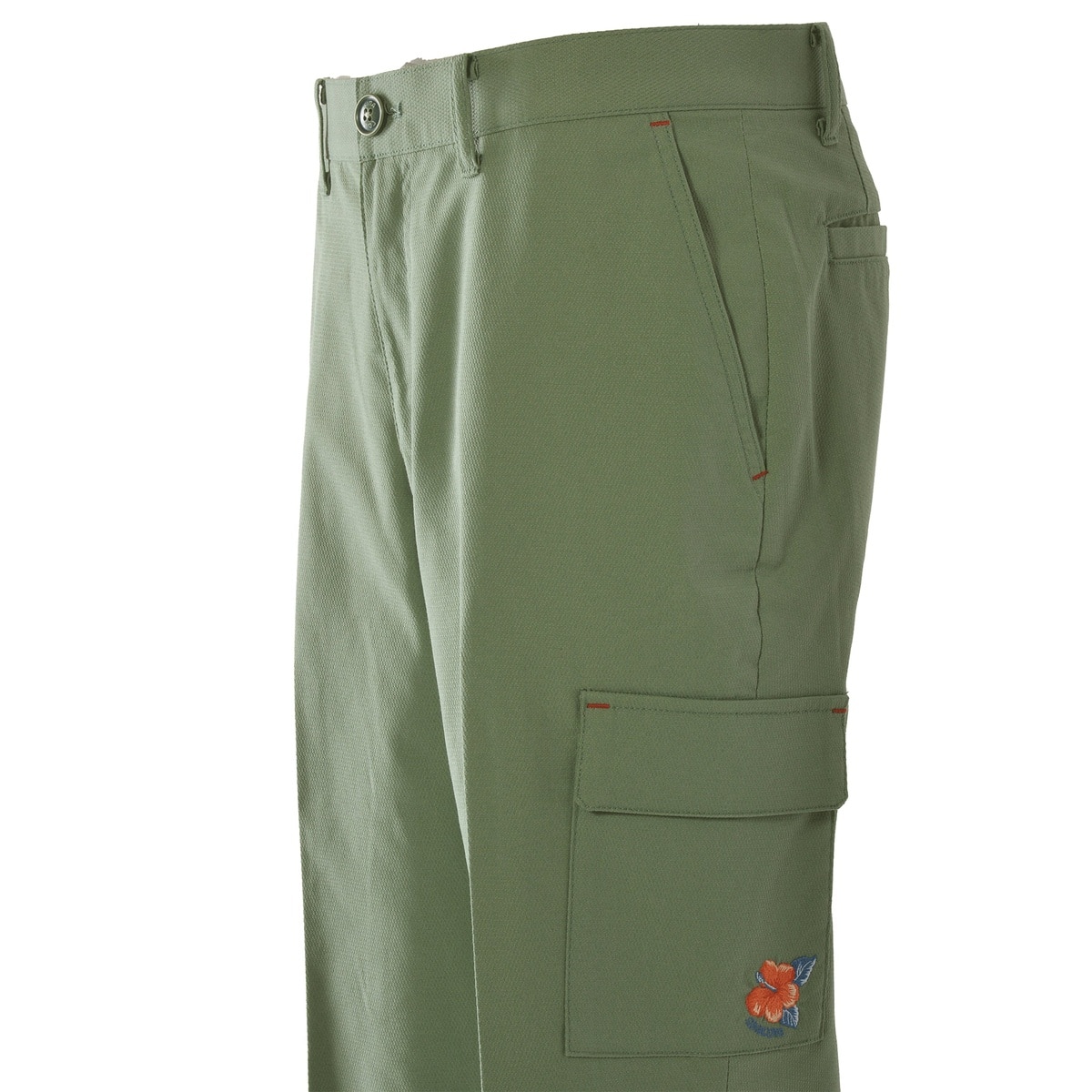 サイドポケットとバックポケットにハイビスカスモチーフを刺繍でデザインしたノータックカーゴパンツです。