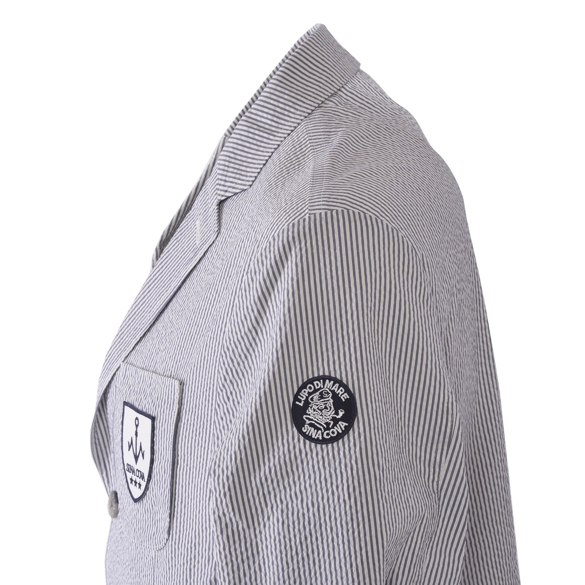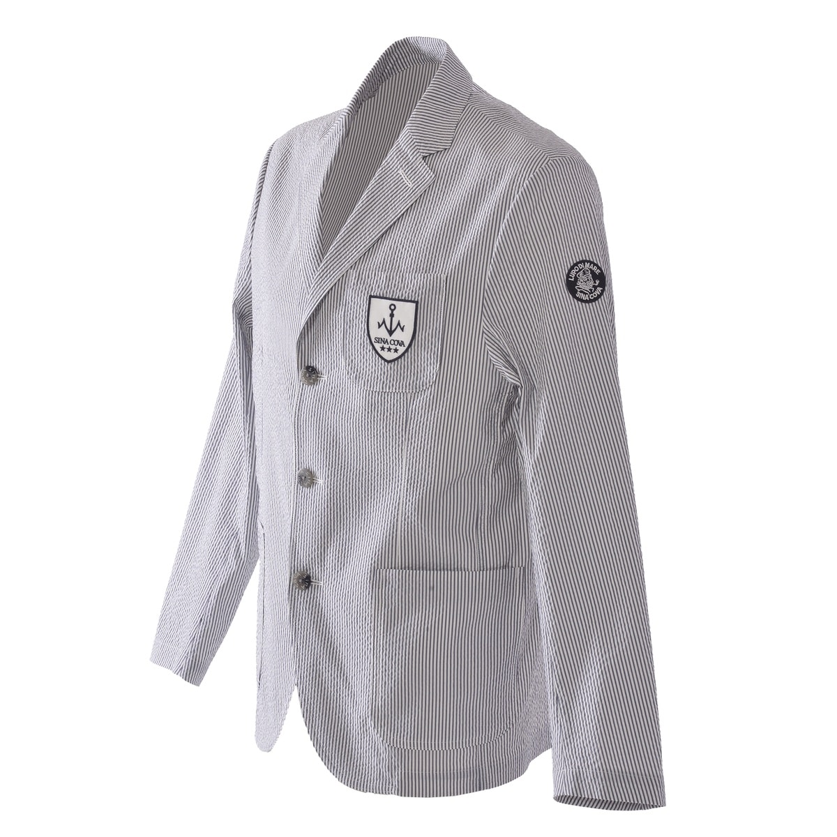 胸ポケットにエンブレムをデザインしたスリーボタンのストライプ柄とギンガムチェック柄のテーラードジャケットです。