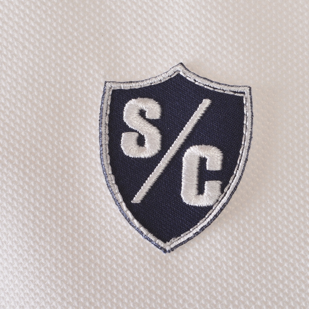 衿に「SINA COVA」ロゴをジャガードでデザインし胸元と袖にワンポイントワッペンモチーフを付けた半袖ポロシャツです。