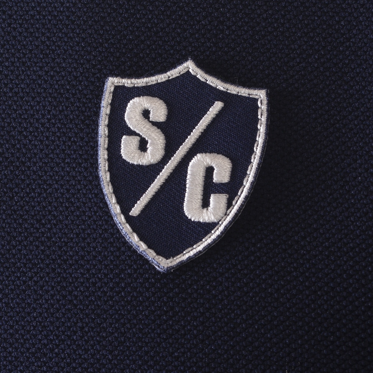 衿に「SINA COVA」ロゴをジャガードでデザインし胸元と袖にワンポイントワッペンモチーフを付けた半袖ポロシャツです。