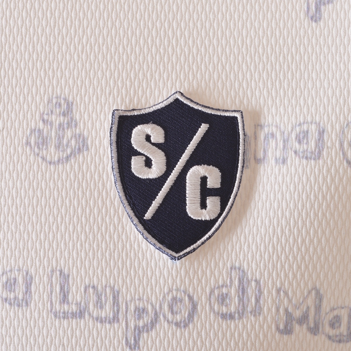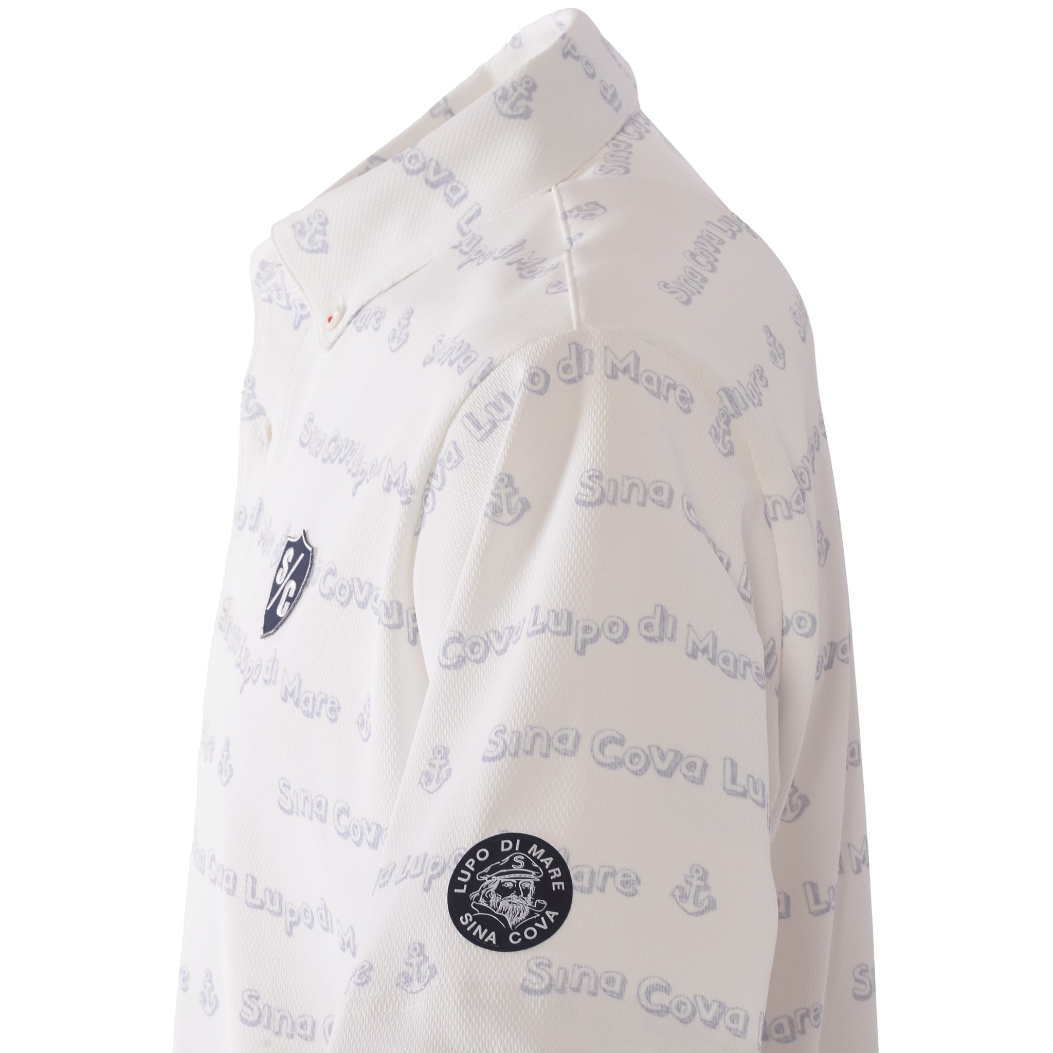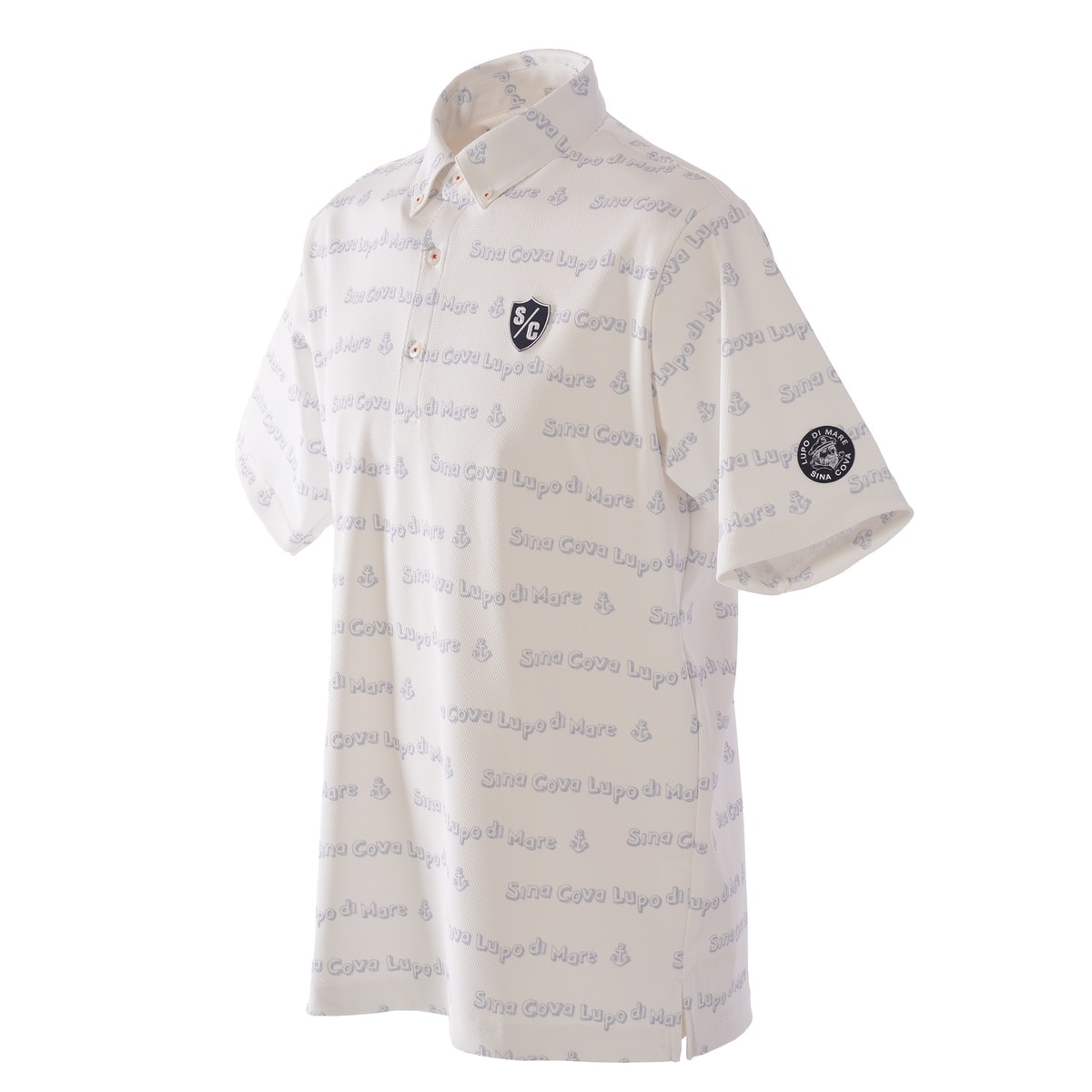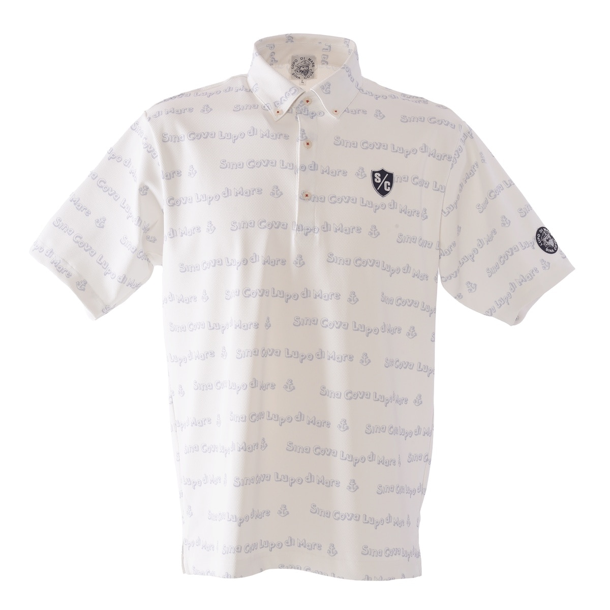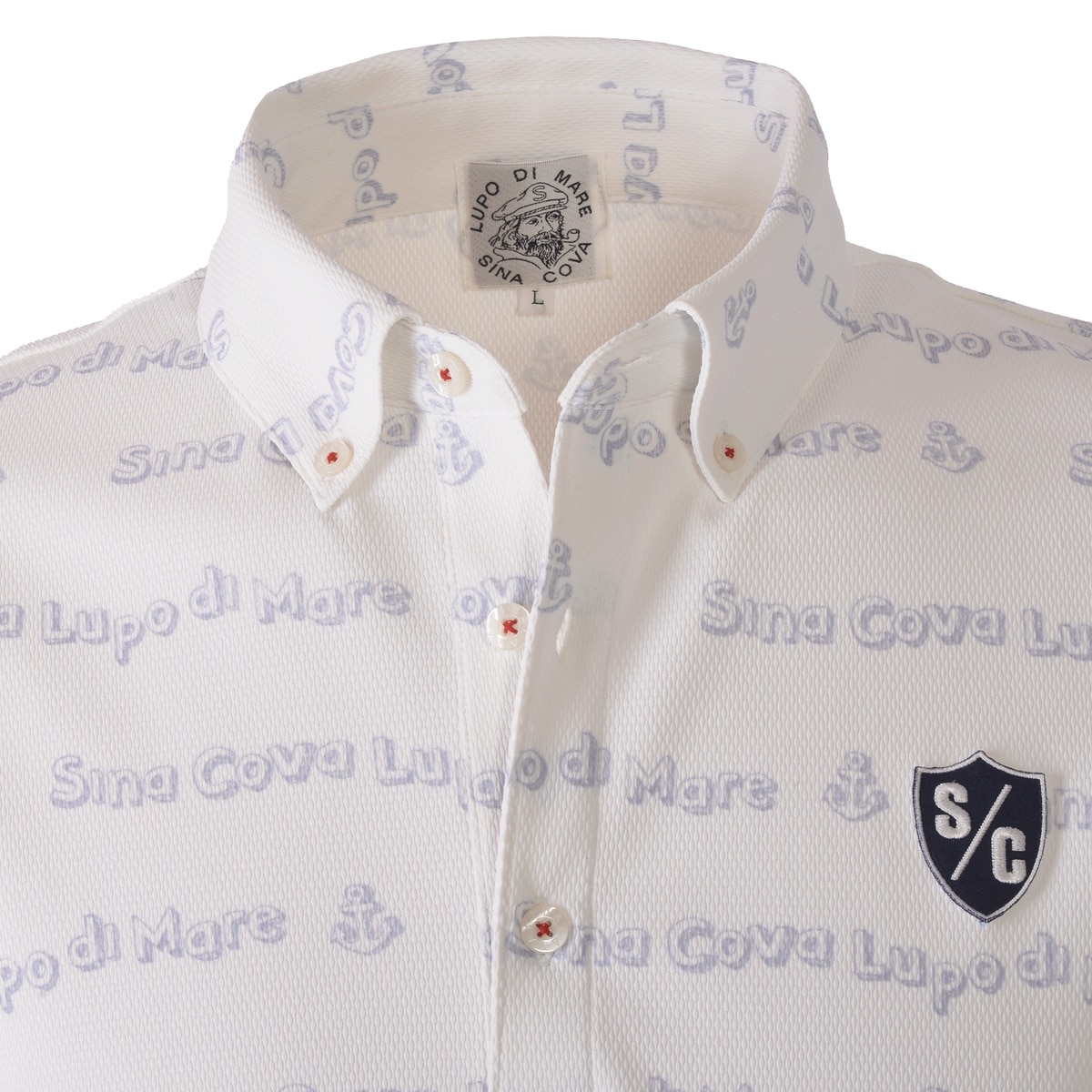 ネックに「SINA COVA」刺繍、総柄で「SINA COVA」「LUPO DI MARE」のプリントを楽譜の音符の様にウェーブで配置したポップなデザインの半袖ボタンダウンシャツです。