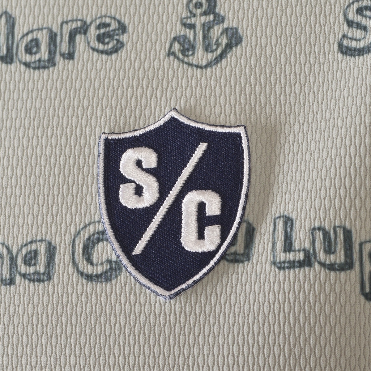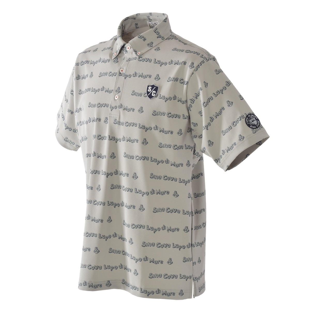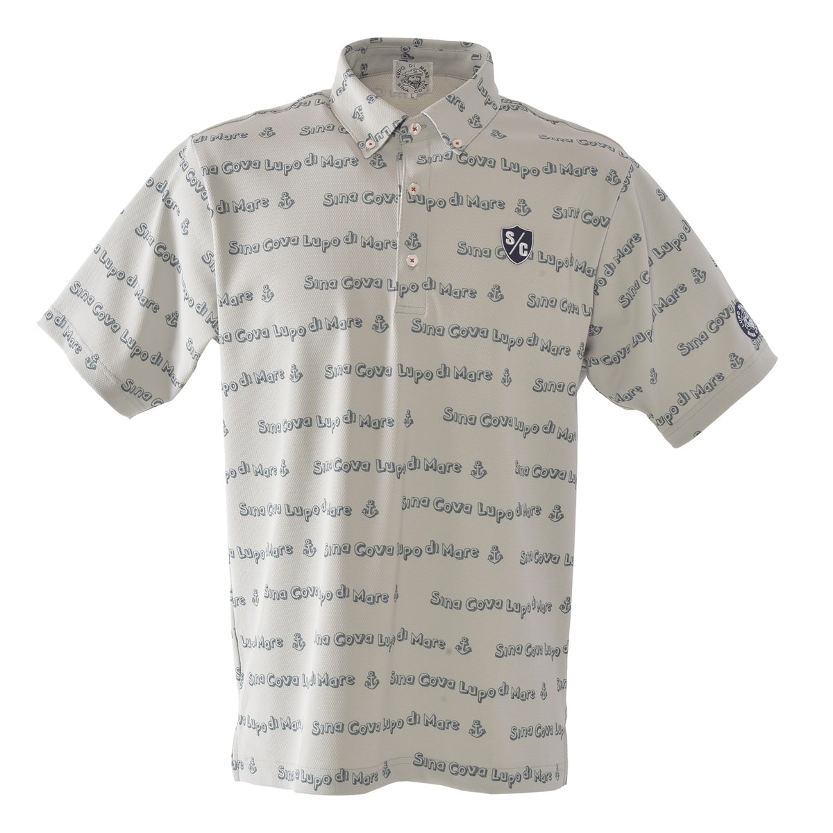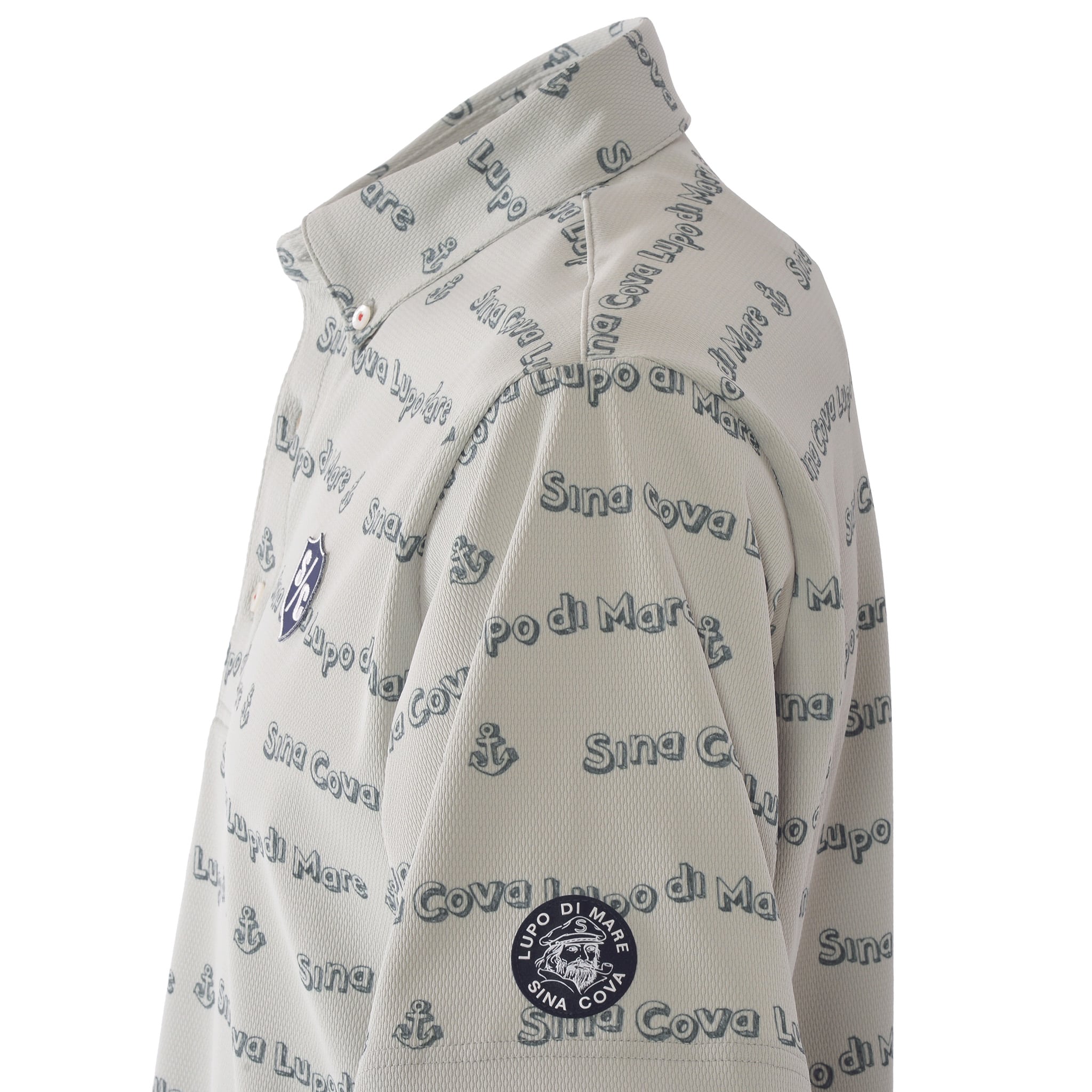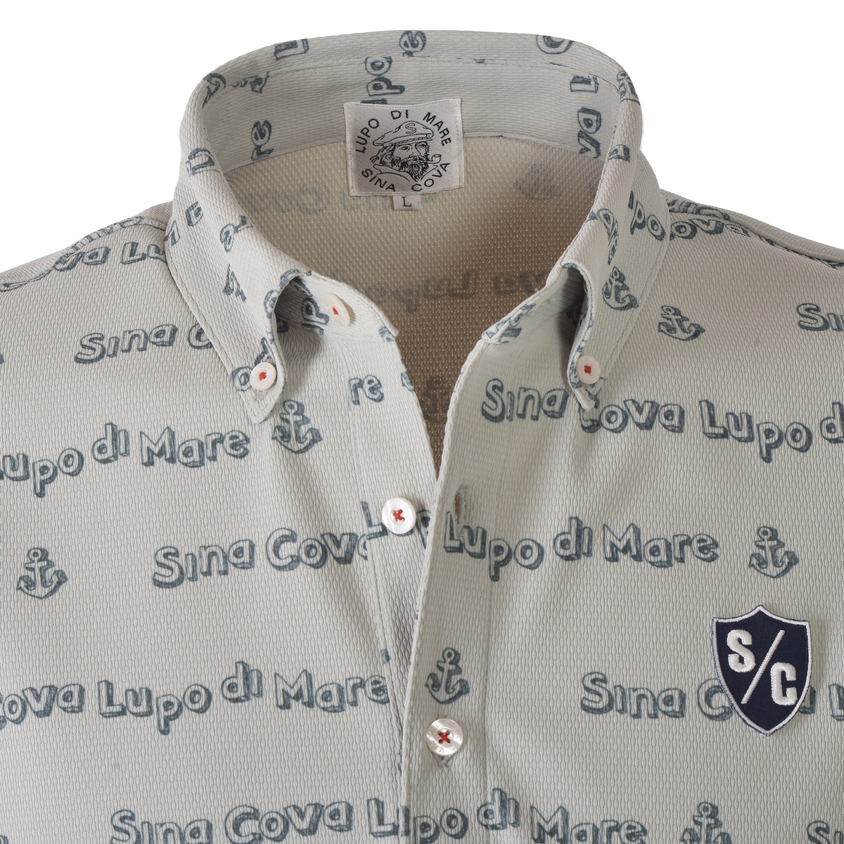 ネックに「SINA COVA」刺繍、総柄で「SINA COVA」「LUPO DI MARE」のプリントを楽譜の音符の様にウェーブで配置したポップなデザインの半袖ボタンダウンシャツです。