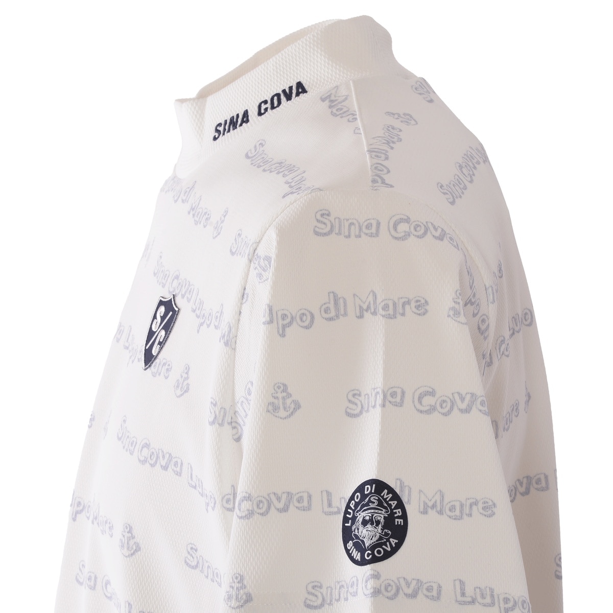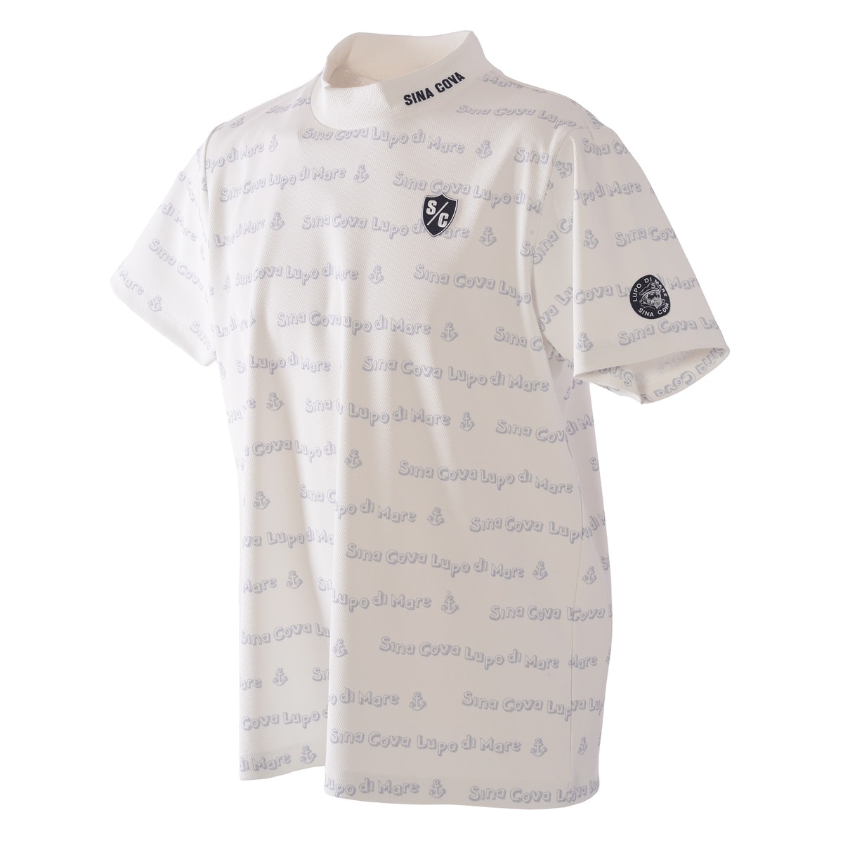 ネックに「SINA COVA」刺繍、総柄で「SINA COVA」「LUPO DI MARE」のプリントを楽譜の音符の様にウェーブで配置したポップなデザインのモックネック半袖Tシャツです。ゴルフのプレイやカジュアルなジャケットスタイルシーンにお勧めです。高機能な素材を使用したポップコーンニット生地で高温多湿な環境でも快適に着用いただけます。・ゴルフウェア・吸水速乾・UVカット・遮熱・防菌防臭・首元の日焼けを防ぐハイネック