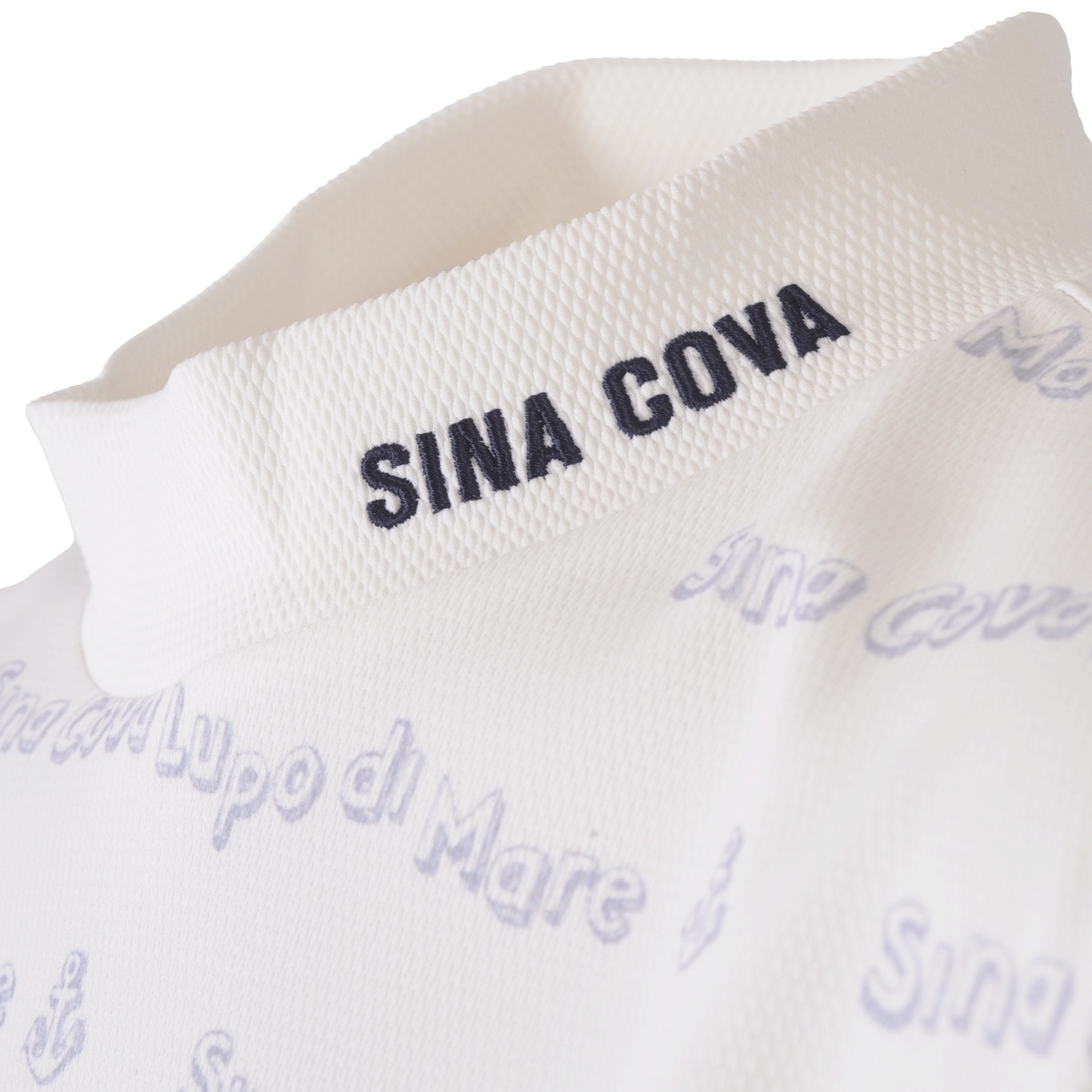 ネックに「SINA COVA」刺繍、総柄で「SINA COVA」「LUPO DI MARE」のプリントを楽譜の音符の様にウェーブで配置したポップなデザインのモックネック半袖Tシャツです。
