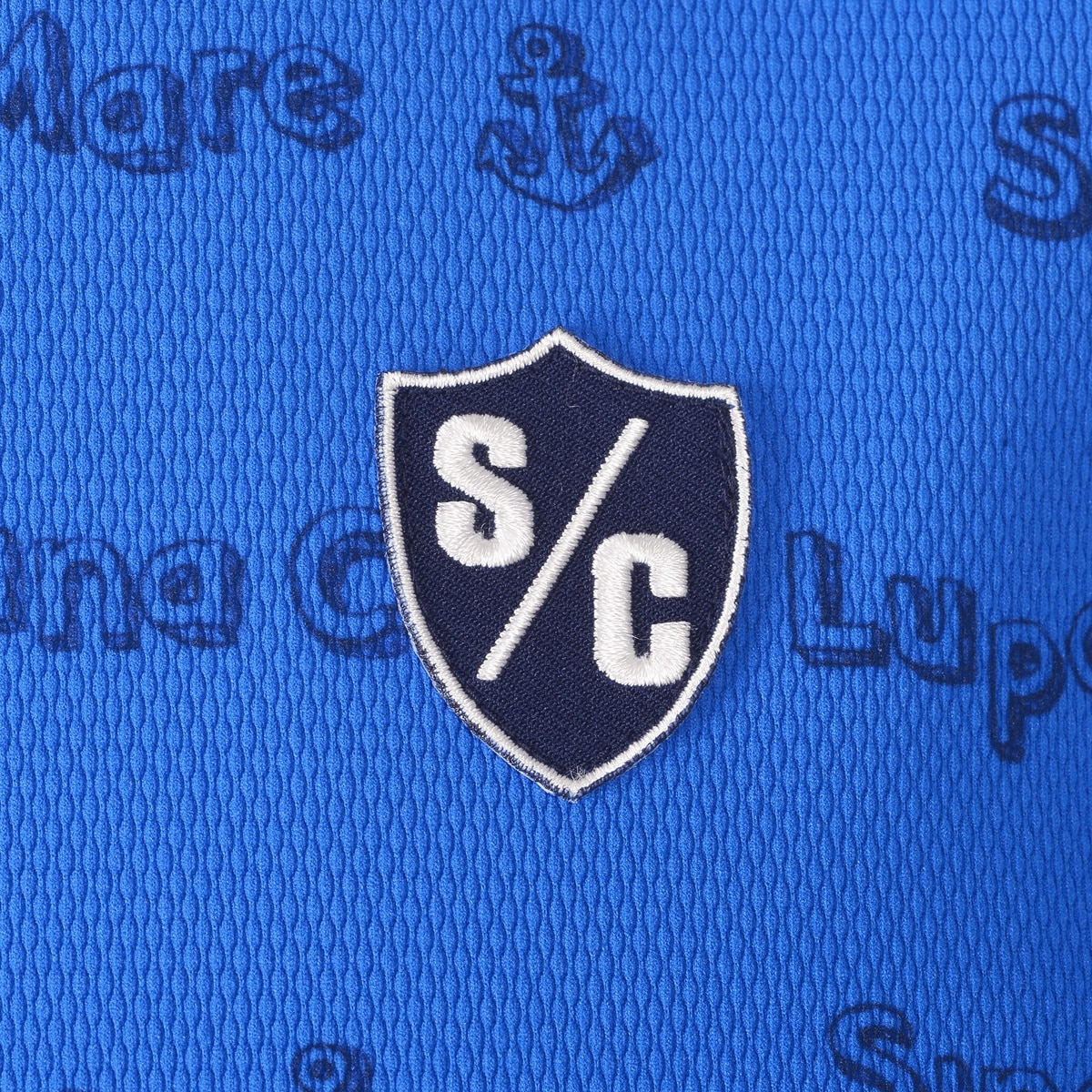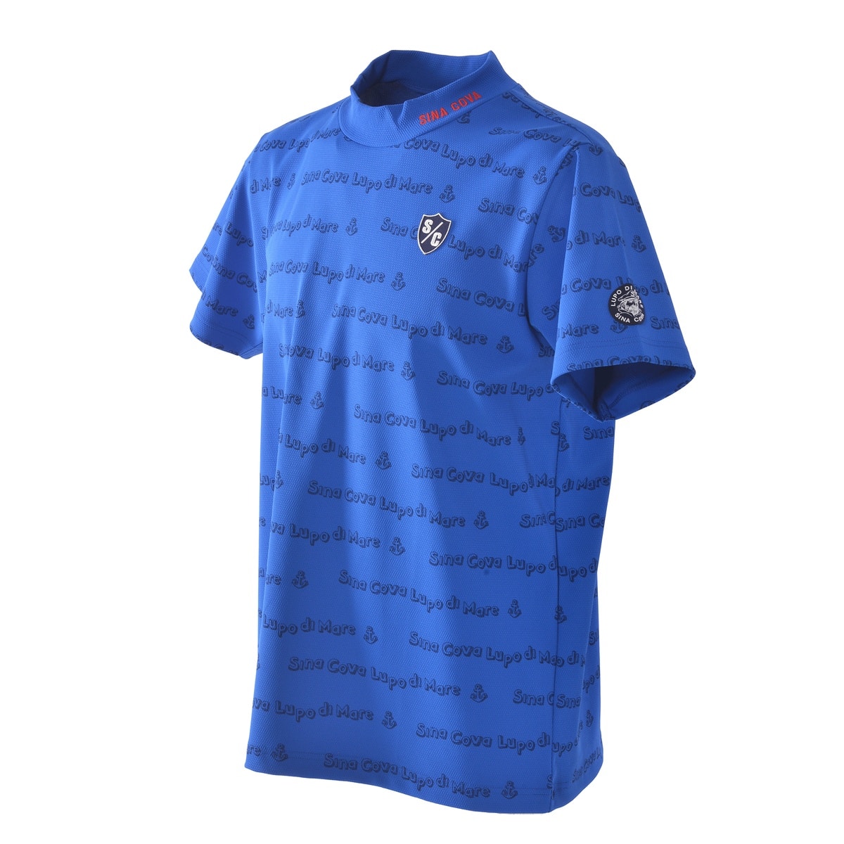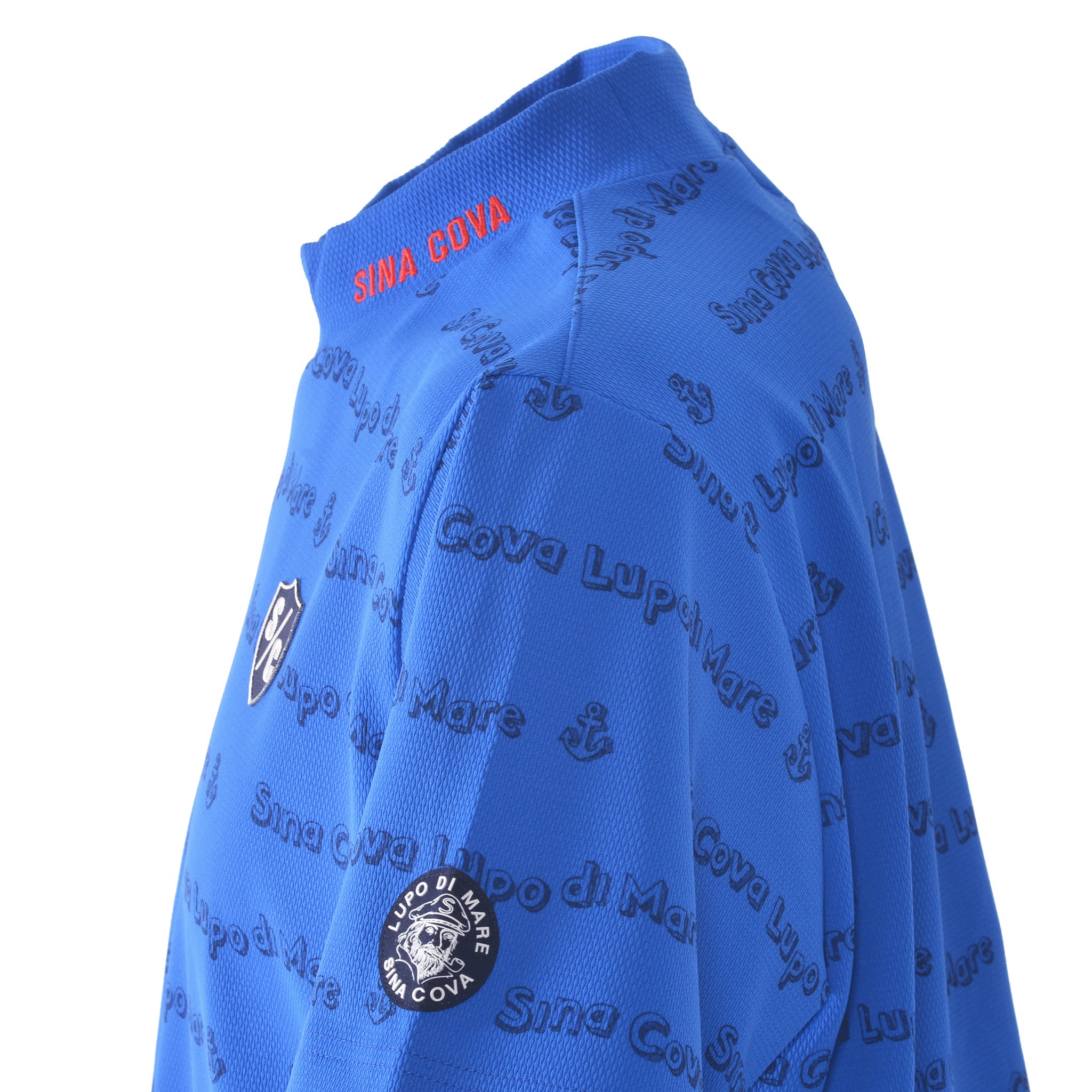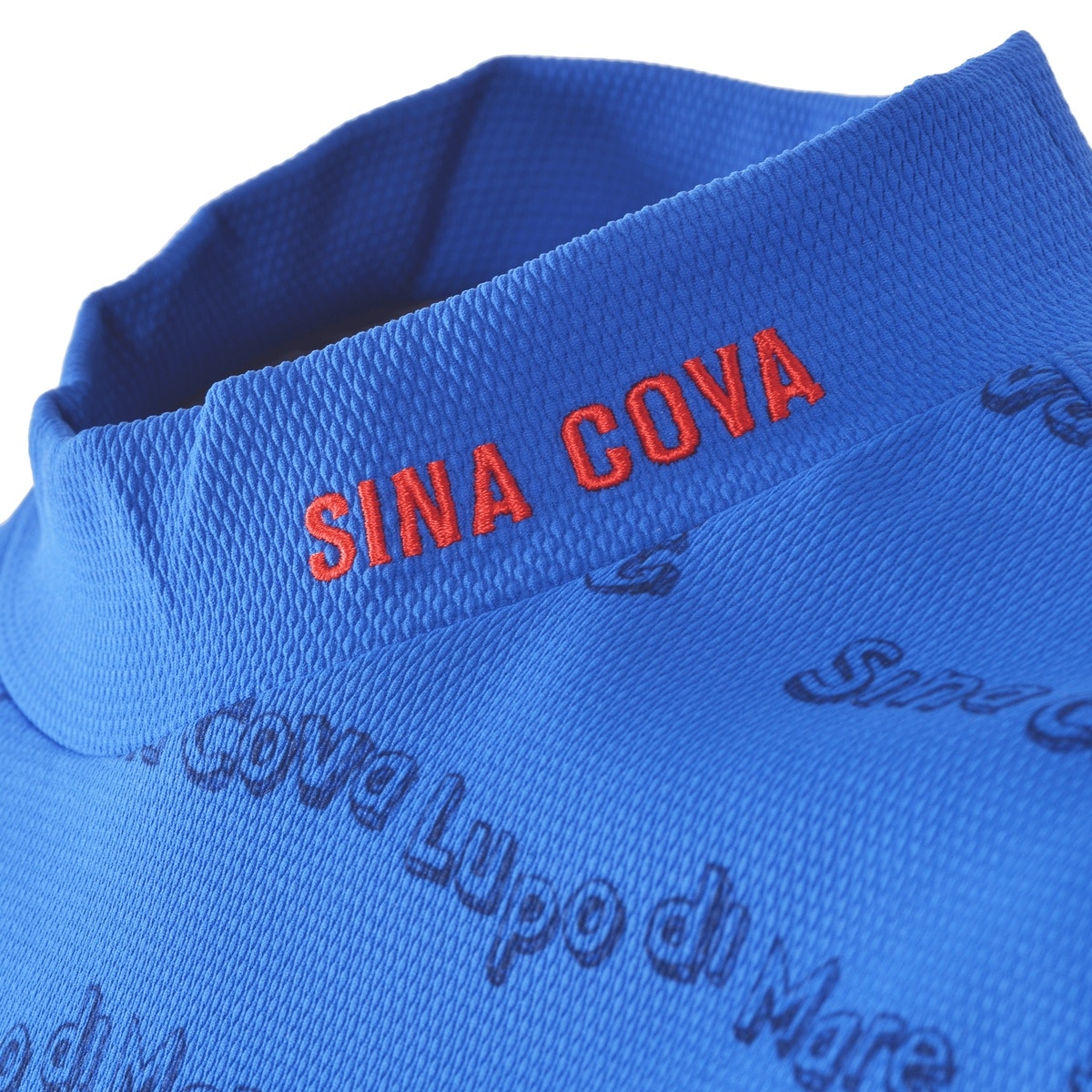 ネックに「SINA COVA」刺繍、総柄で「SINA COVA」「LUPO DI MARE」のプリントを楽譜の音符の様にウェーブで配置したポップなデザインのモックネック半袖Tシャツです。