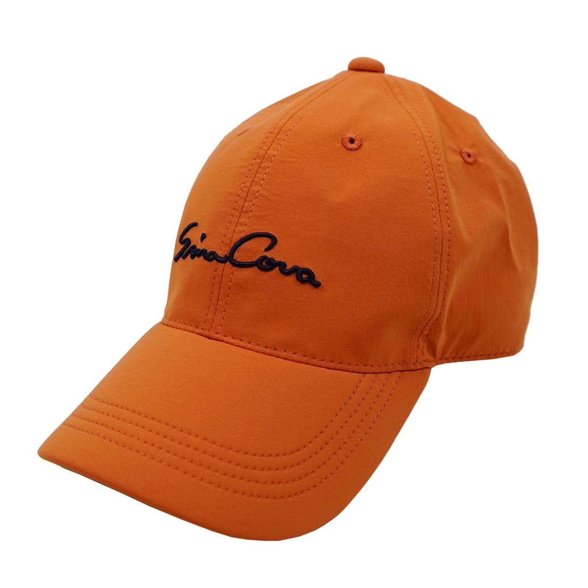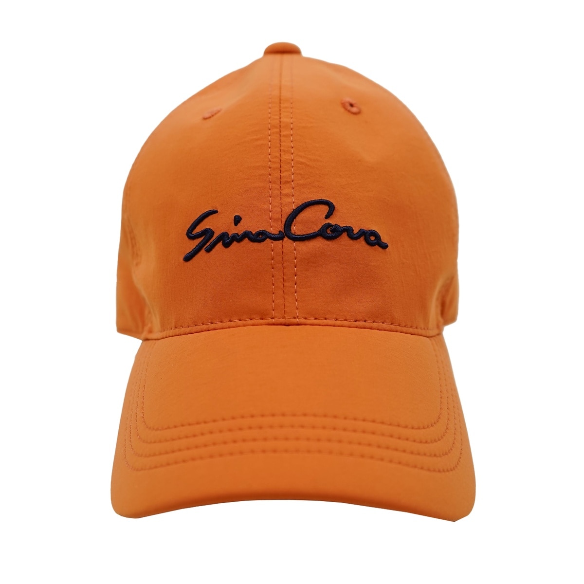 「SINA COVA」筆記体文字刺繍とサイトに「SC」ロゴをプリントでデザインしたラウンディッシュキャップです。