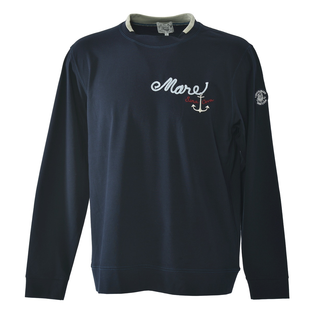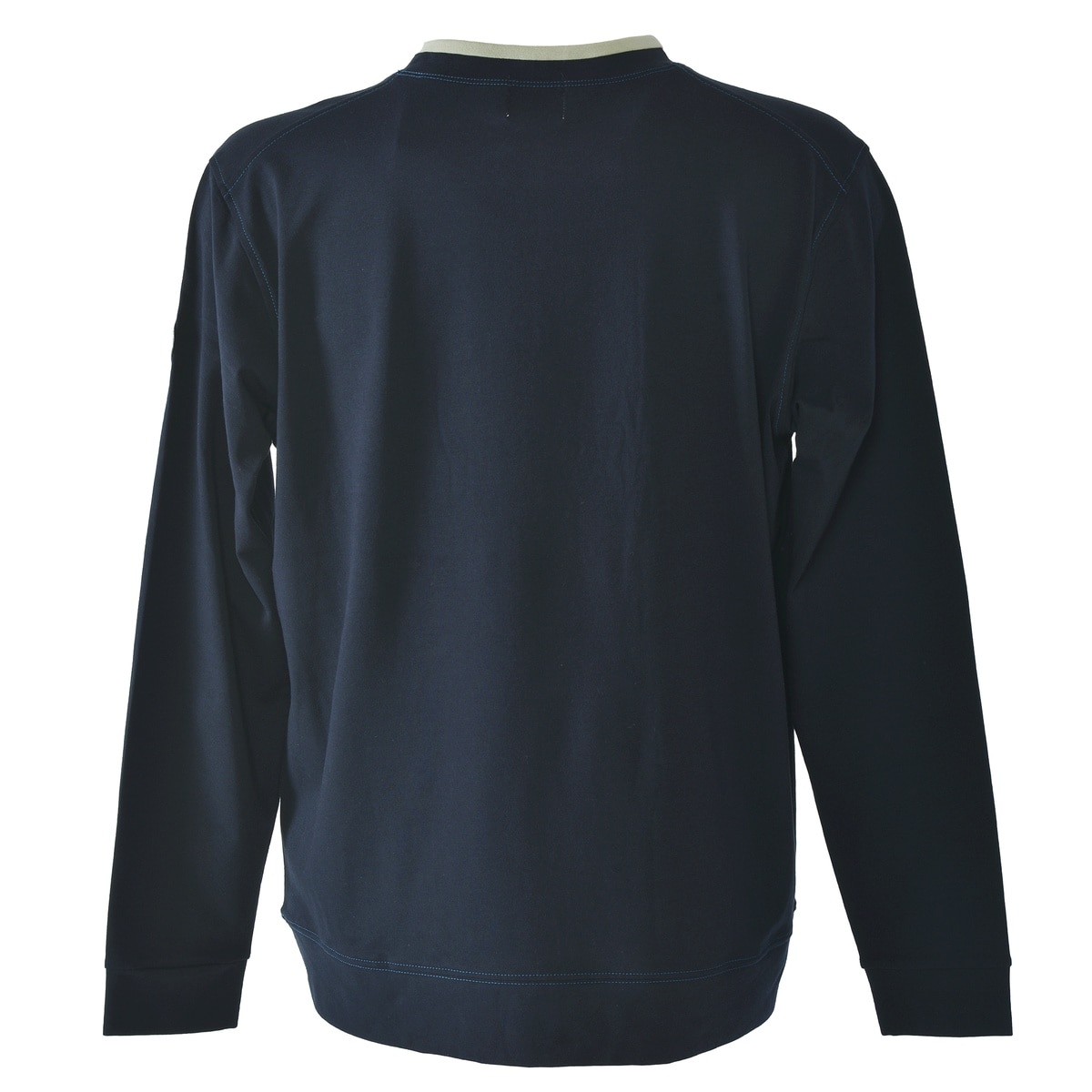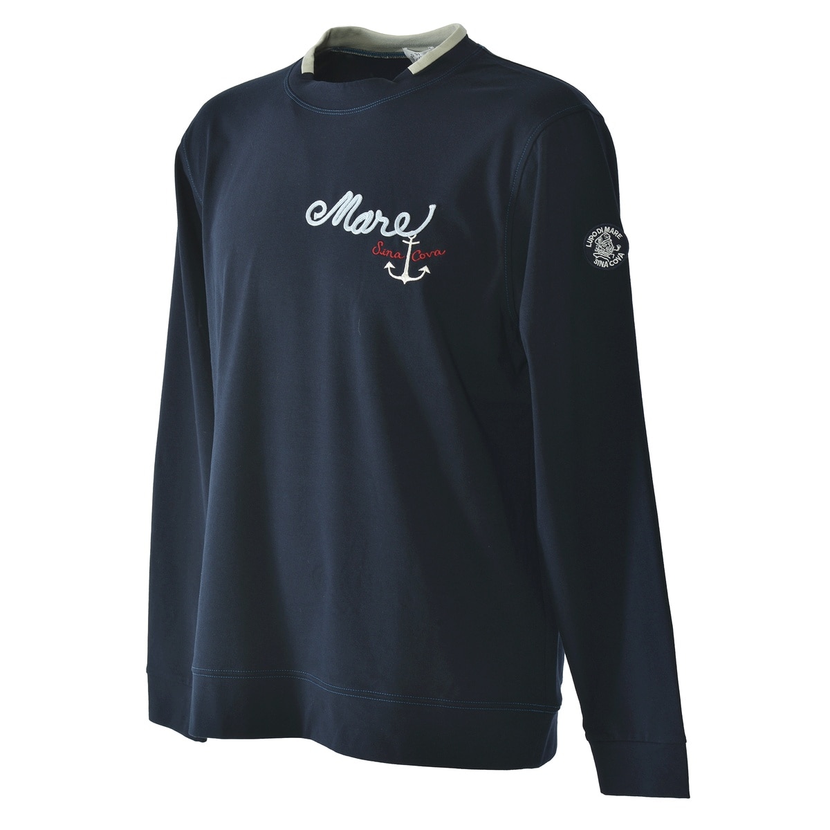 ややスタンドネックの衿を切替の配色でデザインしたシナコバならではのモックネック長袖Tシャツです。