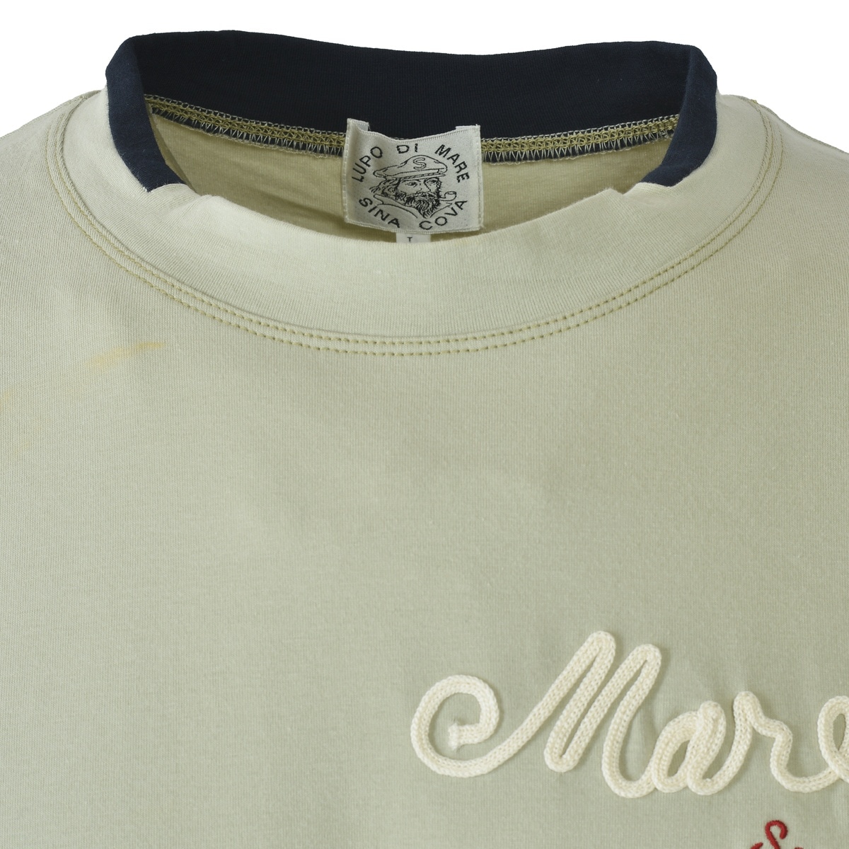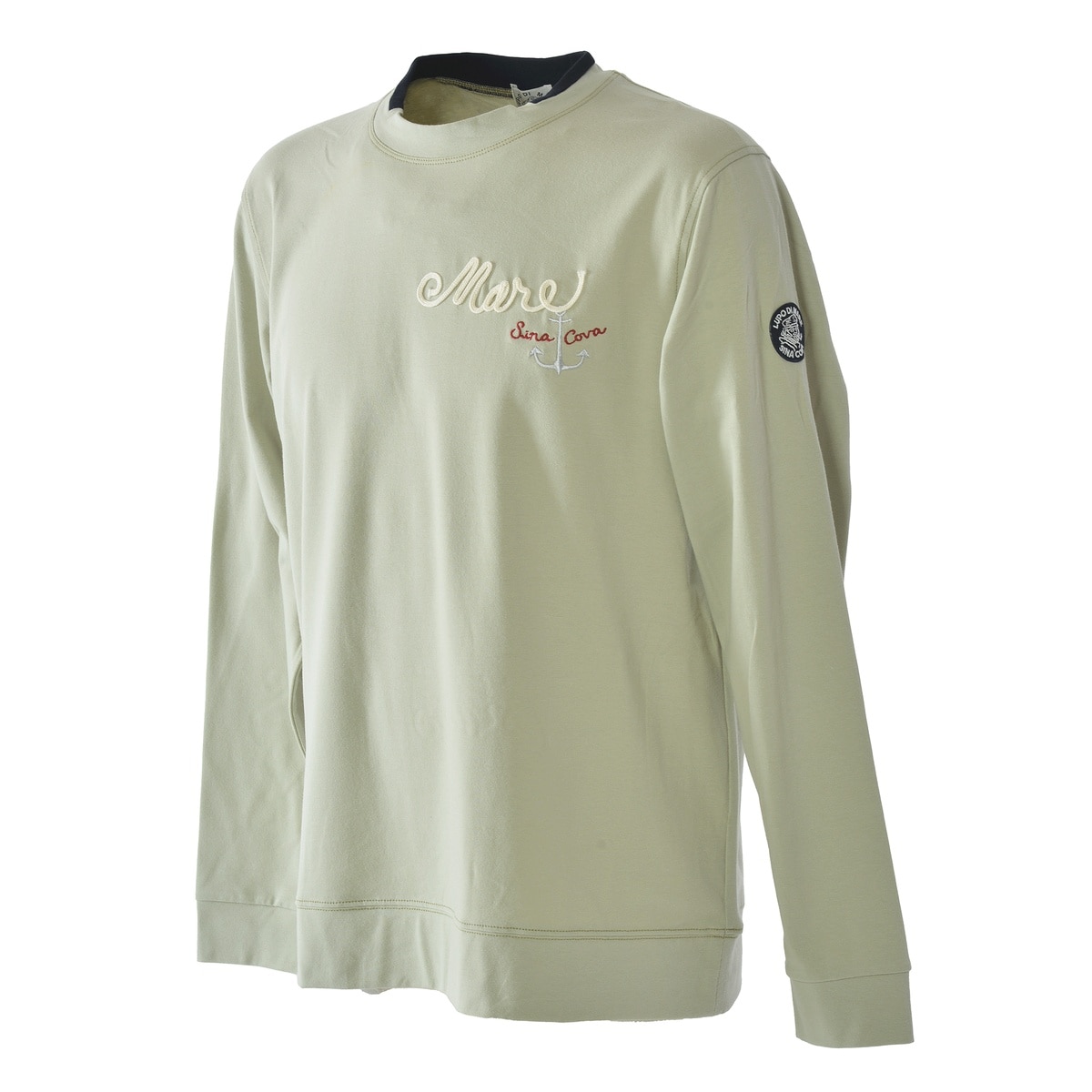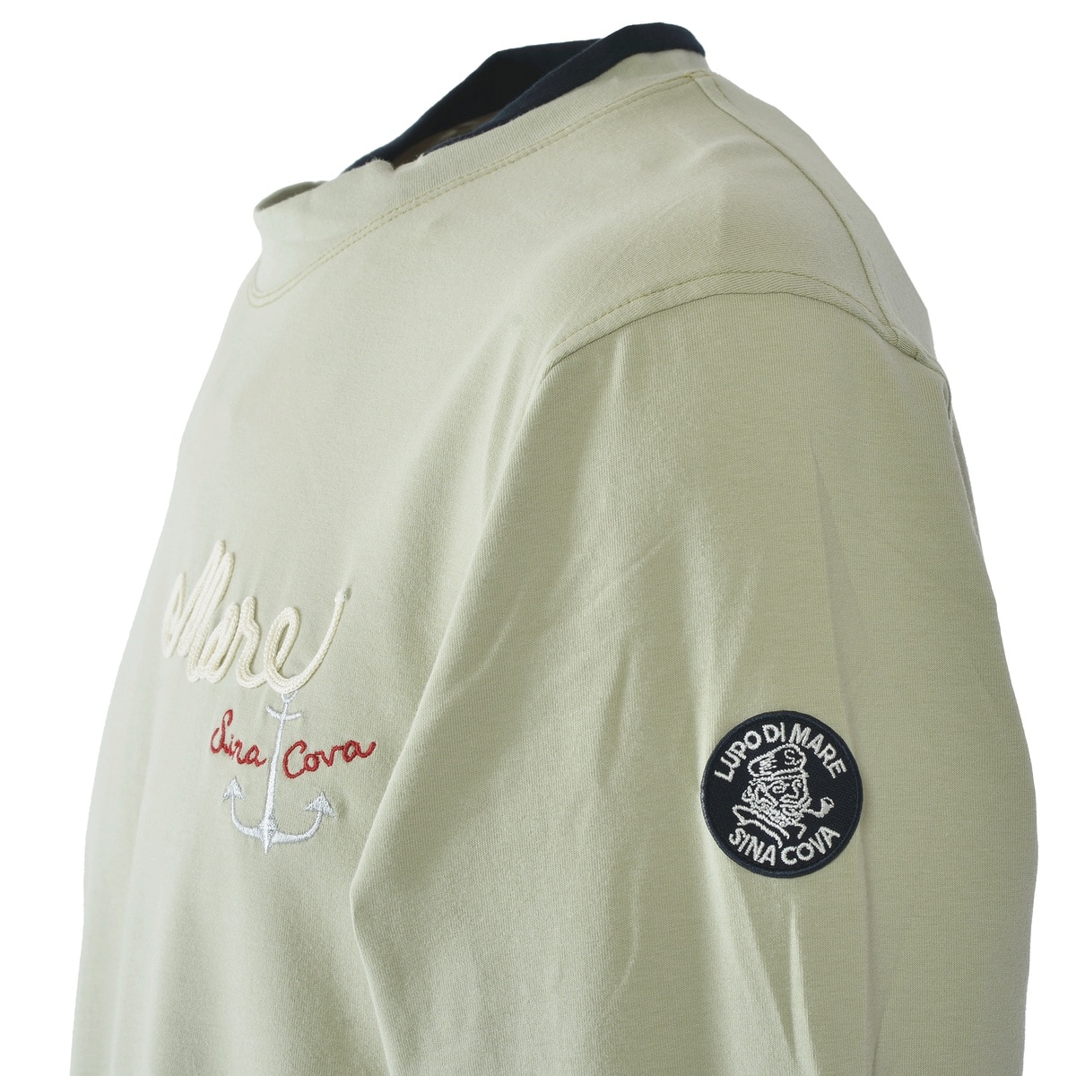 ややスタンドネックの衿を切替の配色でデザインしたシナコバならではのモックネック長袖Tシャツです。
