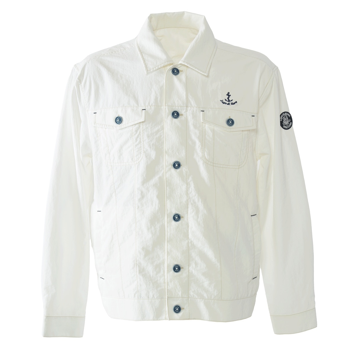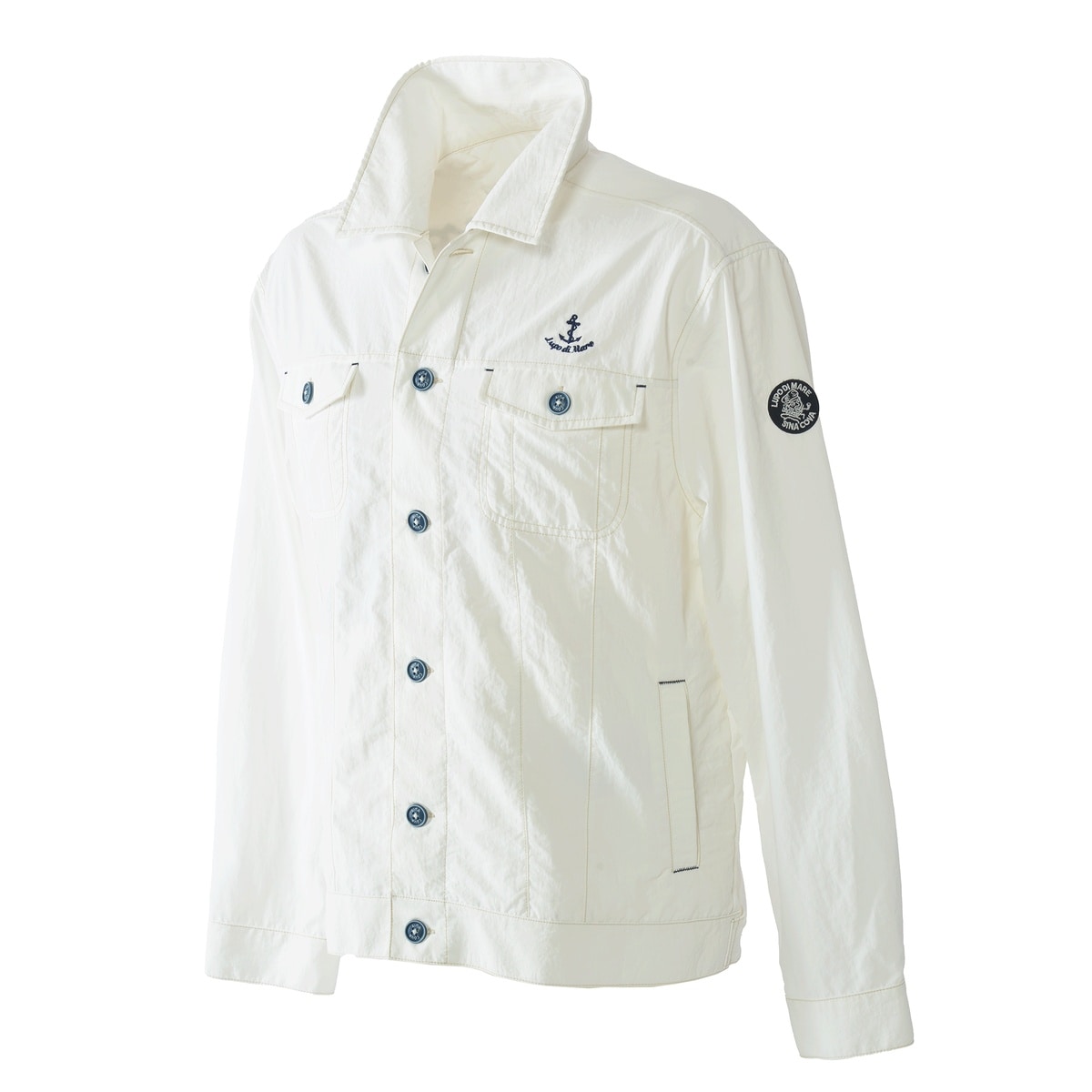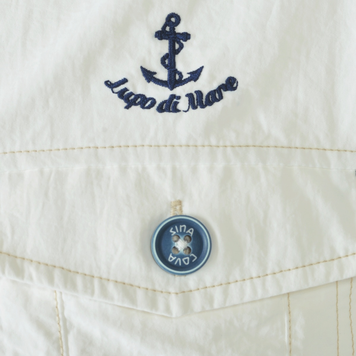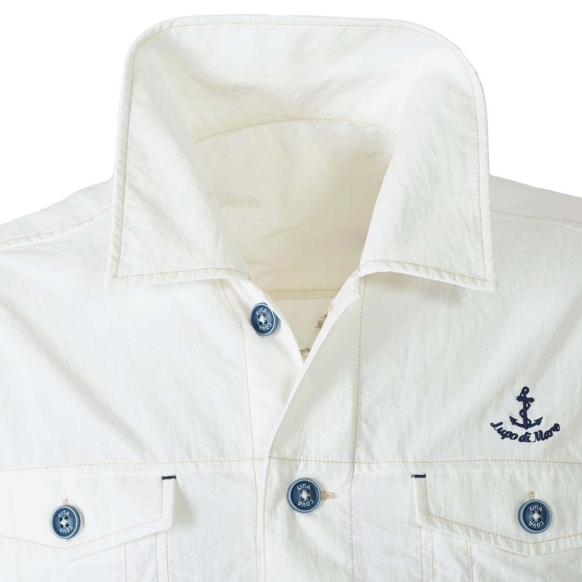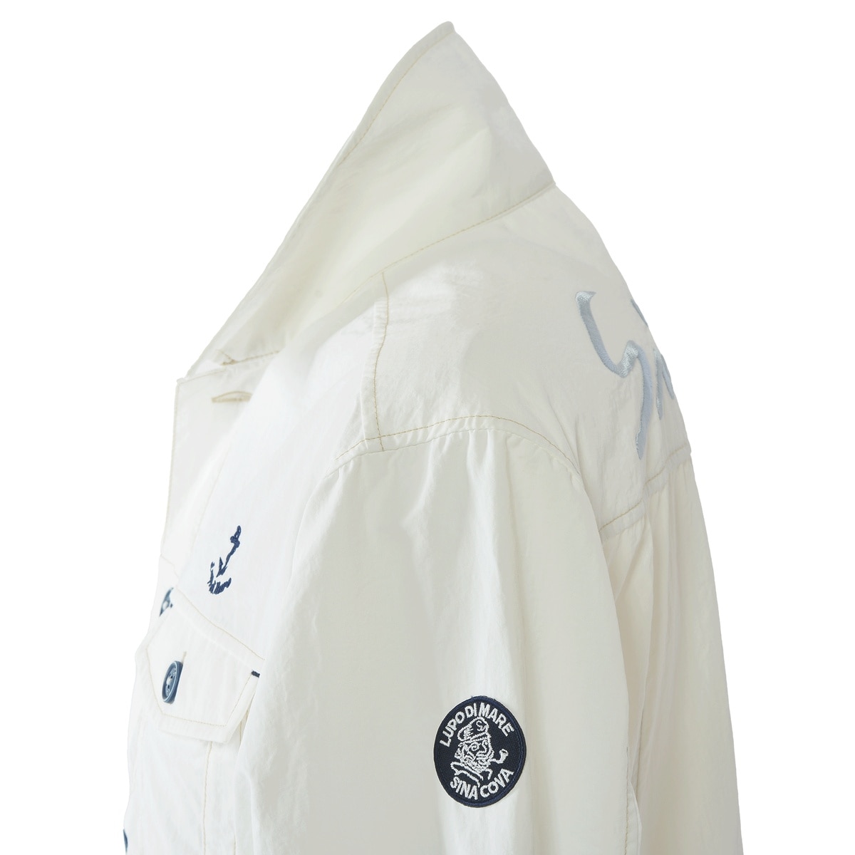 左胸にマリンモチーフのアンカーとロゴの刺繍、背ヨークに同系色のSINA COVA筆記体ロゴ刺繍をあしらい、洗練されたディテールを表現。