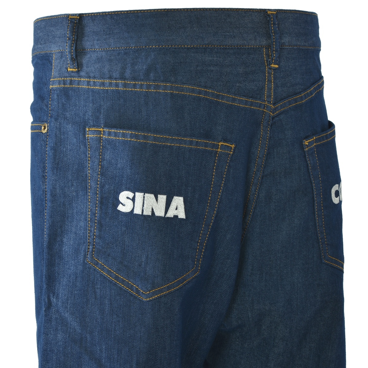 後ろポケットに左右でSINA COVAロゴ刺繍をあしらい、洗練されたディテールを表現。標準サイズの設定により、自然なフィット感を提供し、幅広い体型に対応します。